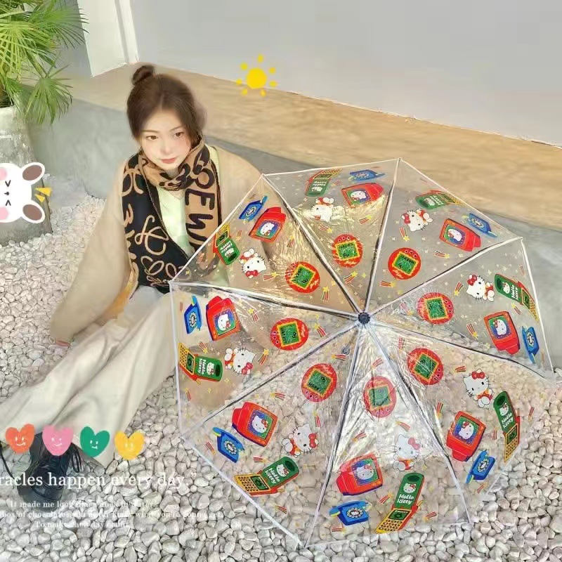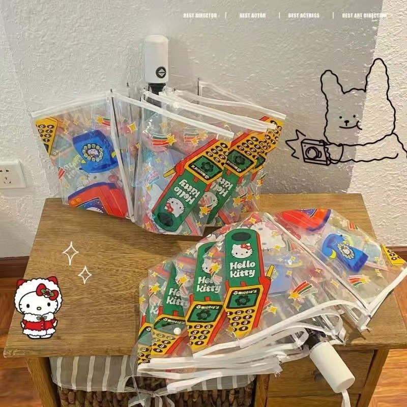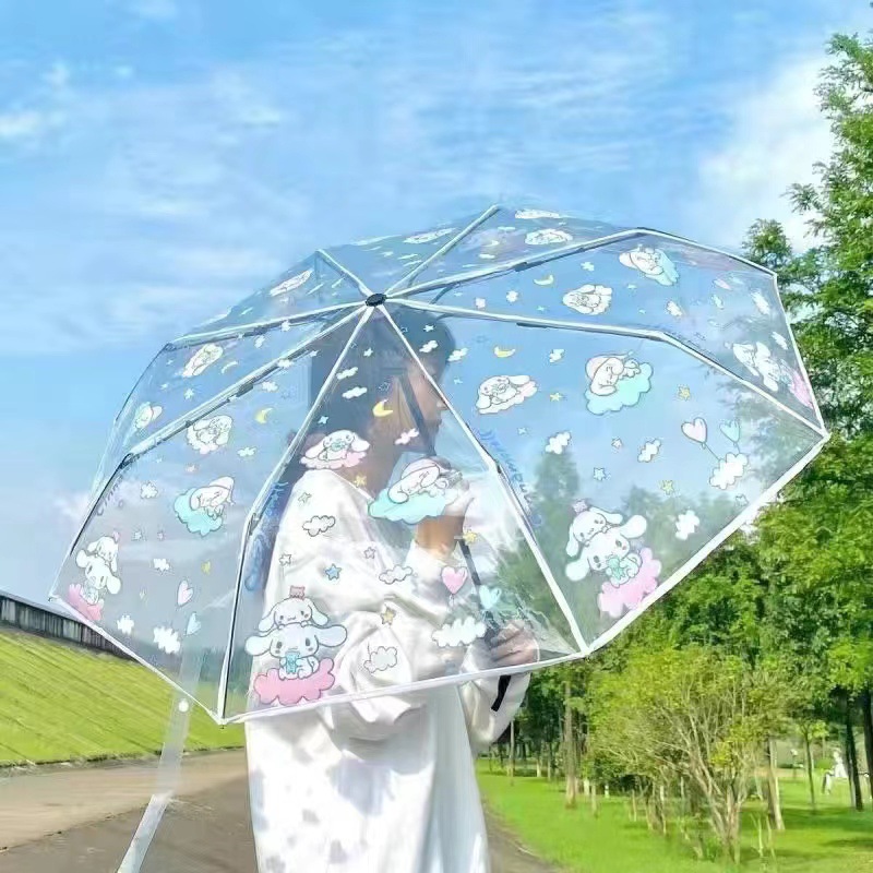 스티치 풀 자동 투명 우산 만화 애니메이션 온라인 축하 접기 3 배 우산 햇빛 검은 접착제 우산 학생들을위한