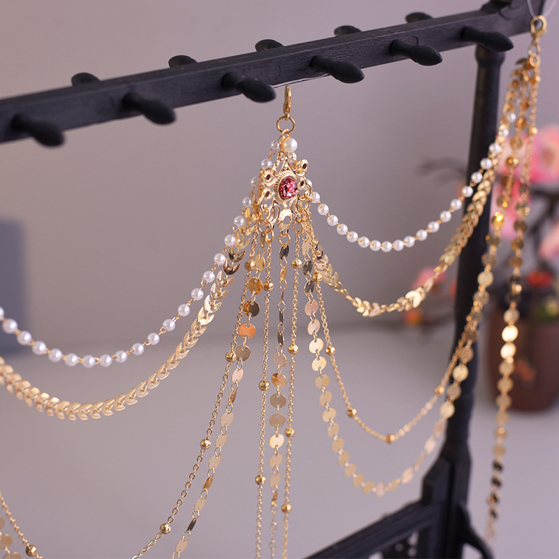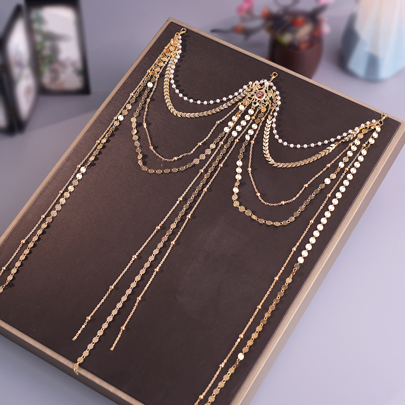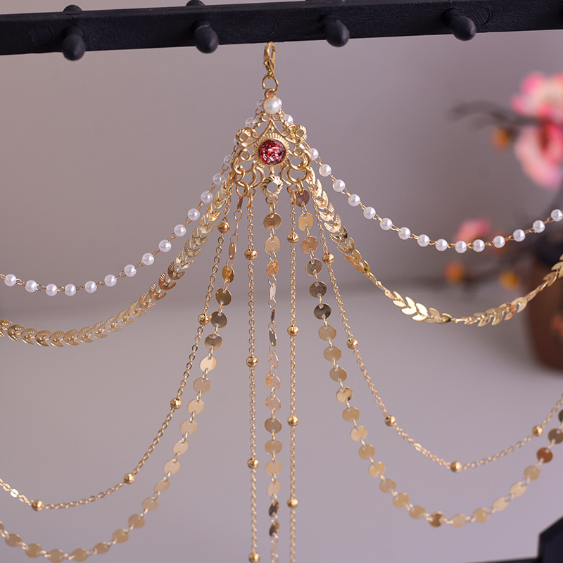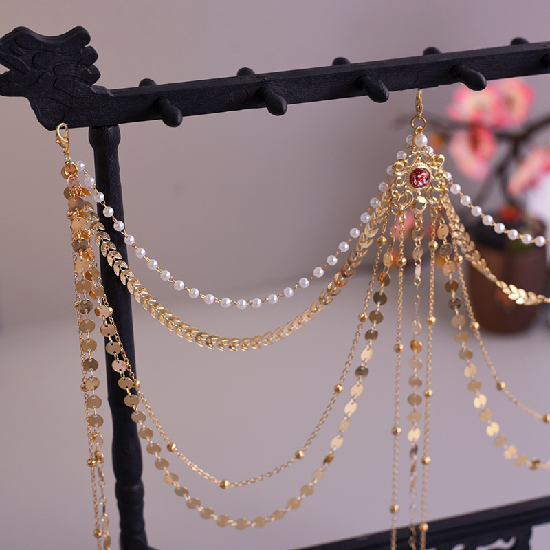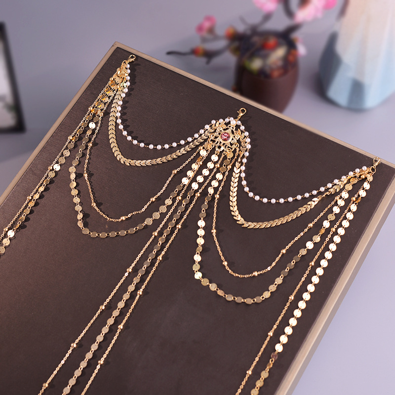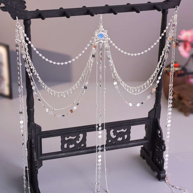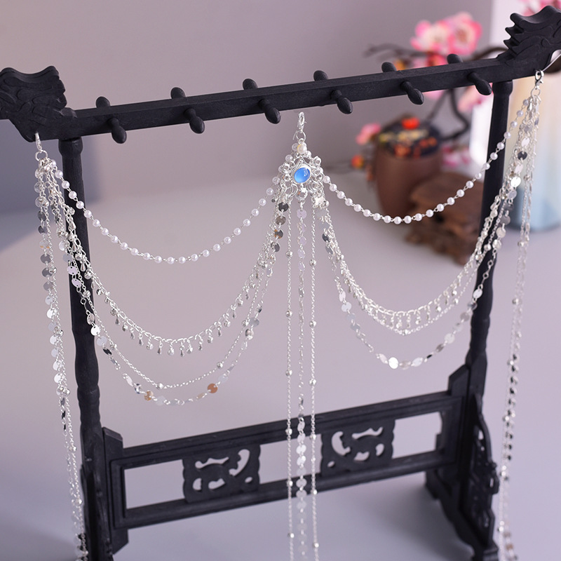 한푸 실버 허리 체인 허리 펜던트 골동품 스타일 압력 플랩 압력 진주 다목적 긴 술 장식 액세서리