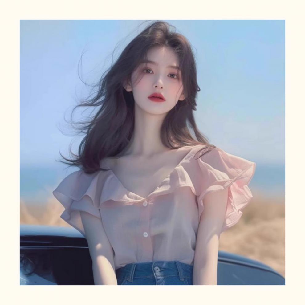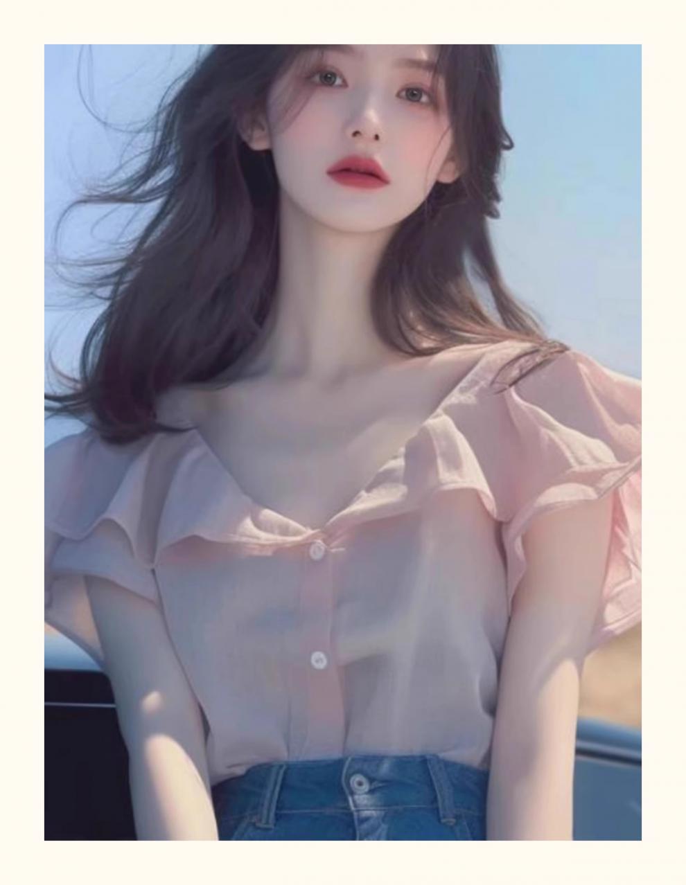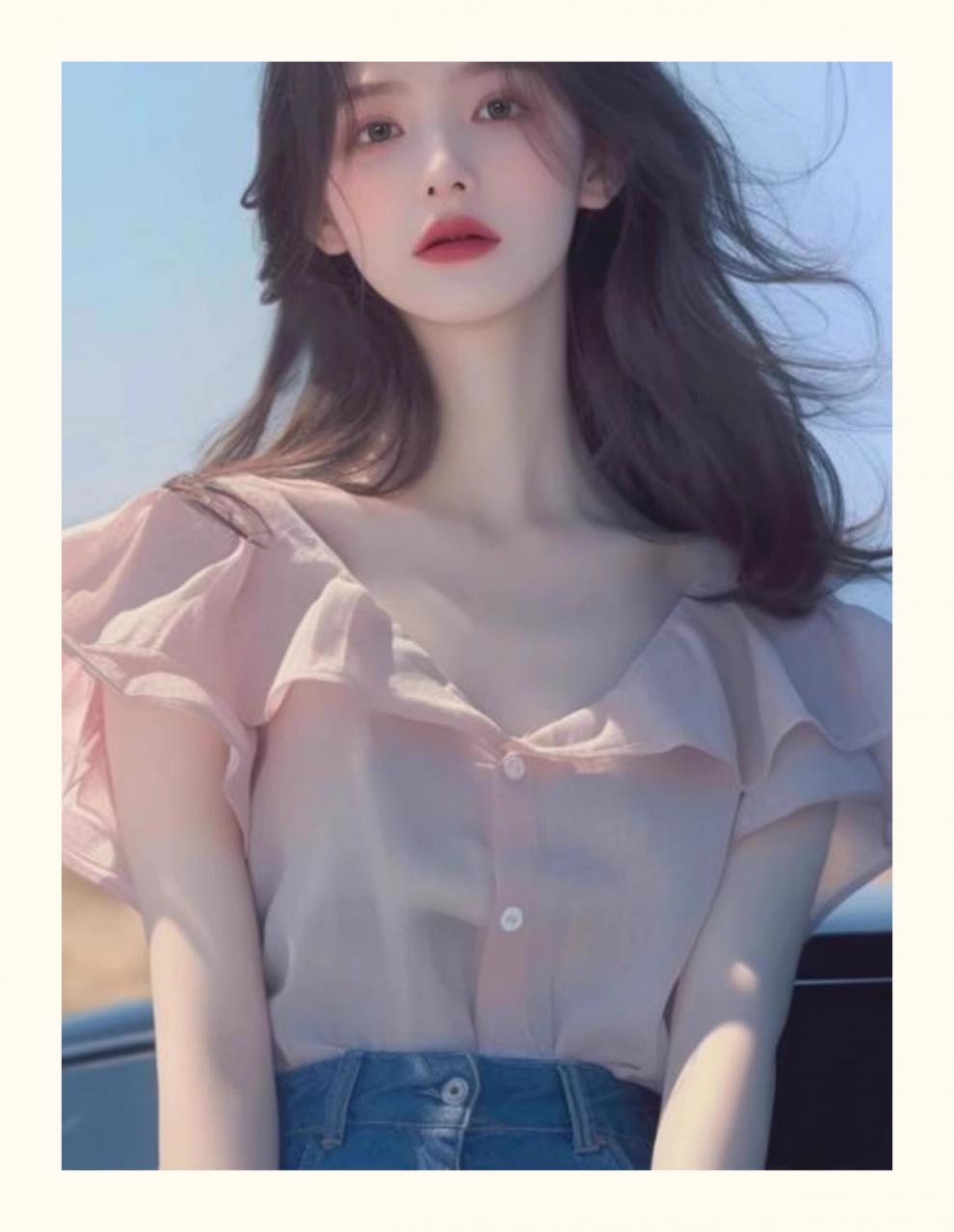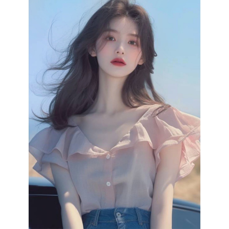 올해 인기있는 아름다운 쉬폰 셔츠 여성 틈새 독특한 세련된 한국 달콤한 핑크 프릴 V 넥 셔츠
