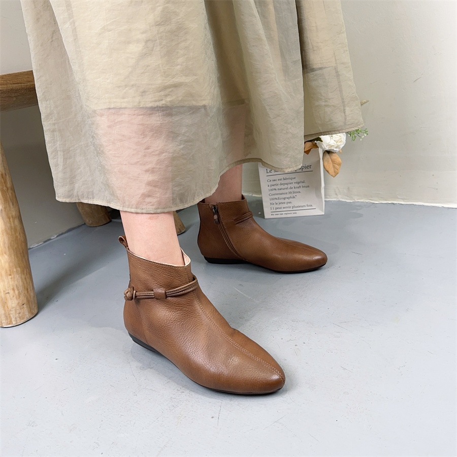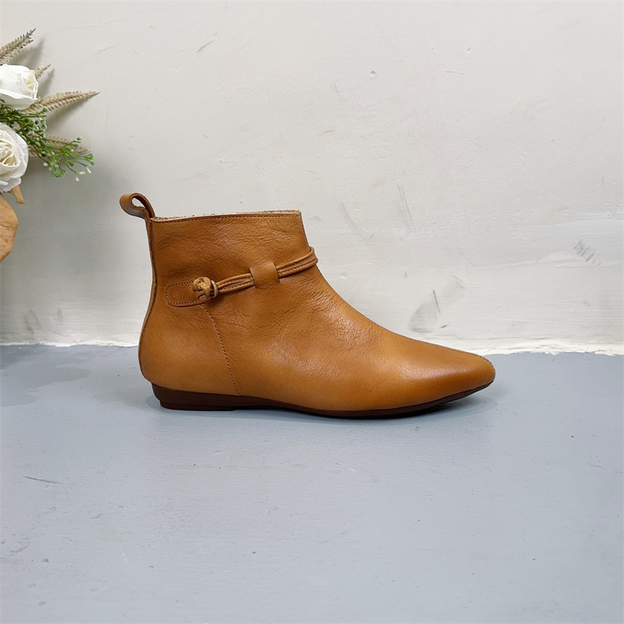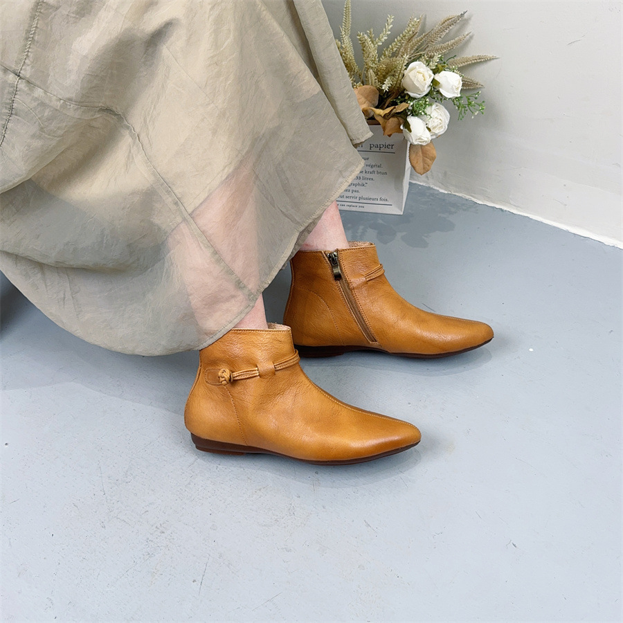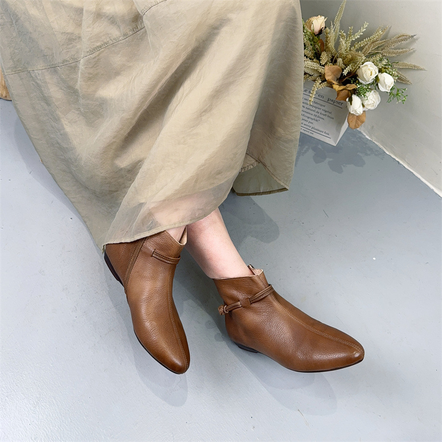 2024 새로운 빈티지 포인팅 쇼트 부츠 사이드 지퍼 여성용 플랫 뉴 싱글 부츠 정품 가죽 부츠