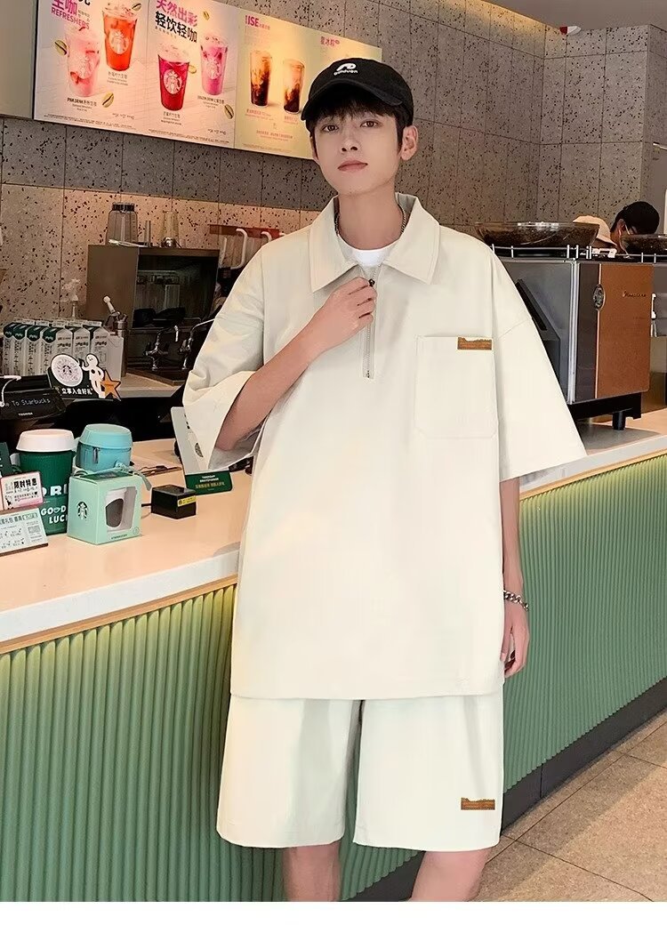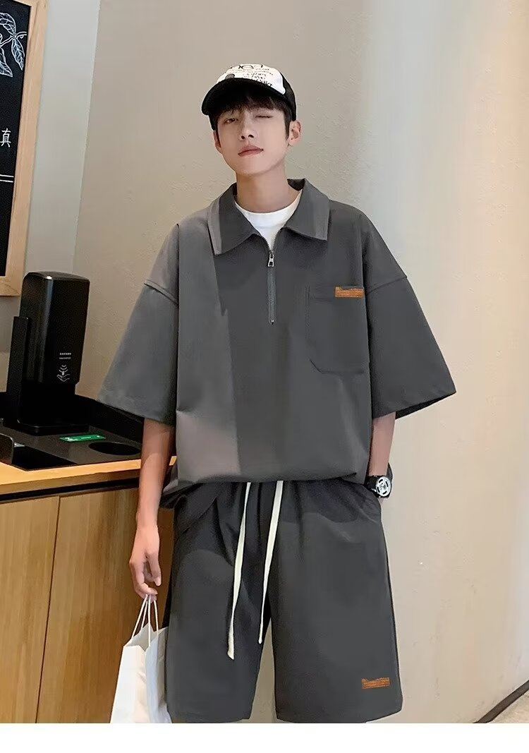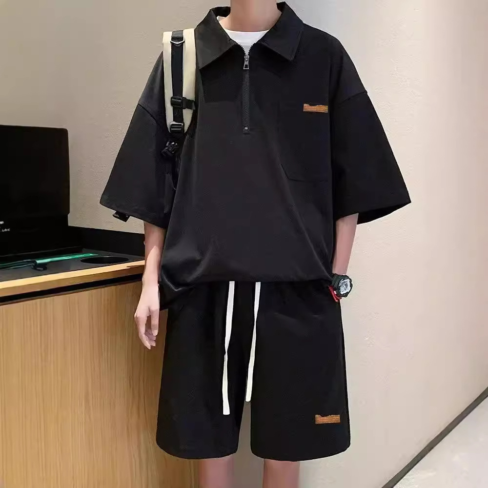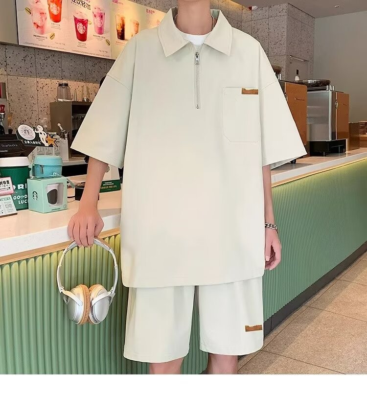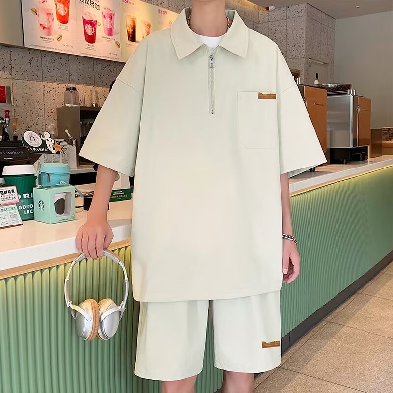 하프 지퍼 폴로 셔츠 남자 2024 여름 새로운 아이스 실크 패션 브랜드 느슨한 캐주얼 짧은 소매 반바지 스포츠 세트