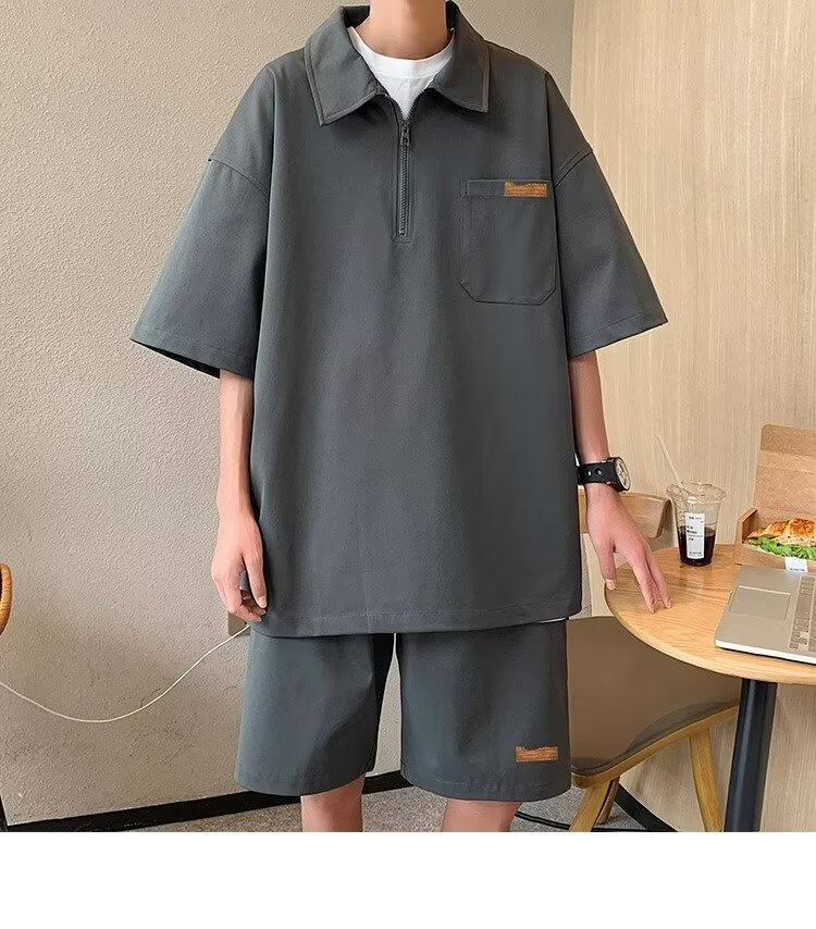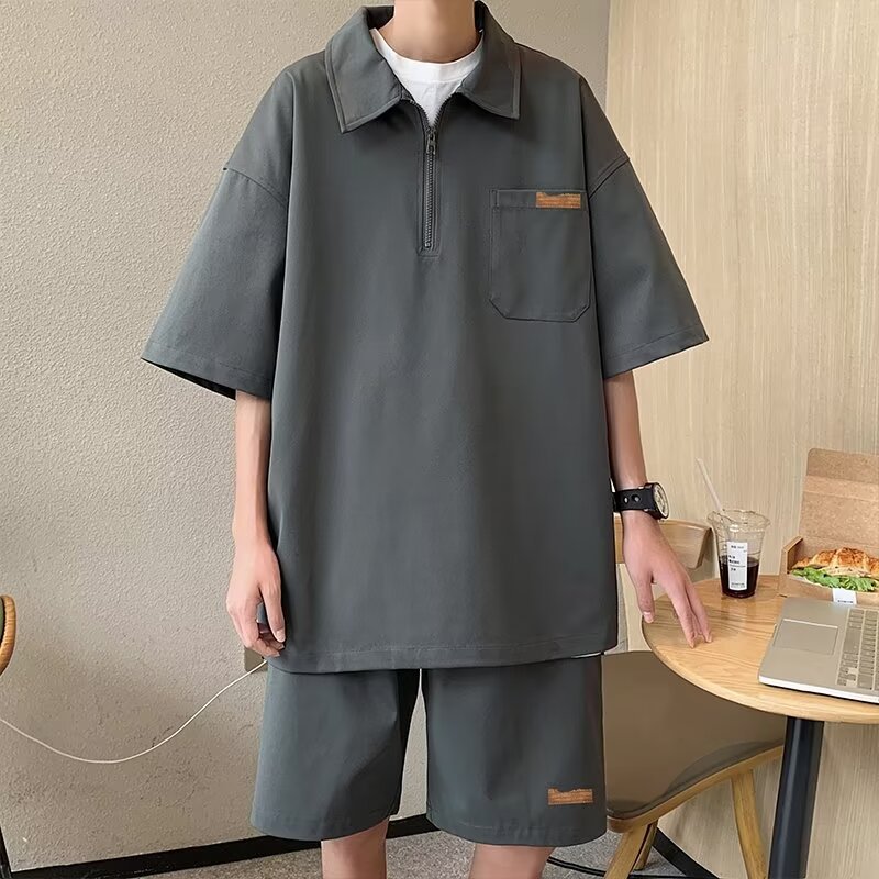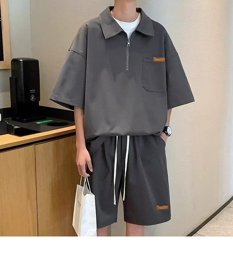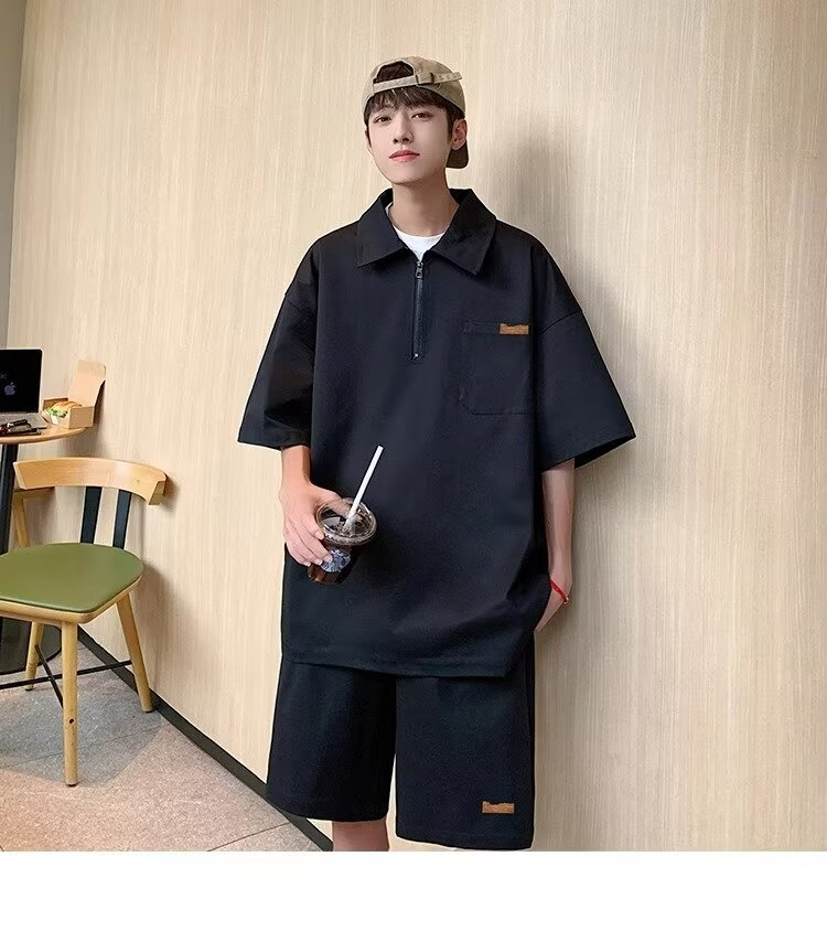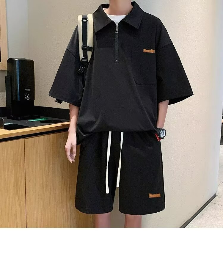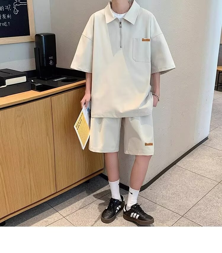 하프 지퍼 폴로 셔츠 남자 2024 여름 새로운 아이스 실크 패션 브랜드 느슨한 캐주얼 짧은 소매 반바지 스포츠 세트