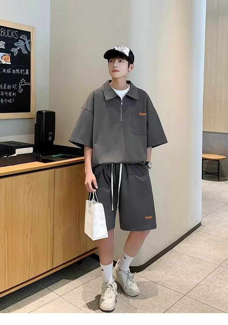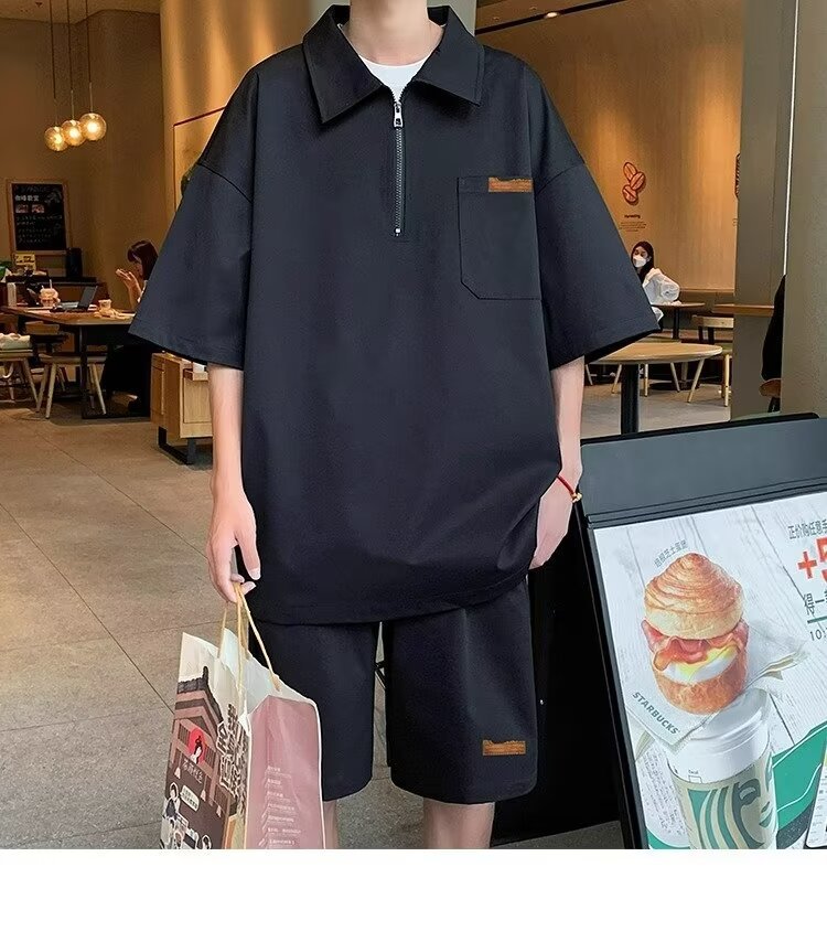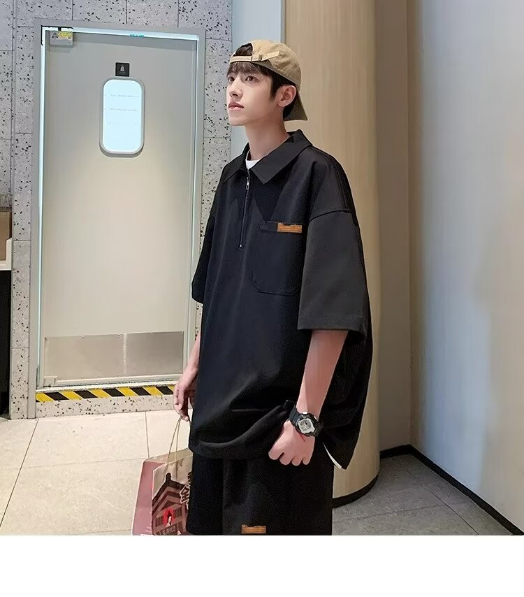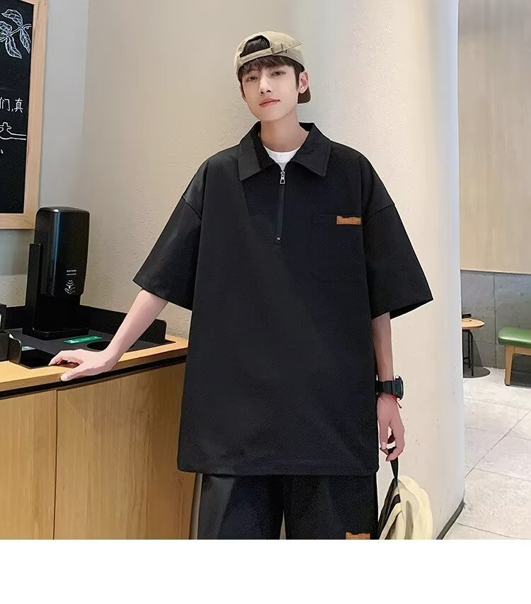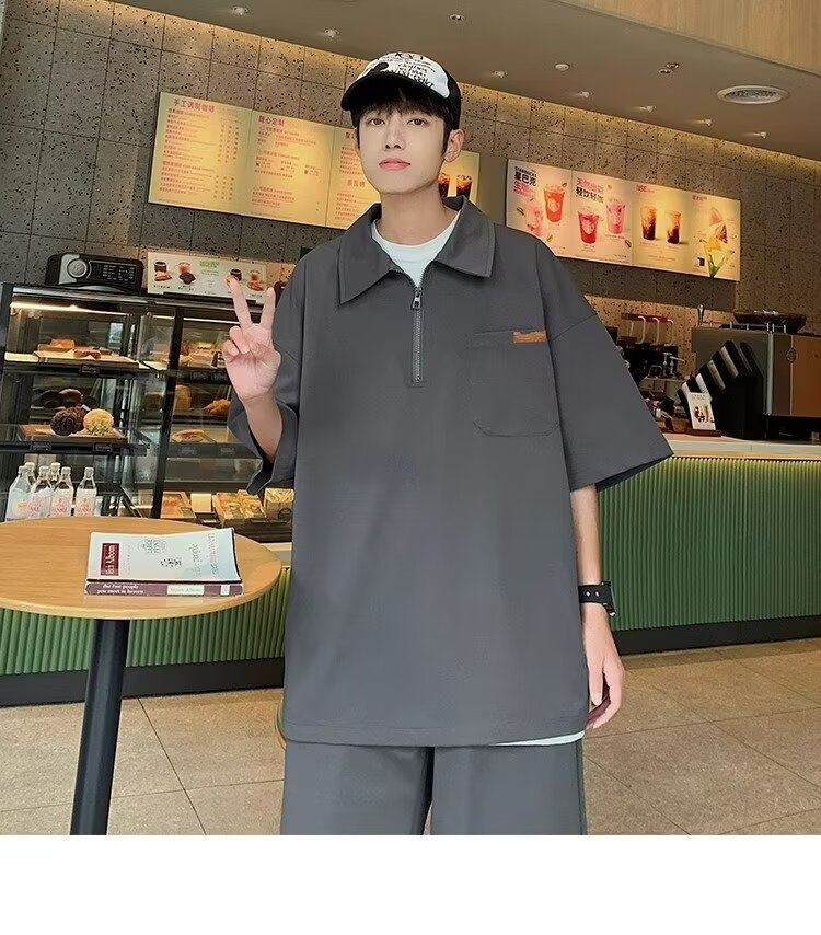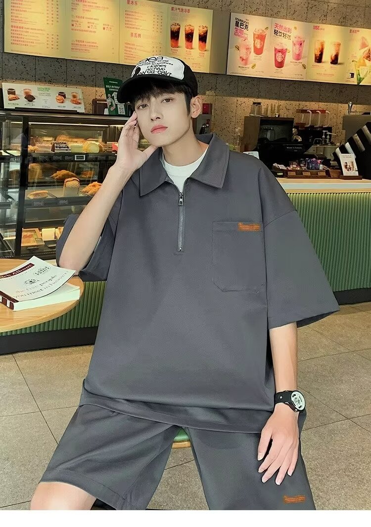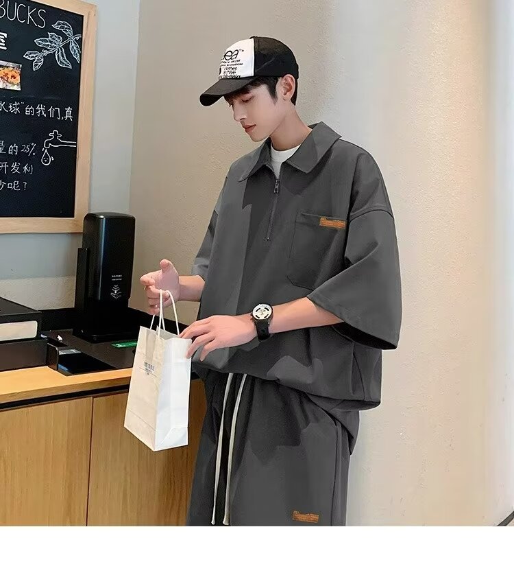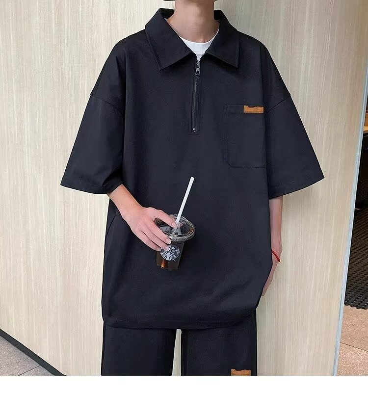 하프 지퍼 폴로 셔츠 남자 2024 여름 새로운 아이스 실크 패션 브랜드 느슨한 캐주얼 짧은 소매 반바지 스포츠 세트스토어 가기