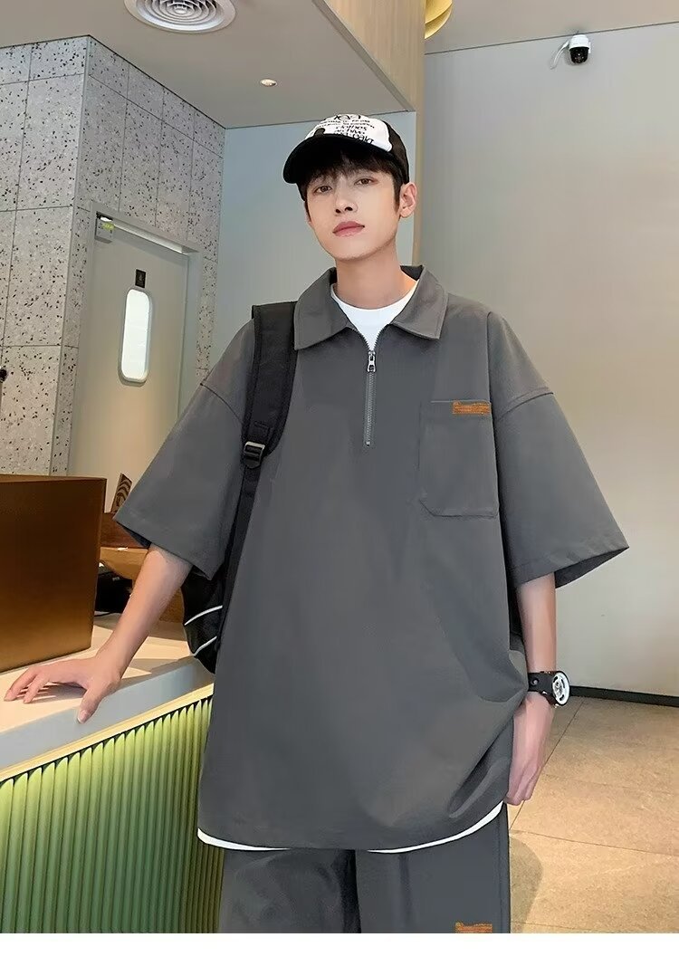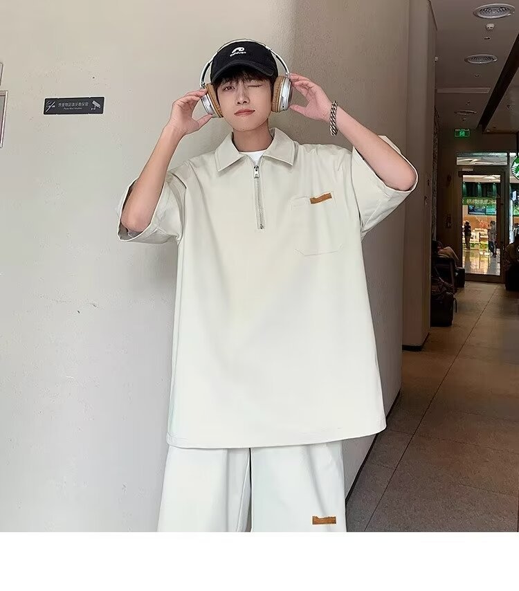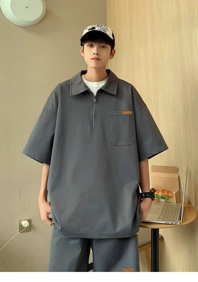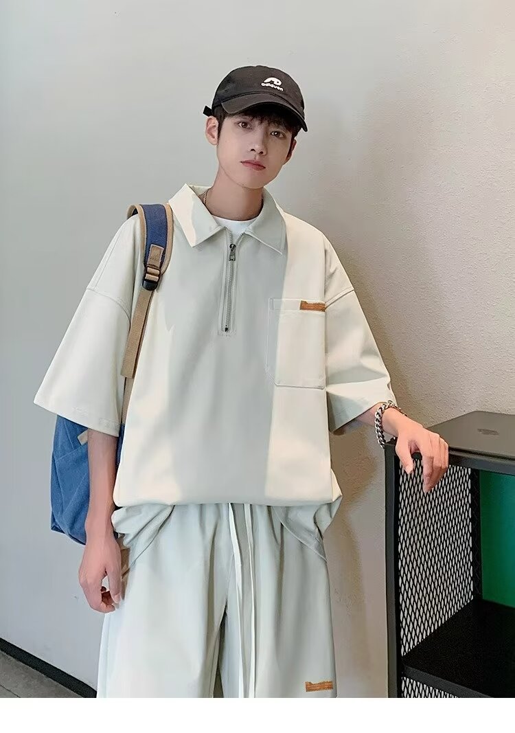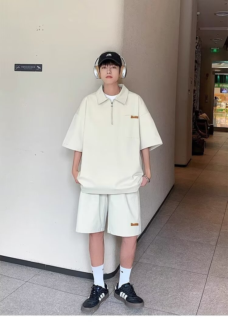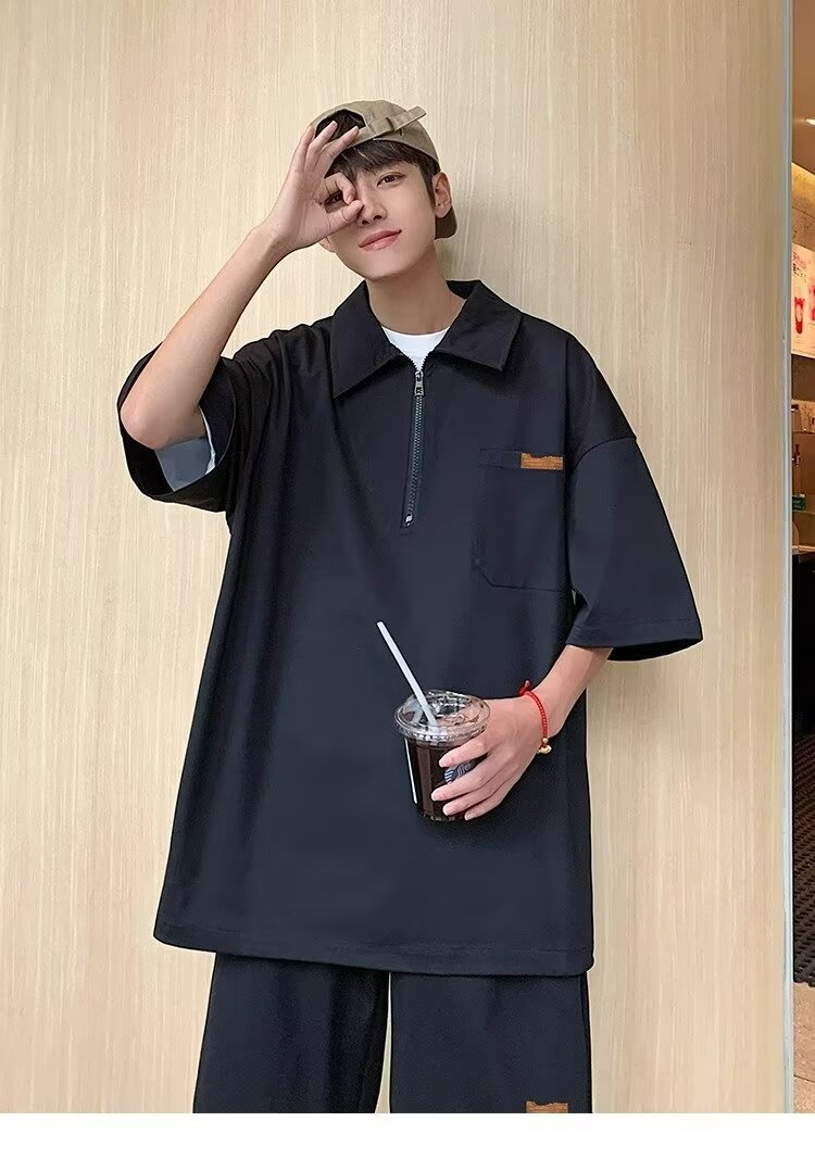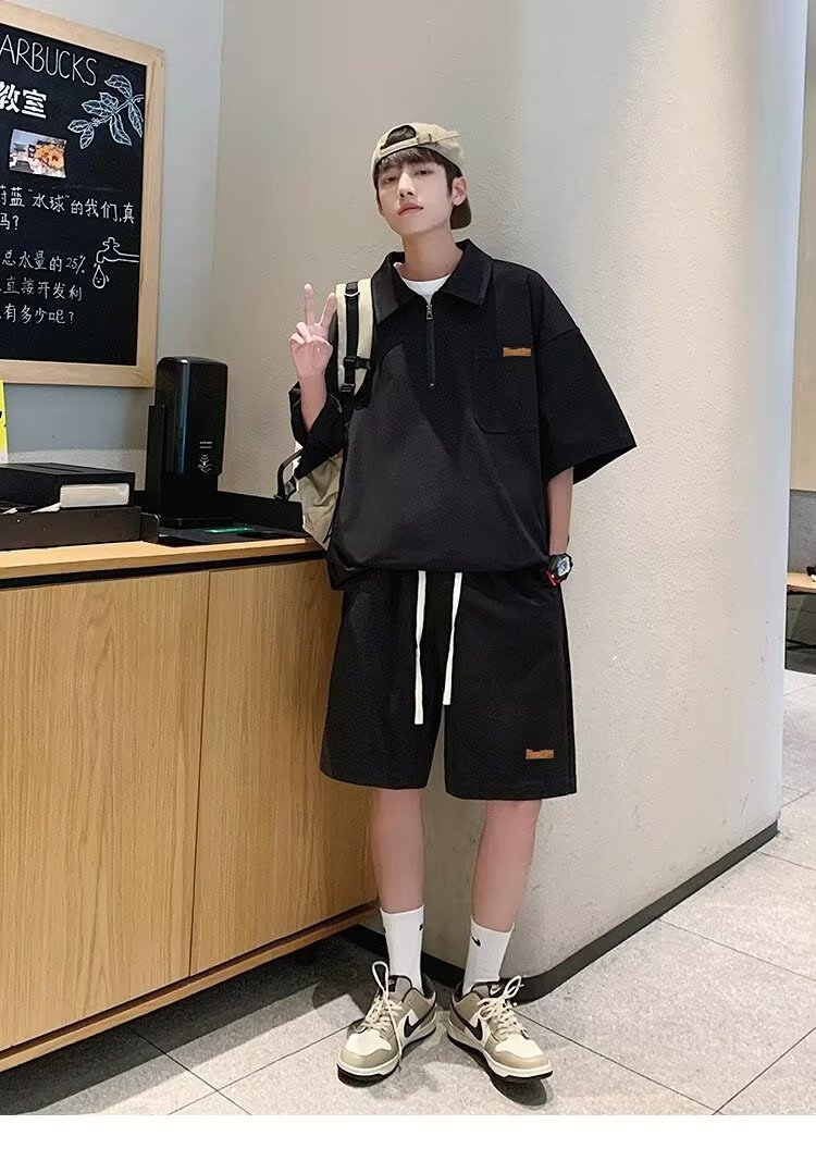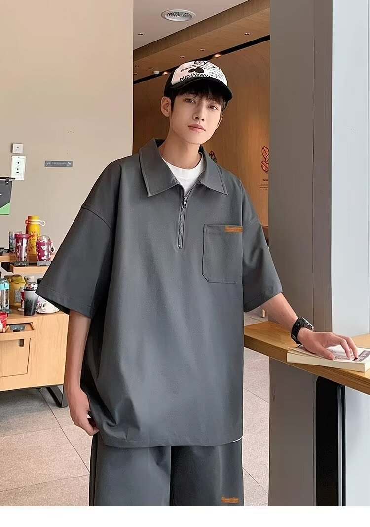 하프 지퍼 폴로 셔츠 남자 2024 여름 새로운 아이스 실크 패션 브랜드 느슨한 캐주얼 짧은 소매 반바지 스포츠 세트스토어 가기