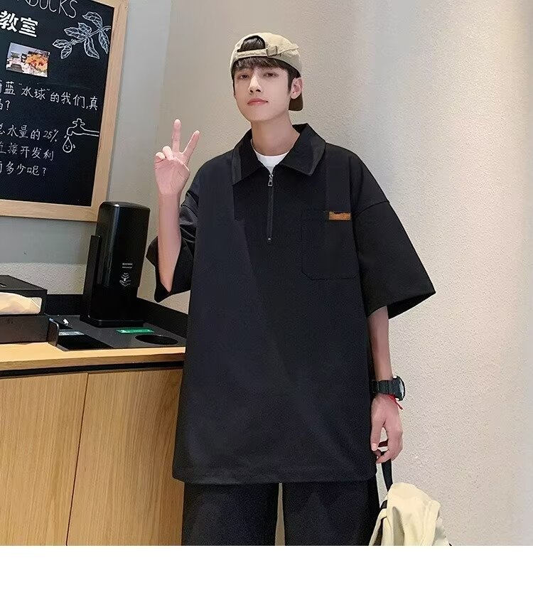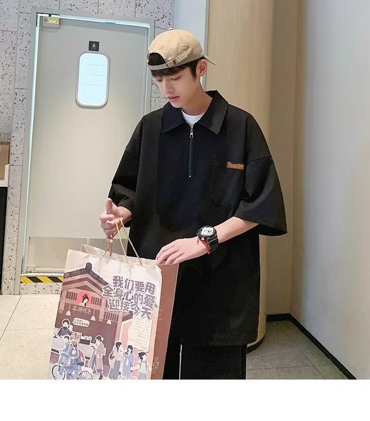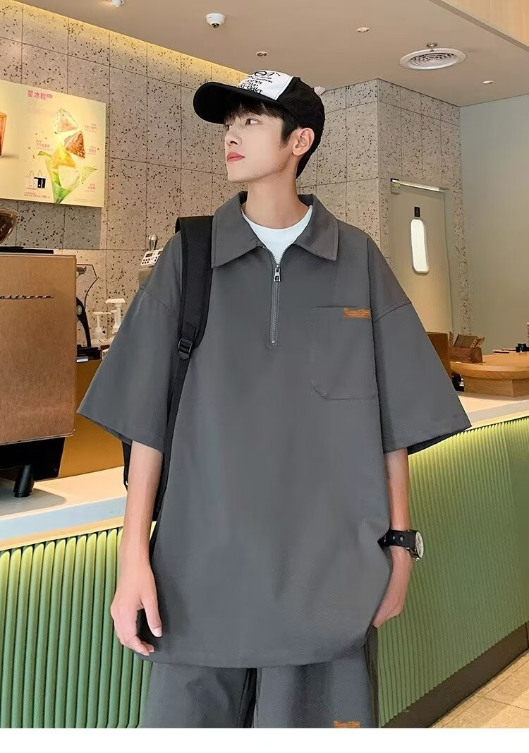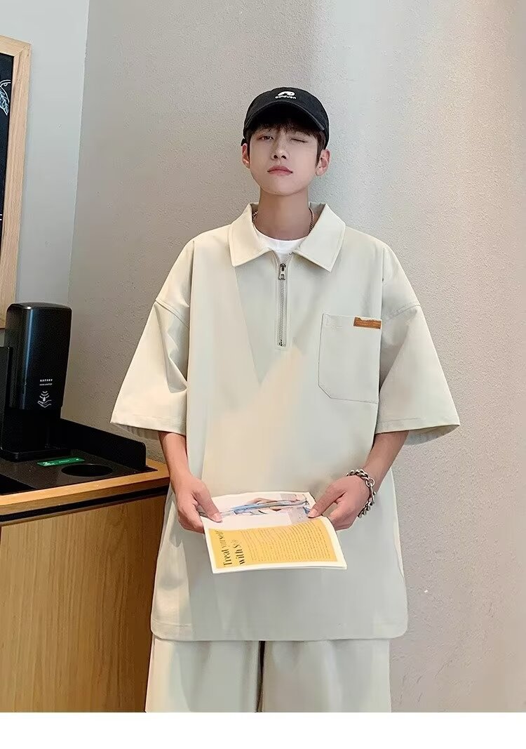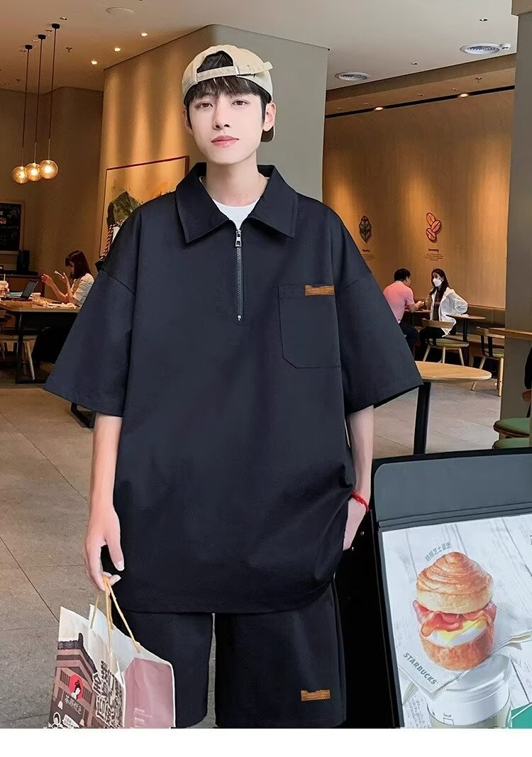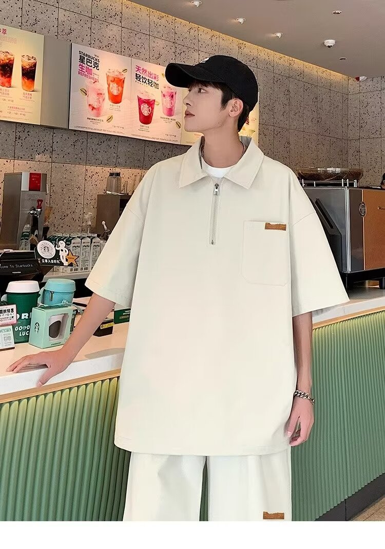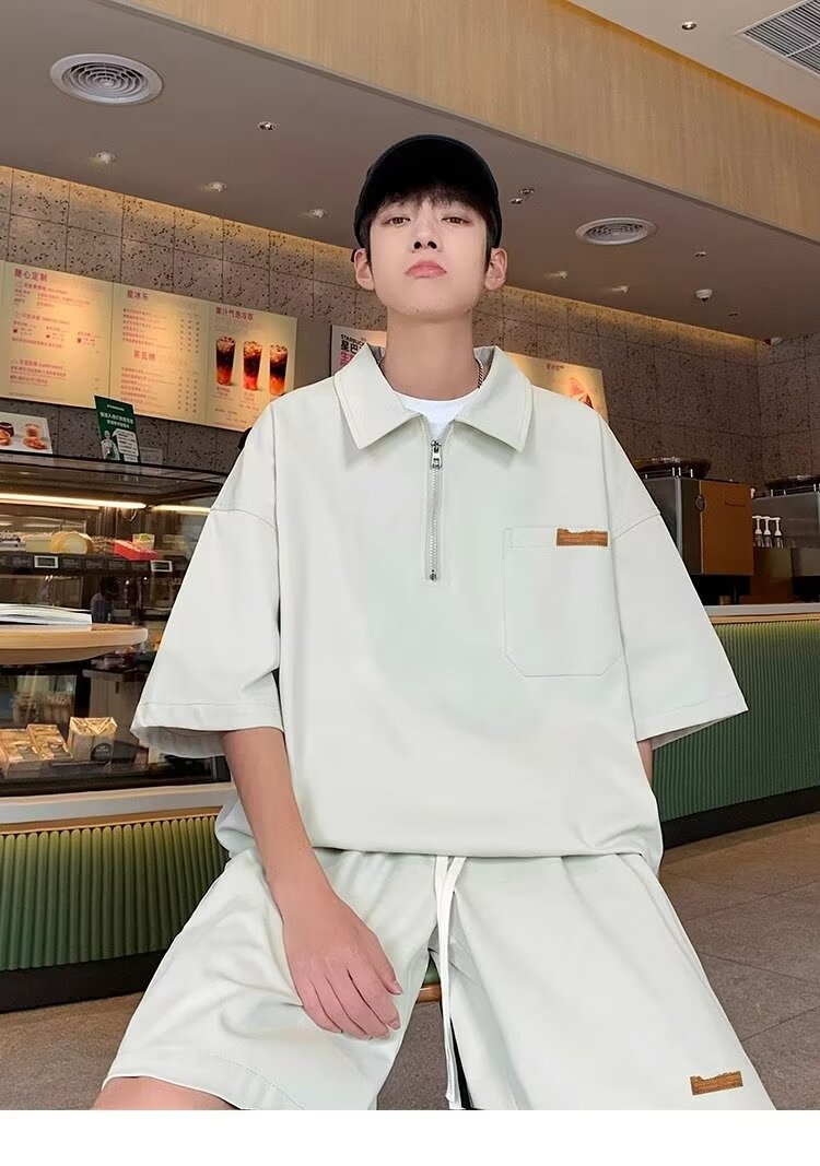 하프 지퍼 폴로 셔츠 남자 2024 여름 새로운 아이스 실크 패션 브랜드 느슨한 캐주얼 짧은 소매 반바지 스포츠 세트스토어 가기