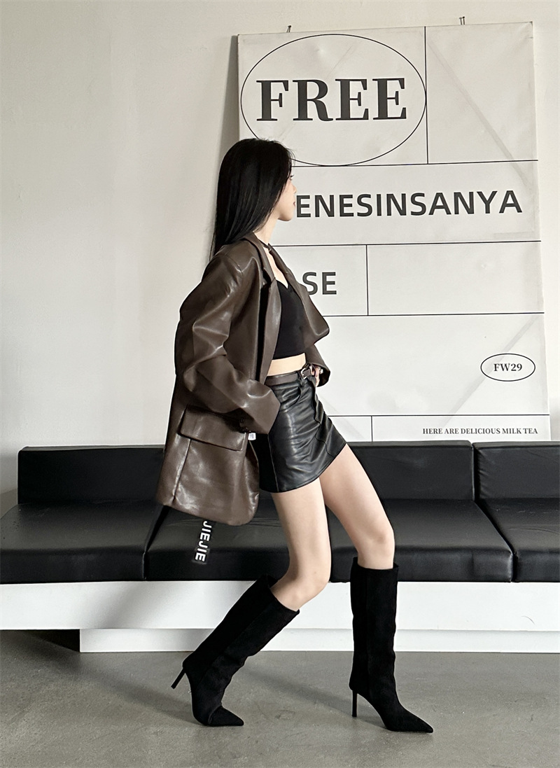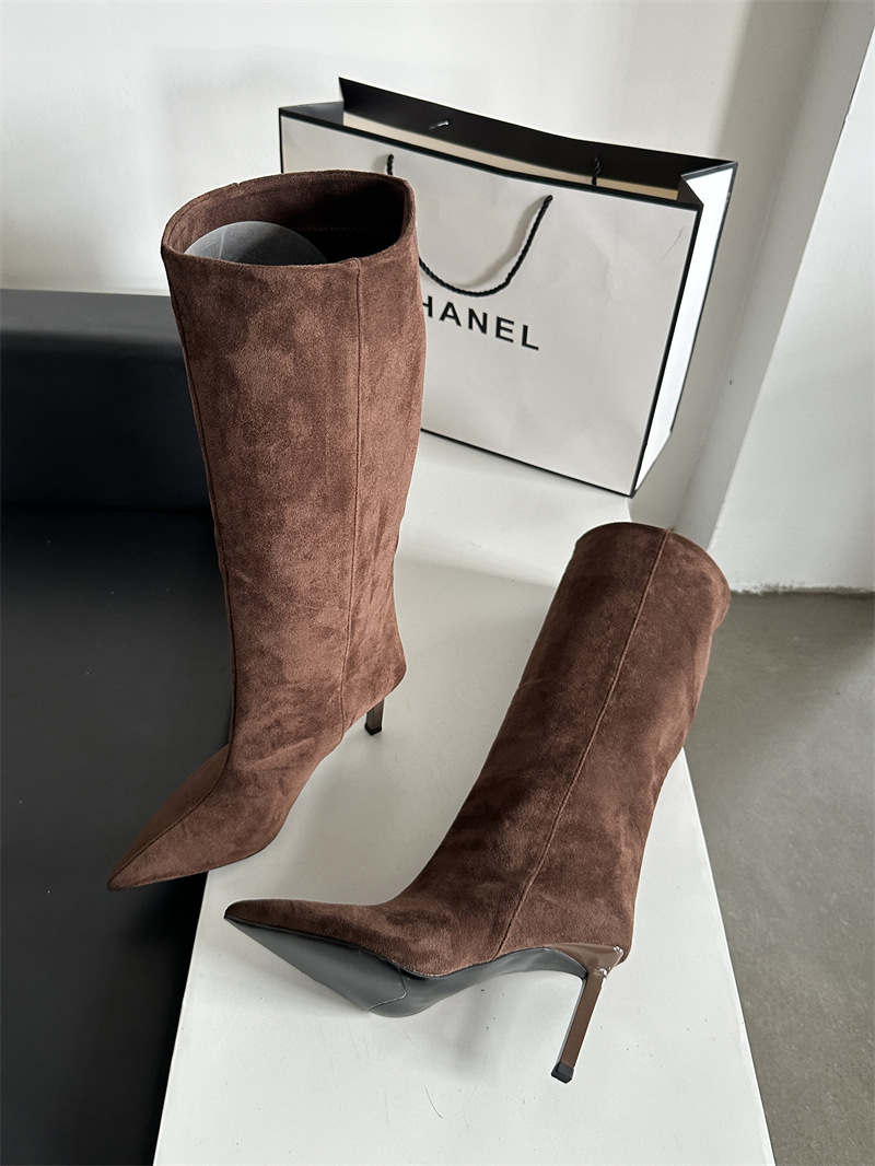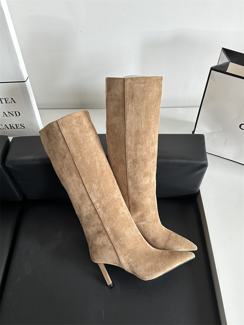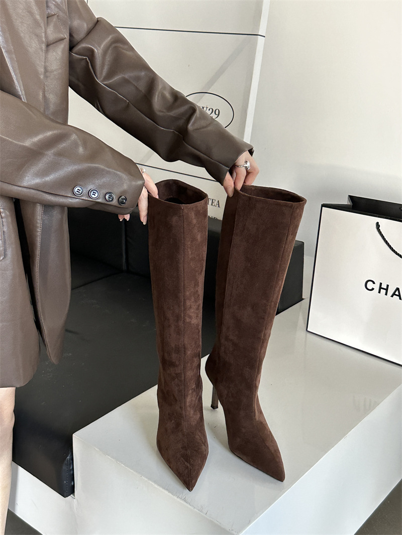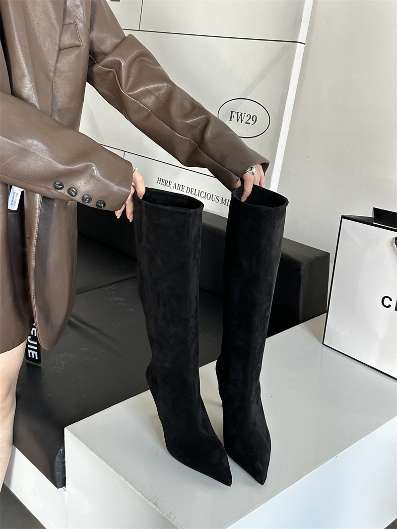 뾰족한 얇은 힐 유럽과 미국식 스웨이드 하이힐 부츠 여성의 가을과 겨울 2024 새로운 스트레이트 대형 스키니 부츠스토어 가기