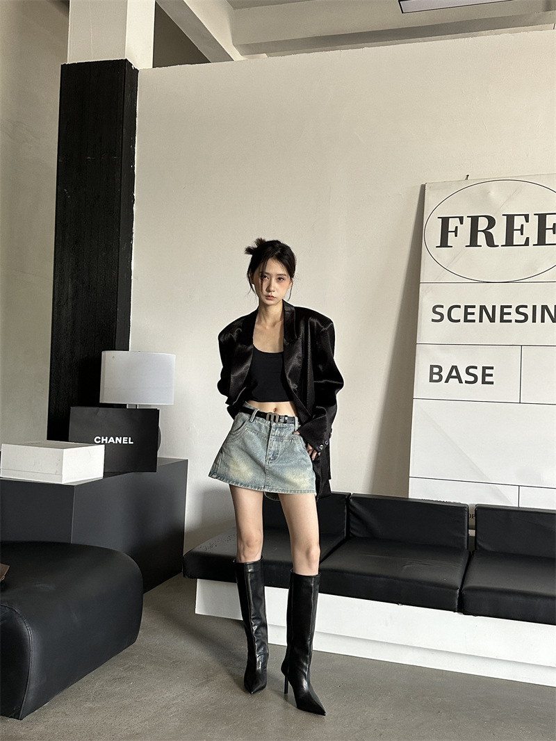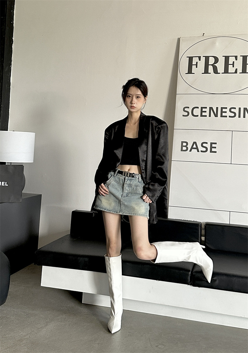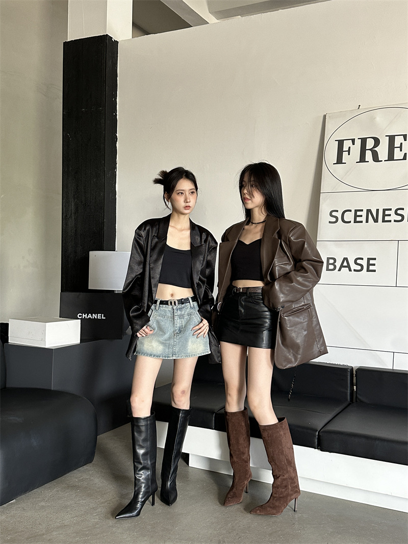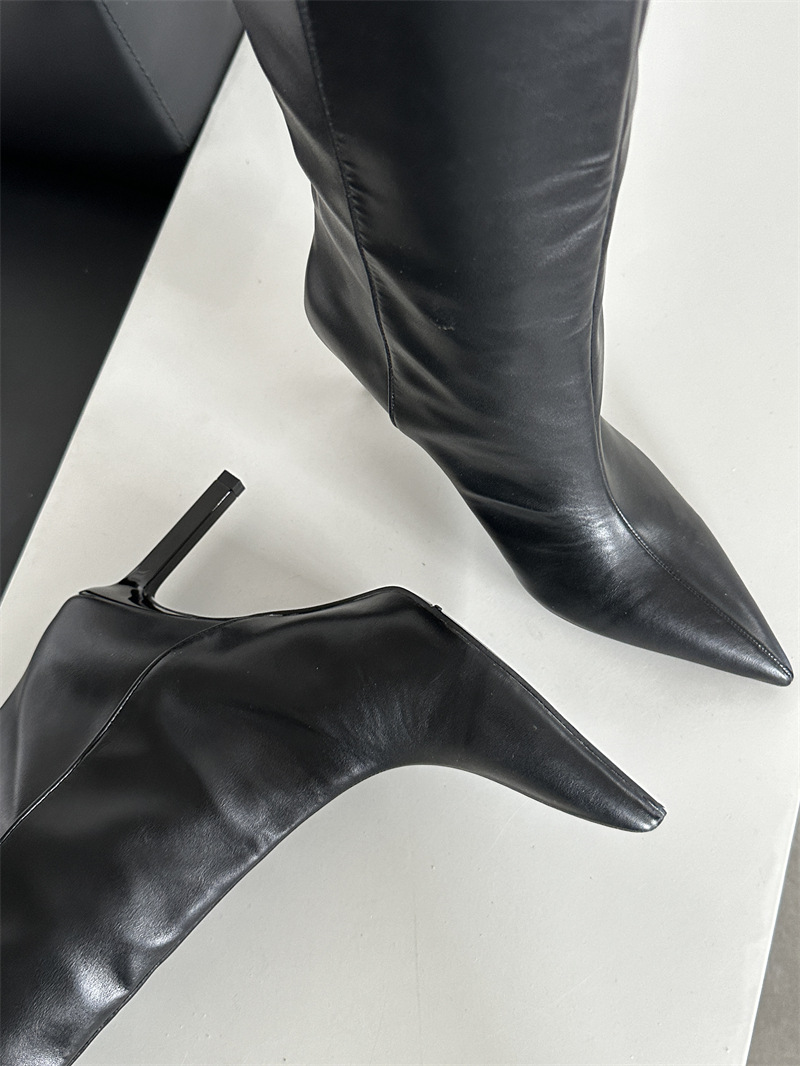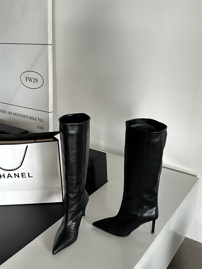 뾰족한 얇은 힐 유럽과 미국식 스웨이드 하이힐 부츠 여성의 가을과 겨울 2024 새로운 스트레이트 대형 스키니 부츠스토어 가기