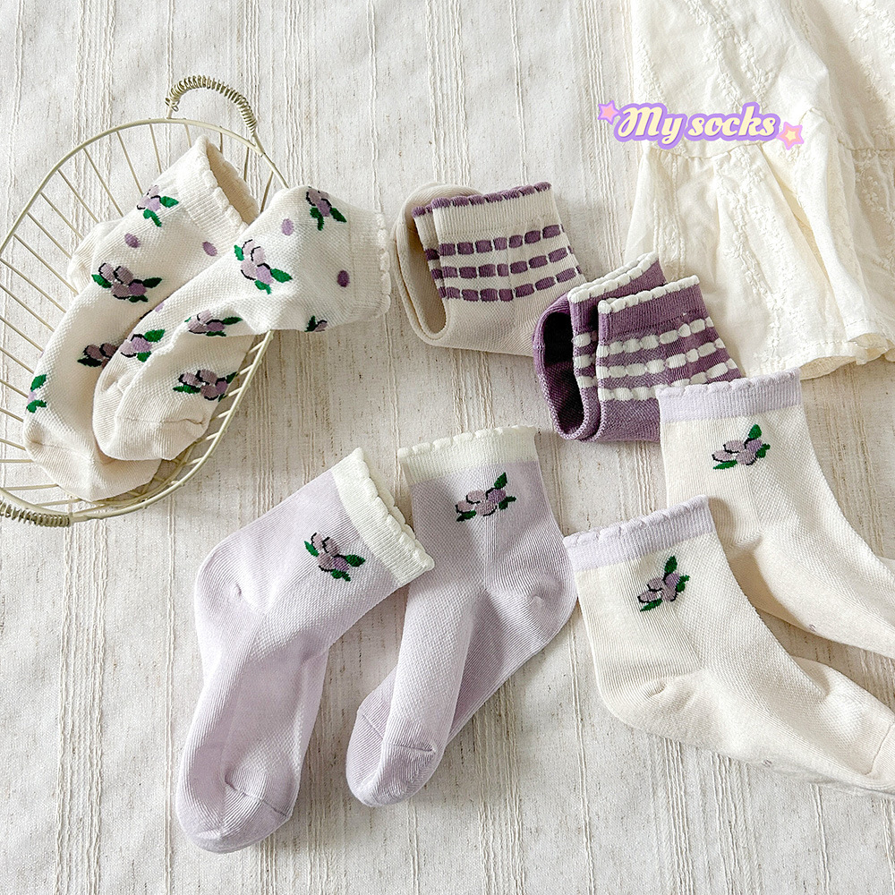 어린이 양말 봄 여름 메쉬 얇은 면 양말 한국 스타일 여아용 한국 스타일 보라색 꽃 양말 트렌디 양말 학생 스포츠 양말