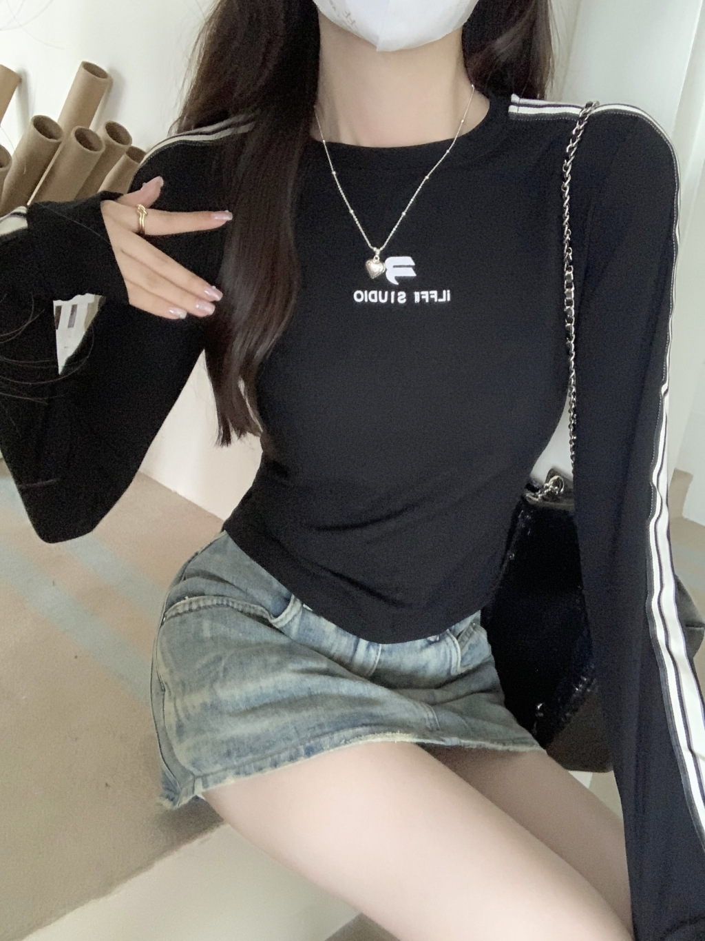 면 티셔츠 여성의 2024 가을과 겨울 새 편지 인쇄 긴 소매베이스 셔츠 슬리밍 내부 리본 따뜻한 탑스토어 가기