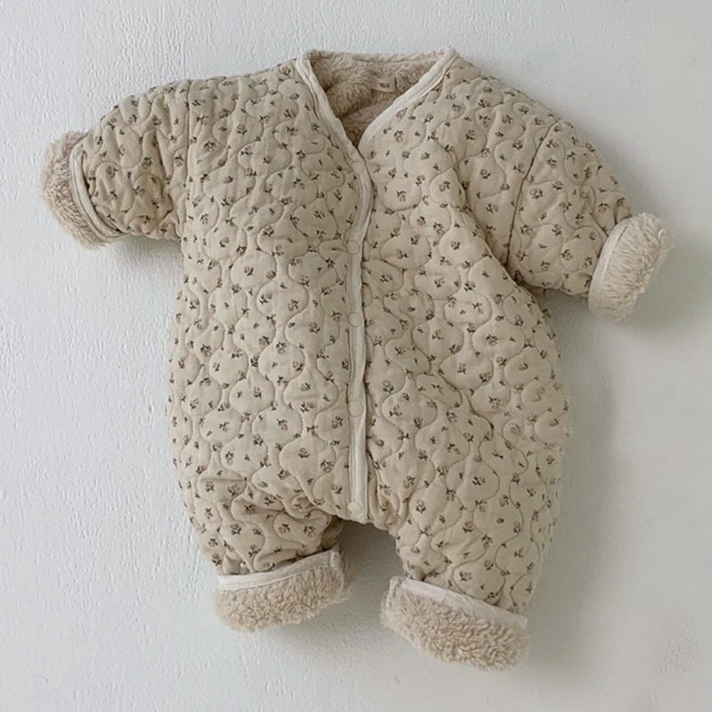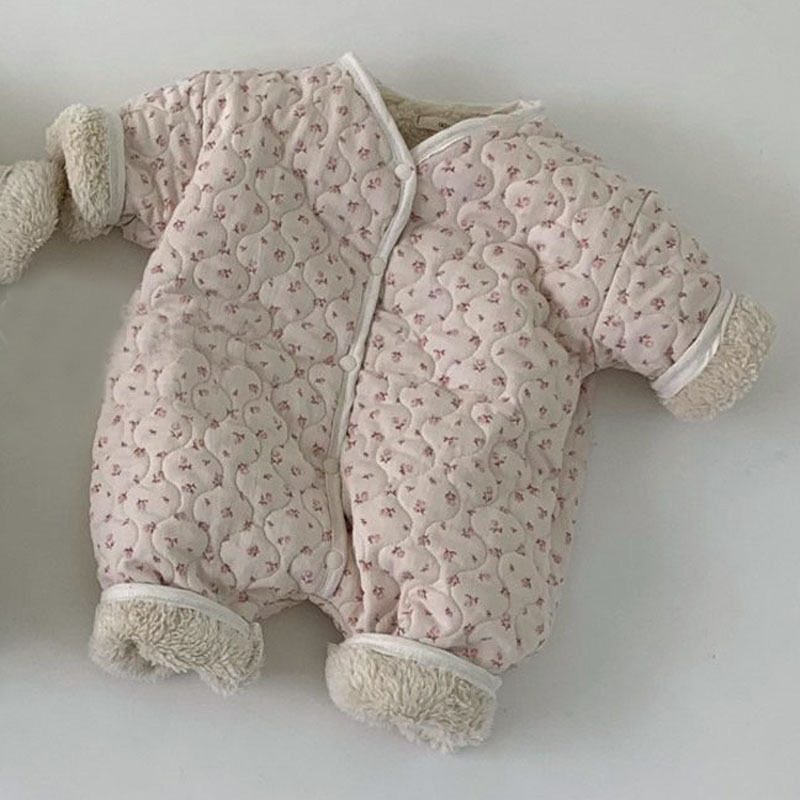 한국판 ins 신생아 점프수트, 면 패딩 재킷, 벨벳으로 두껍게, 따뜻한 꽃무늬 면 코트, 아기 외출용 긴 크롤링 슈트