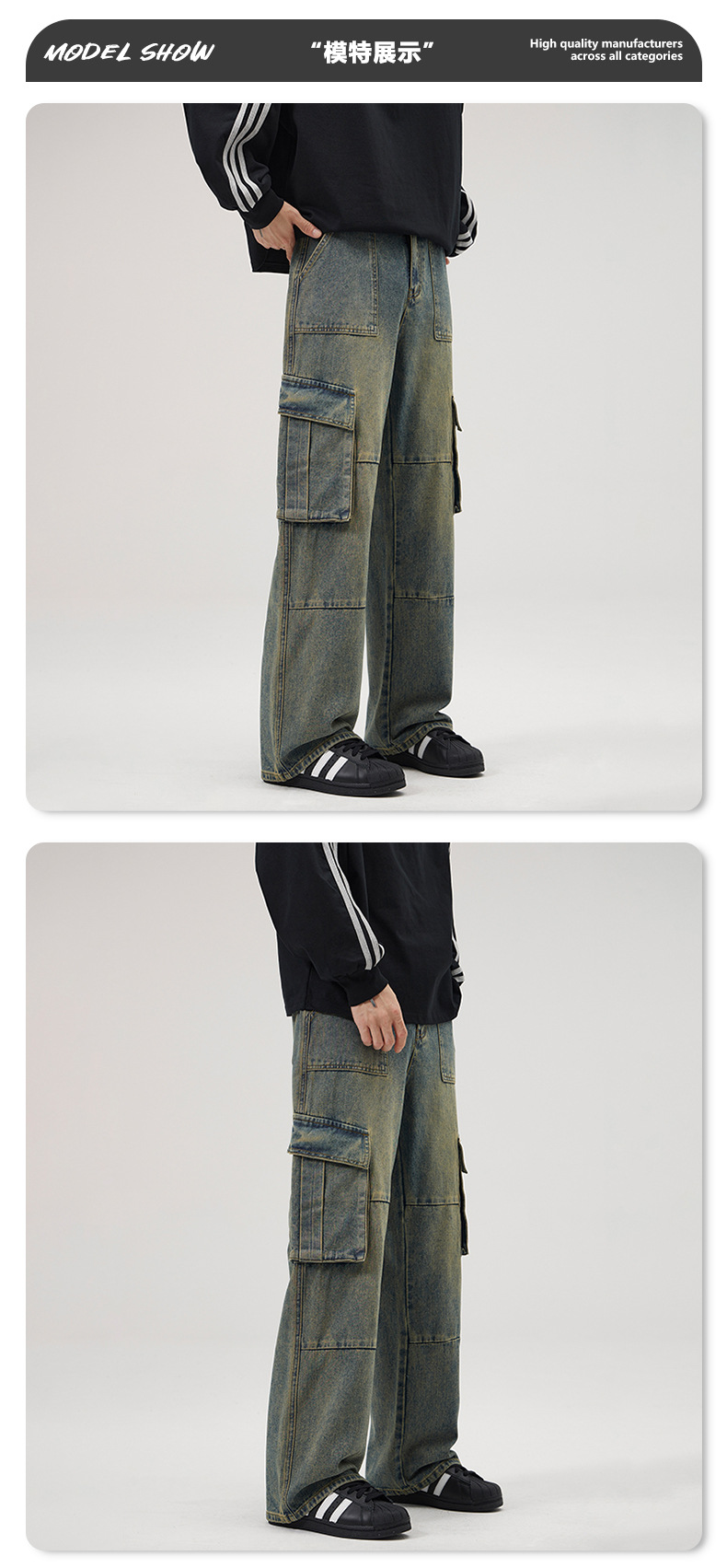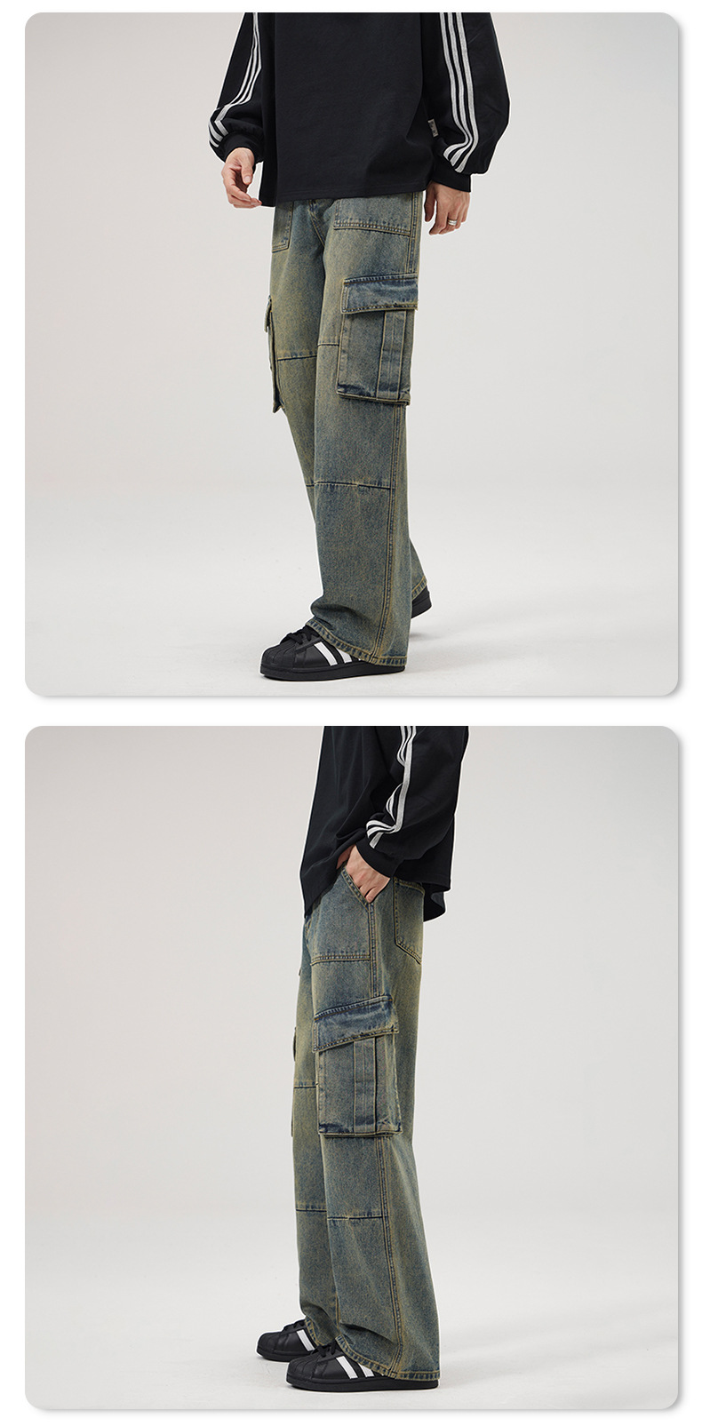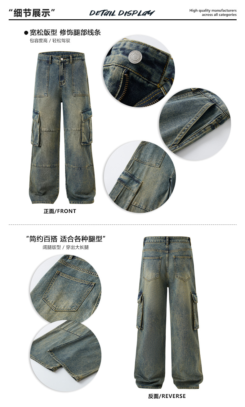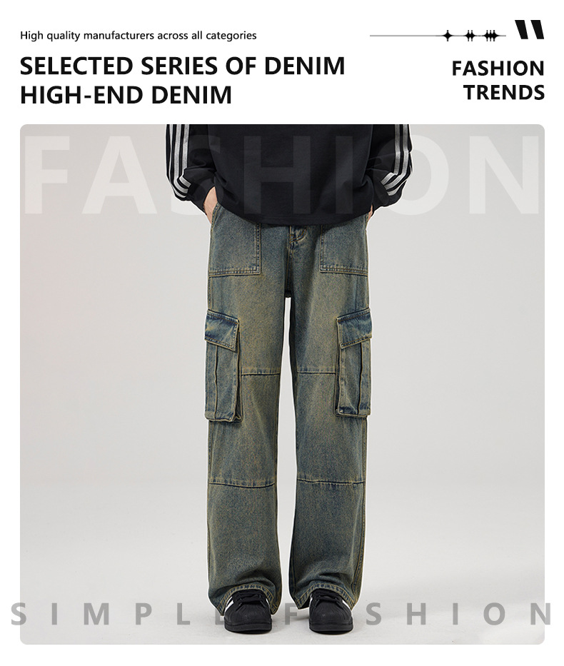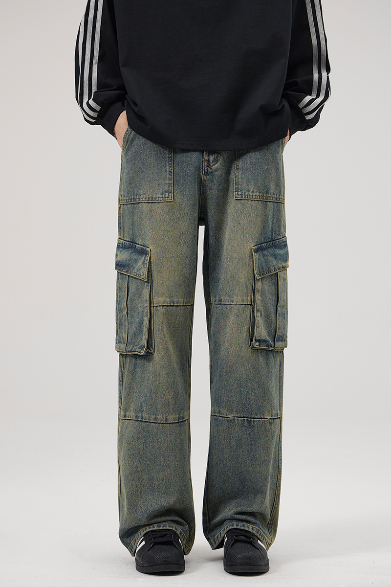 JIAMU 가을/겨울 새로운 미국 스타일 레트로 향수 세척 멀티 포켓 청바지 남성용 스트레이트 루즈화물 바지스토어 가기