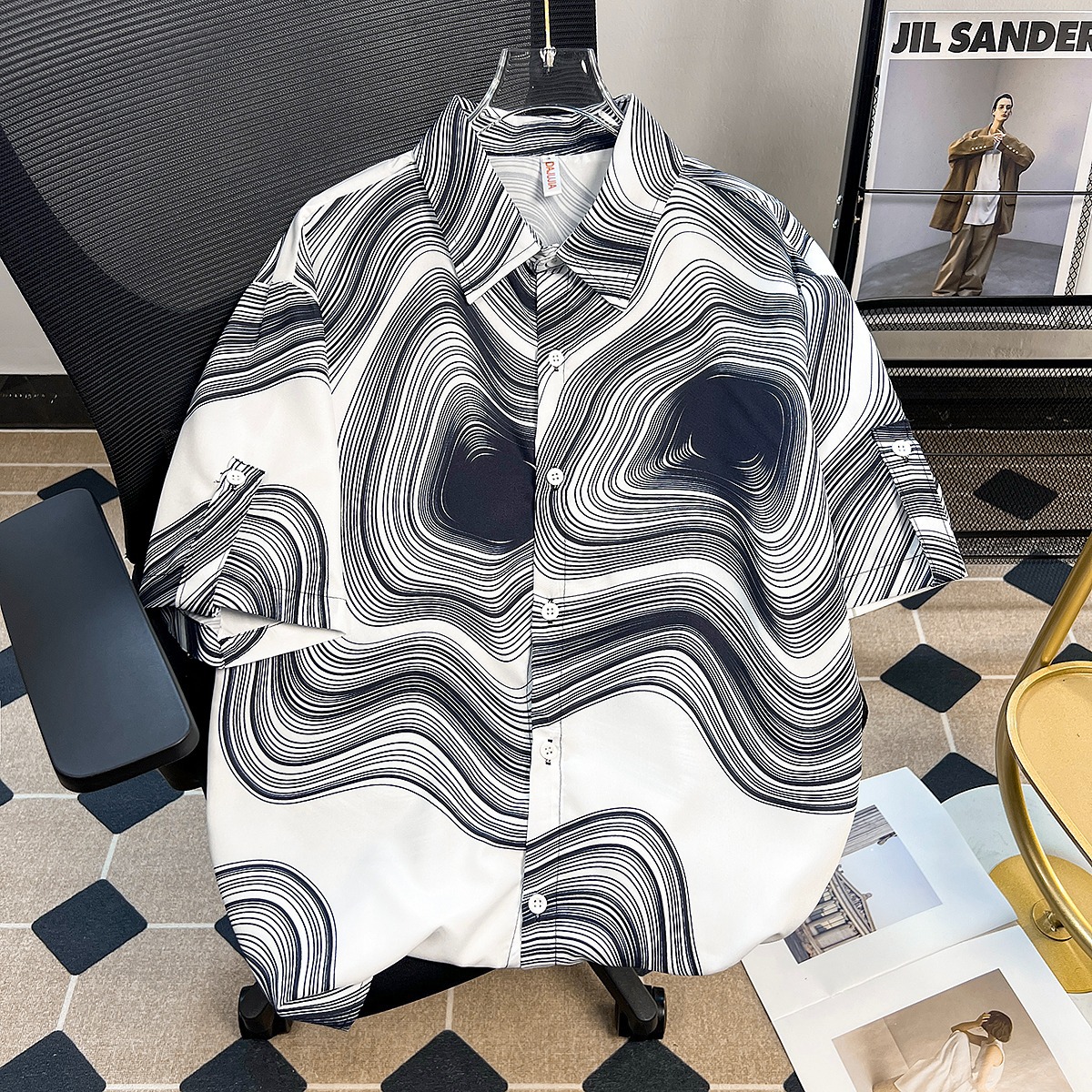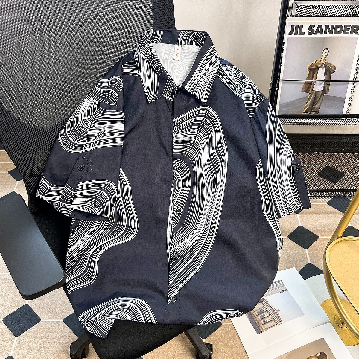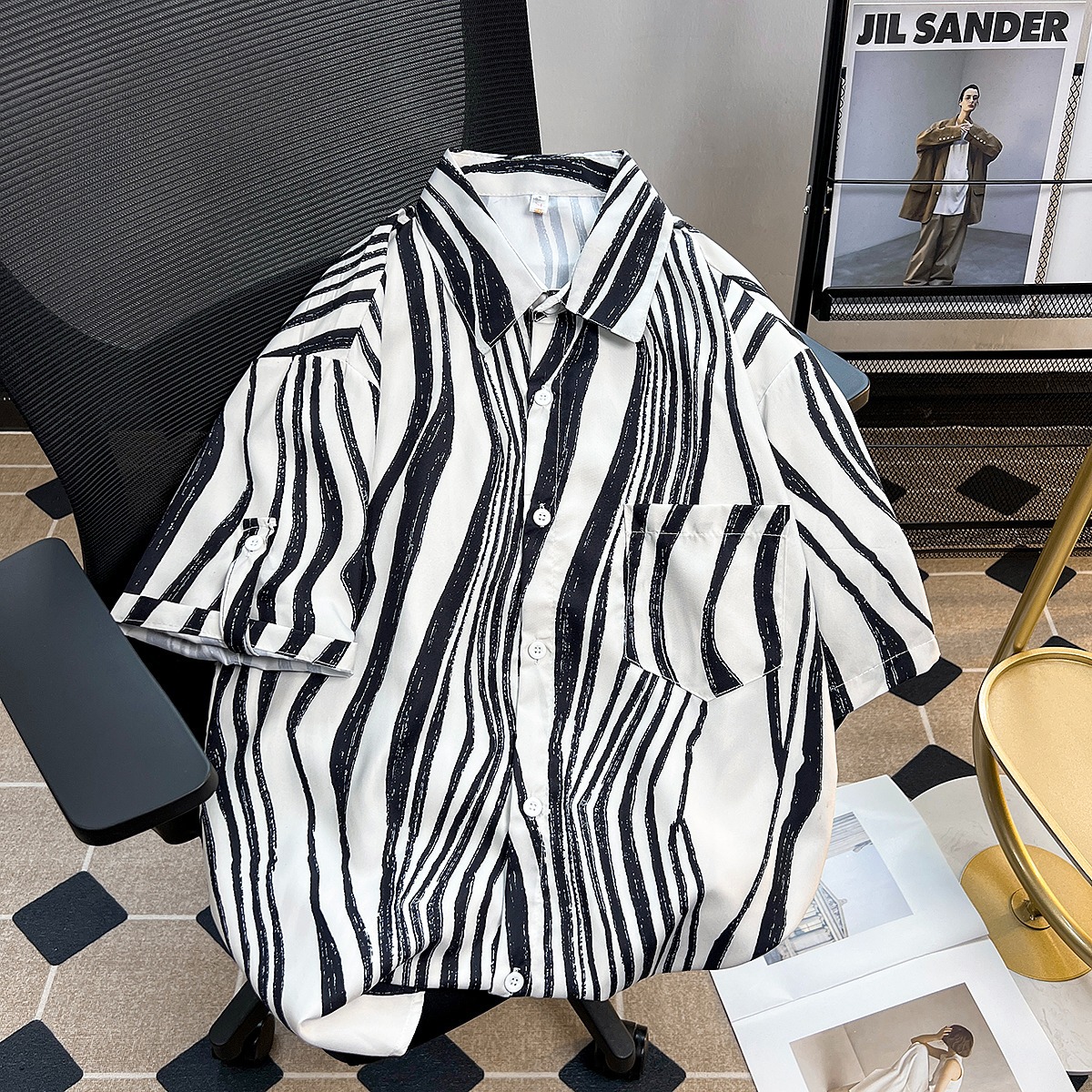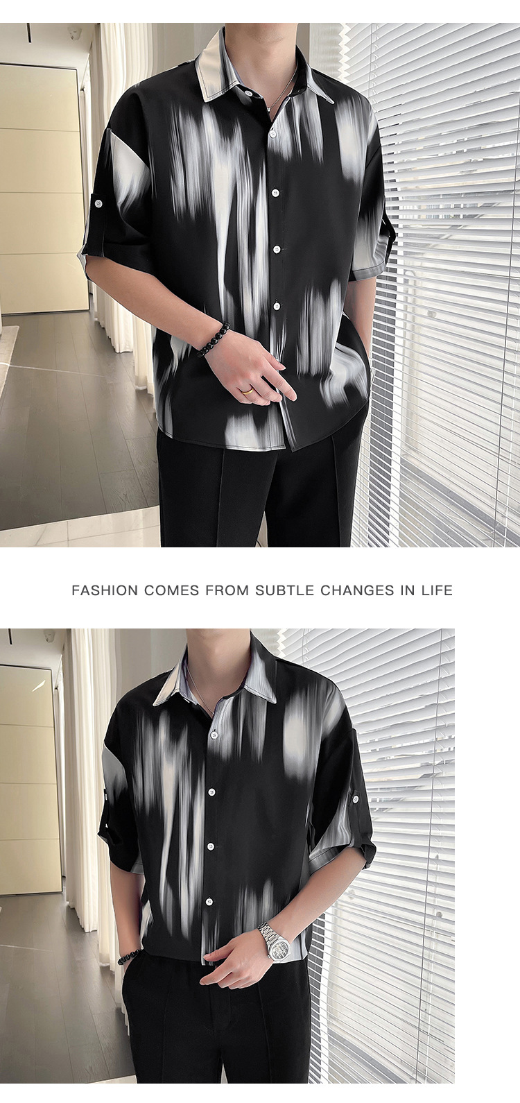 여름 디자인 센스 틈새 넥타이-염료 인쇄 중간 소매 셔츠 남성용 한국식 아이스 실크 얇은 포장 감각 잘 생긴 반팔 셔츠스토어 가기