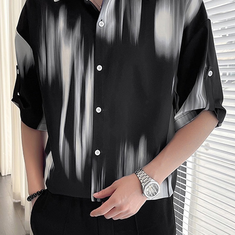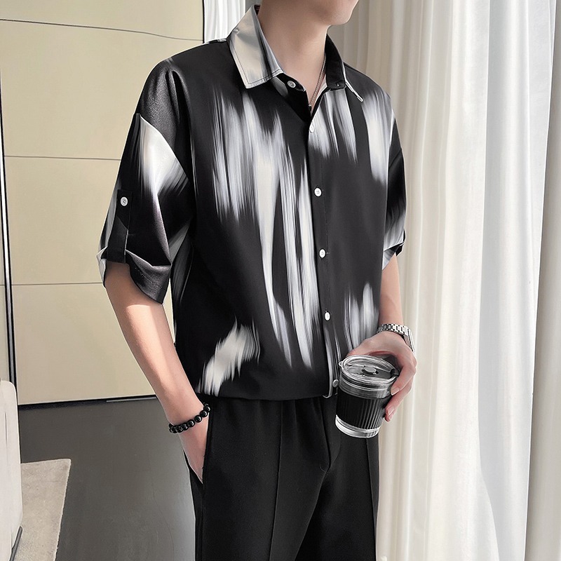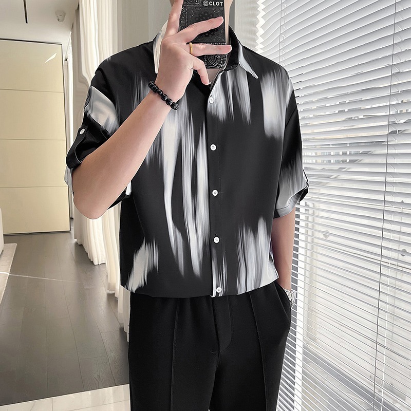 여름 디자인 센스 틈새 넥타이-염료 인쇄 중간 소매 셔츠 남성용 한국식 아이스 실크 얇은 포장 감각 잘 생긴 반팔 셔츠