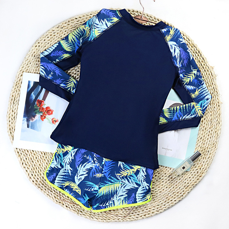 比基尼欧美分体式平角女泳衣 保守长袖印花泳装防晒冲浪服批发