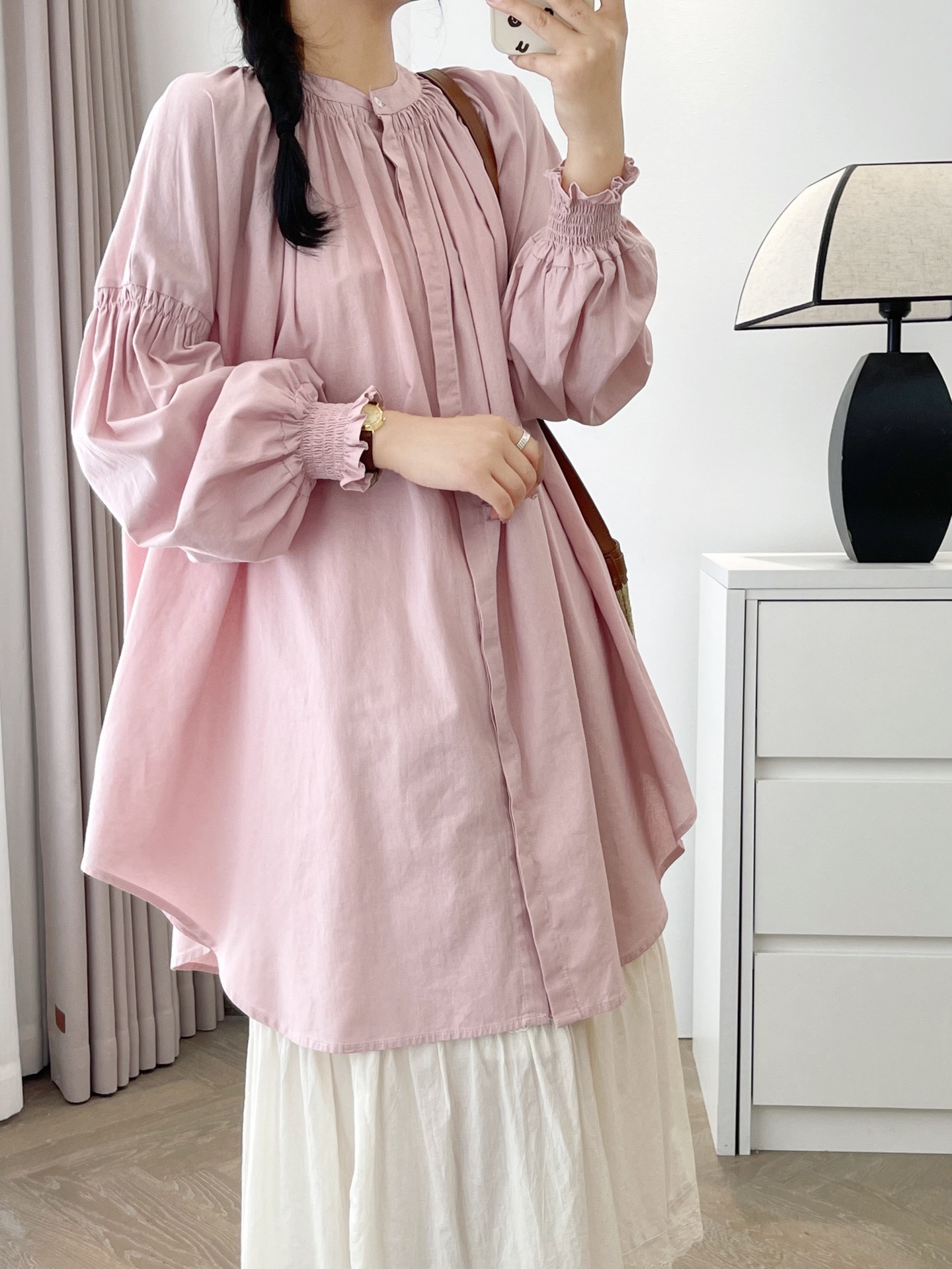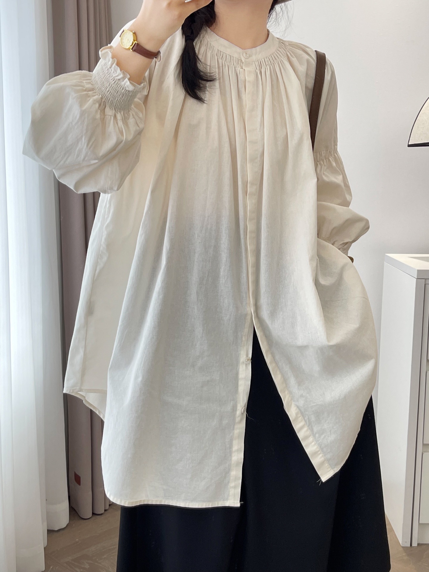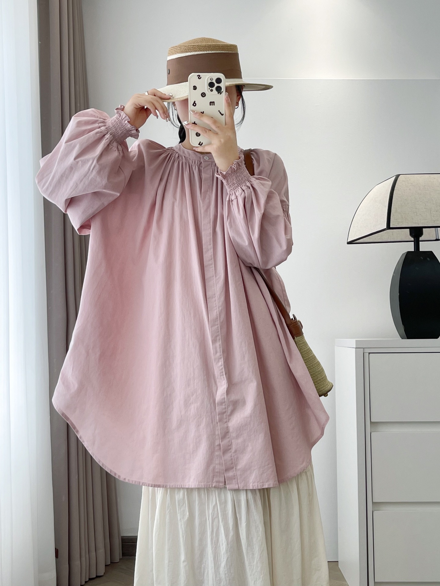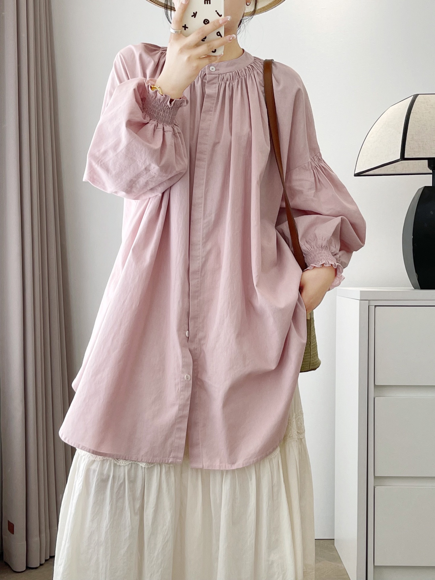 한국 스타일 새로운 스타일 간단한 라운드 넥 싱글 브레스트 엘라스토 커프 느슨한 중간 길이 솔리드 컬러 셔츠