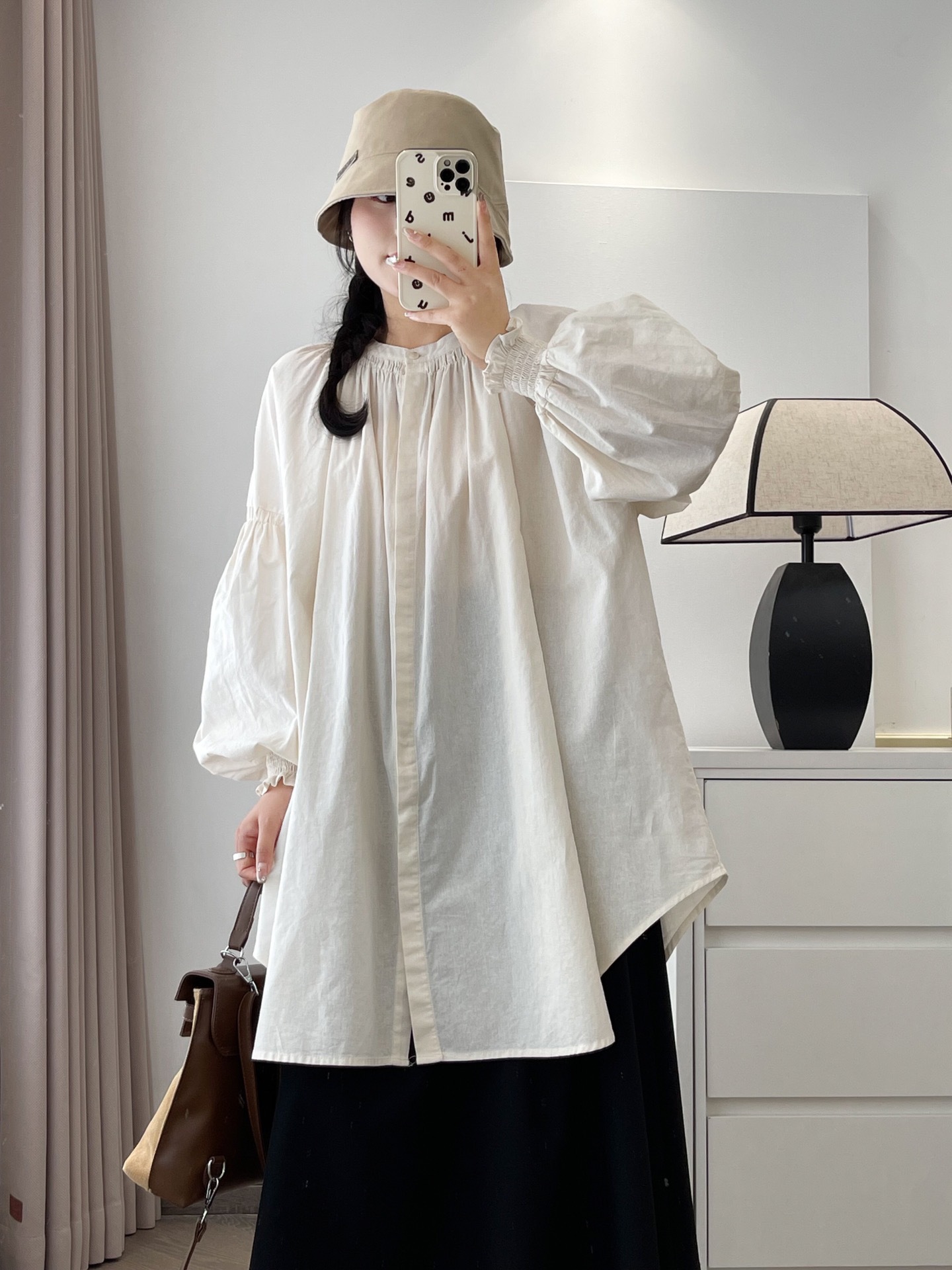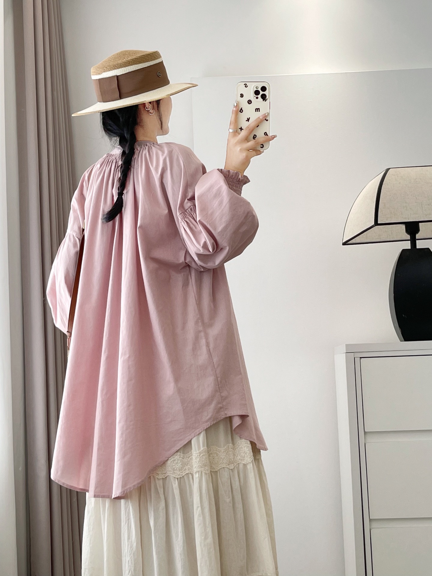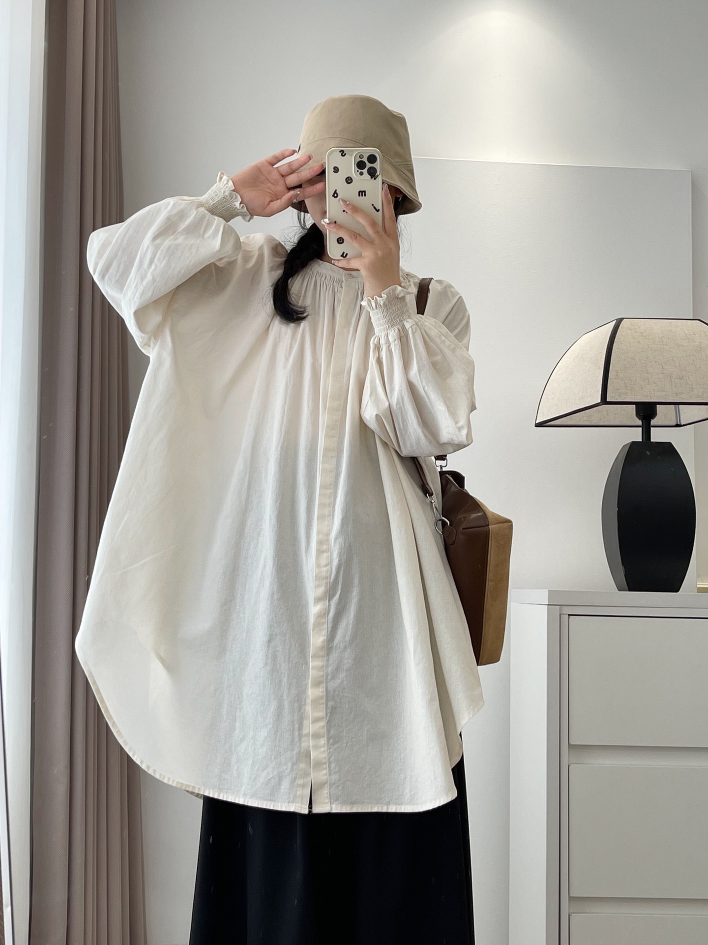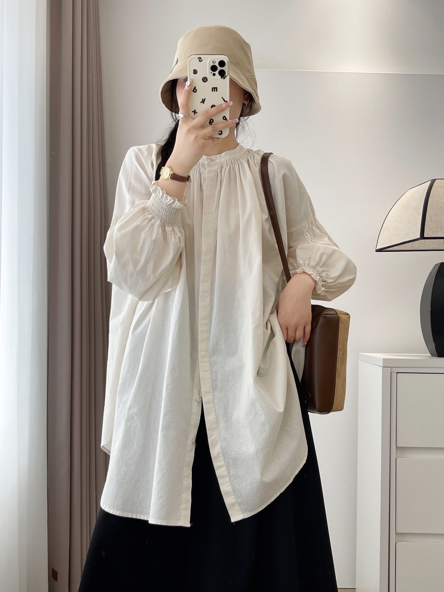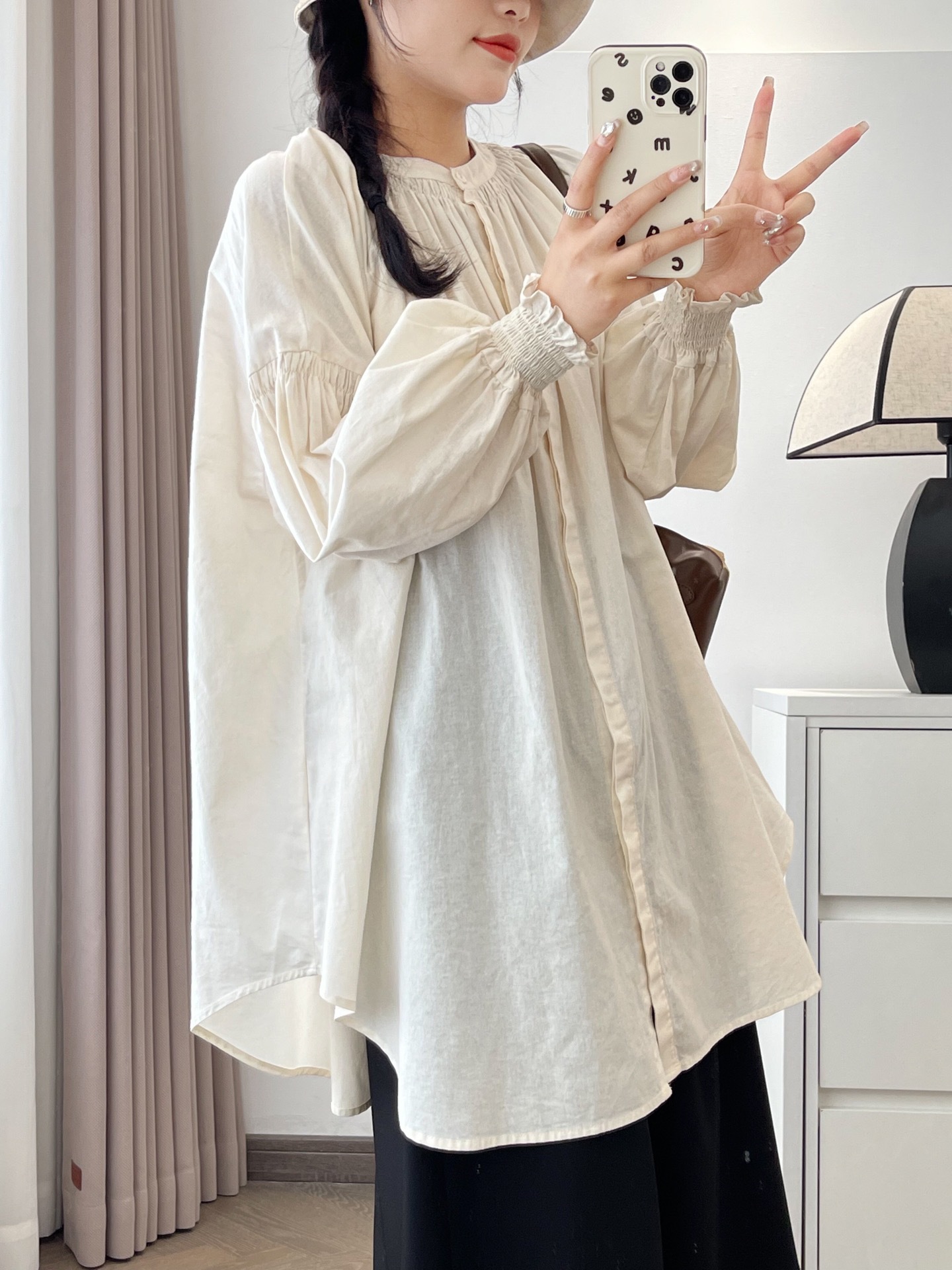 한국 스타일 새로운 스타일 간단한 라운드 넥 싱글 브레스트 엘라스토 커프 느슨한 중간 길이 솔리드 컬러 셔츠스토어 가기