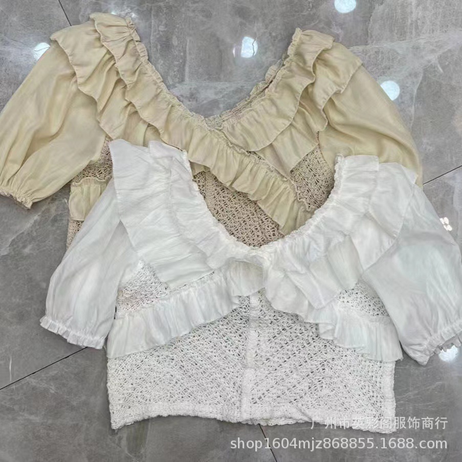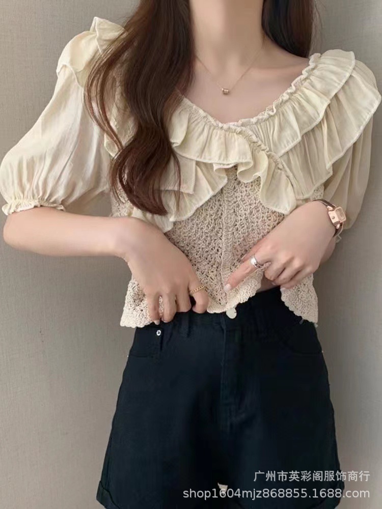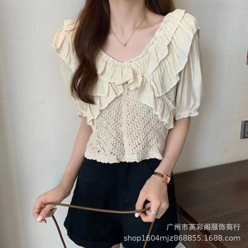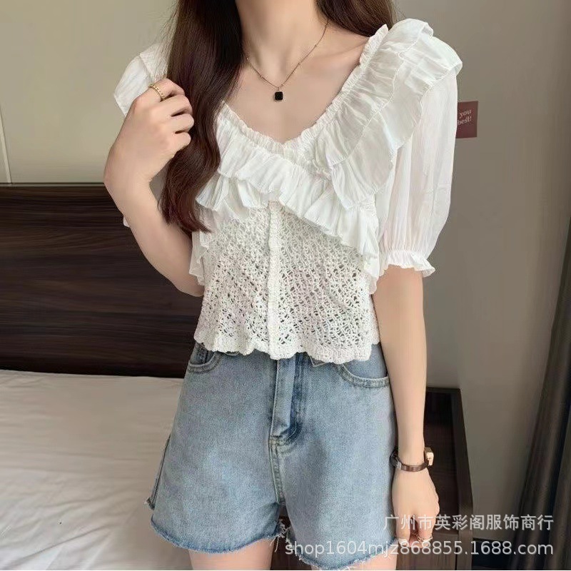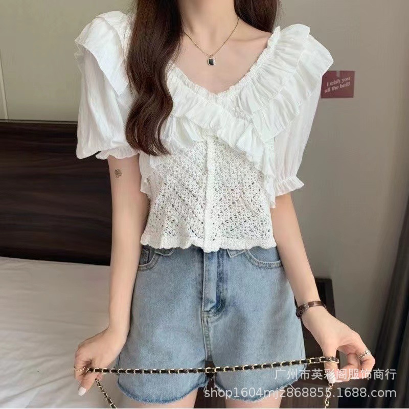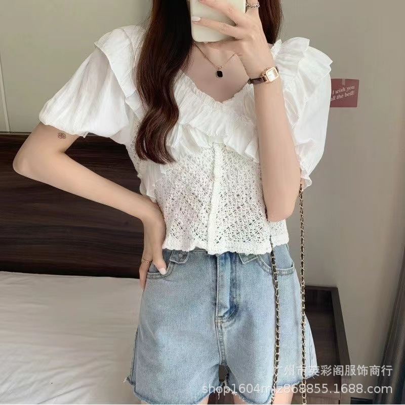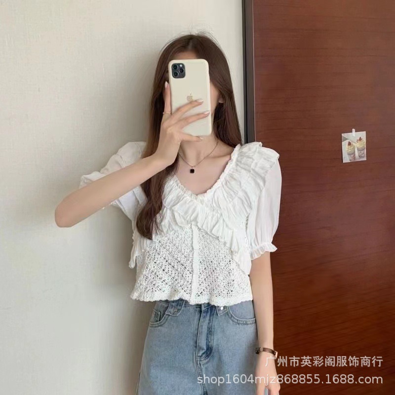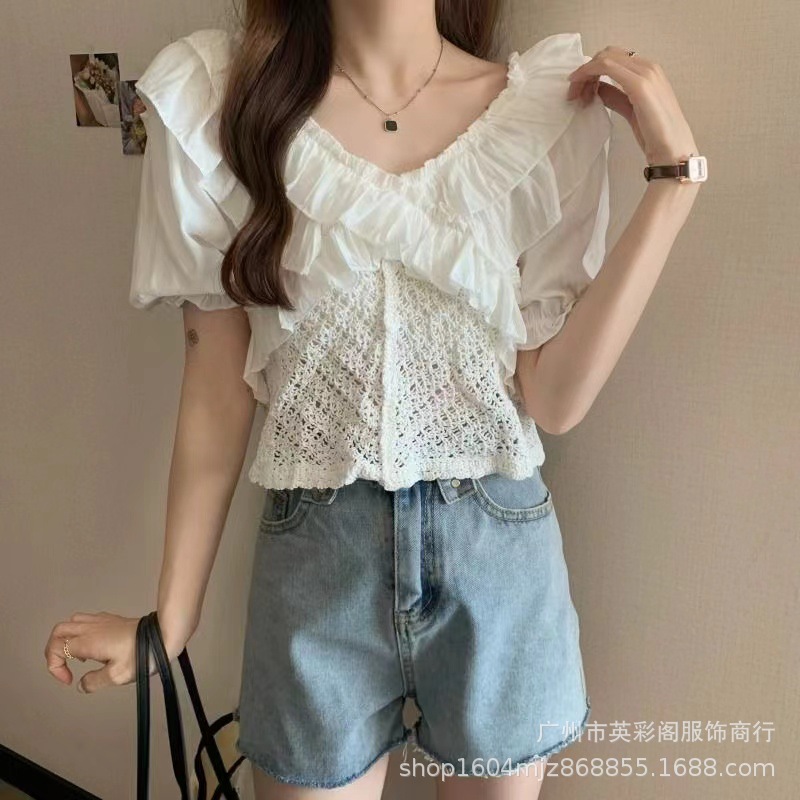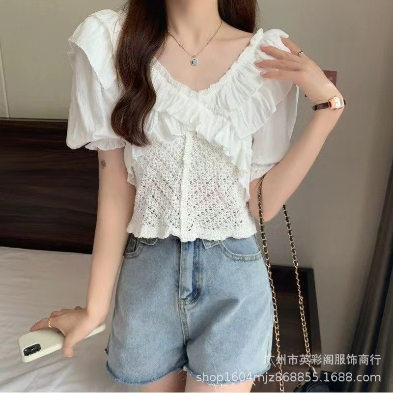 달콤한 스파이스 소녀 할로우 쇼트 탑 여성용 퍼프 슬리브 여름 부드러운 스타일 Ruffled 스티칭 쉬폰 작은 최고 트렌디