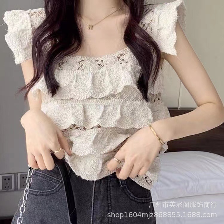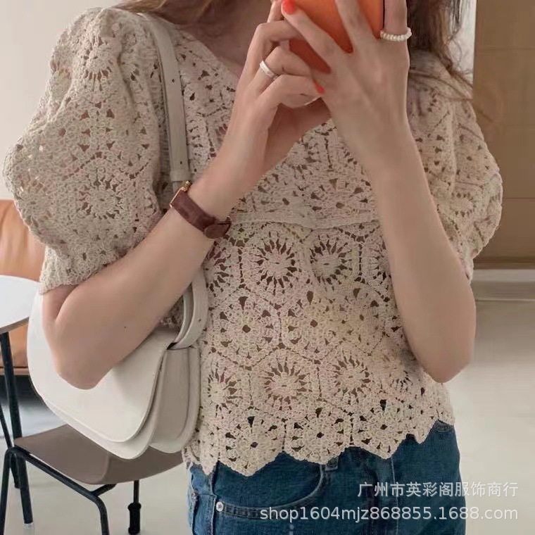 달콤한 스파이스 소녀 할로우 쇼트 탑 여성용 퍼프 슬리브 여름 부드러운 스타일 Ruffled 스티칭 쉬폰 작은 최고 트렌디스토어 가기