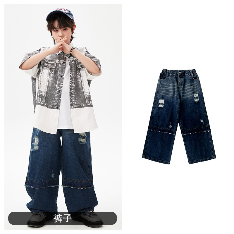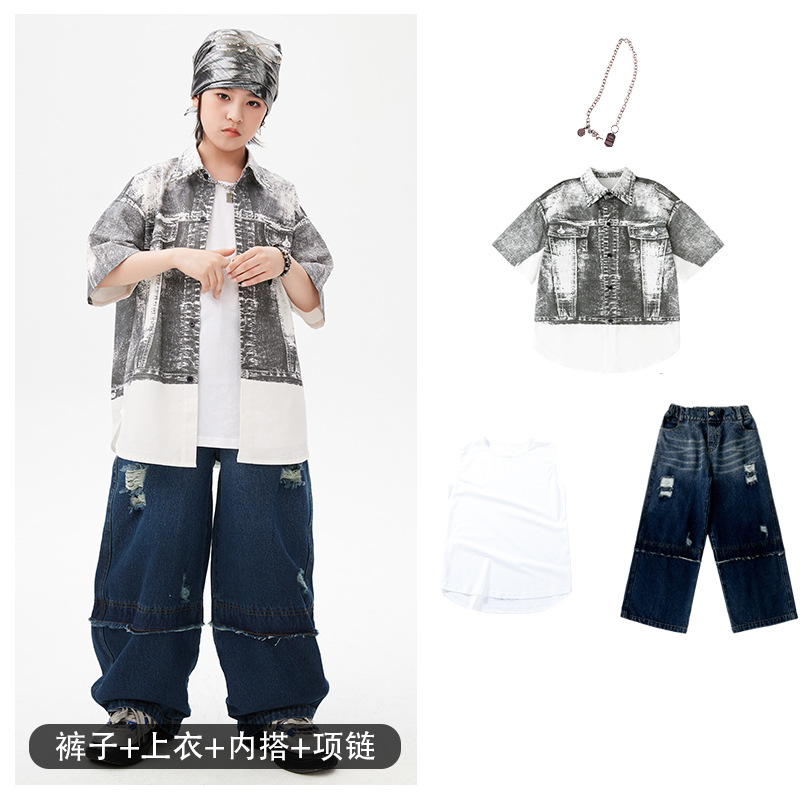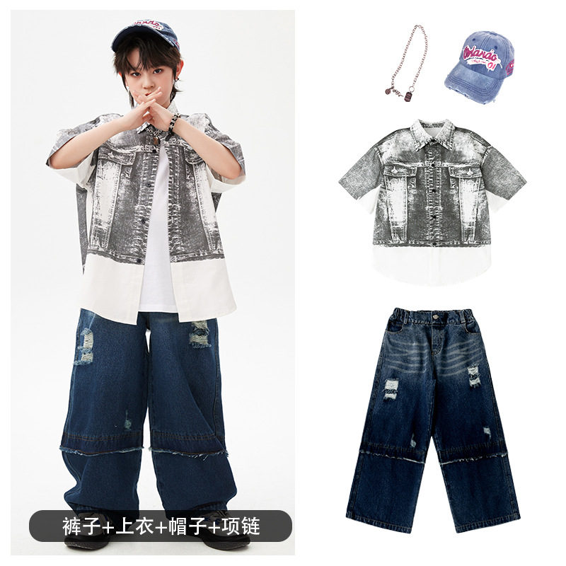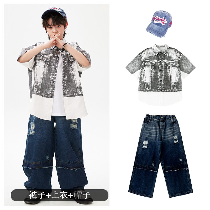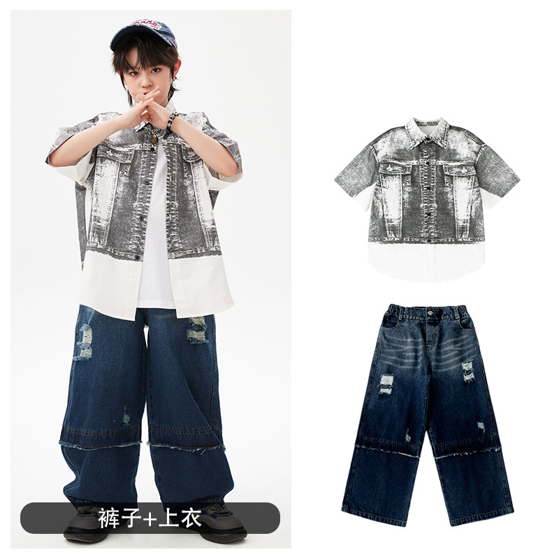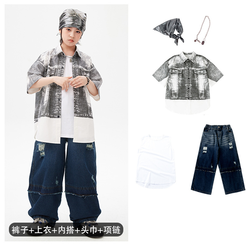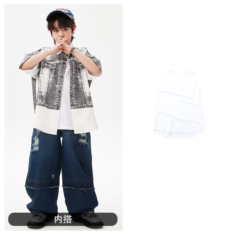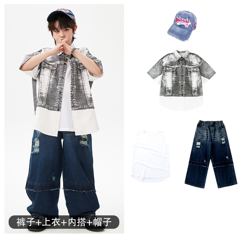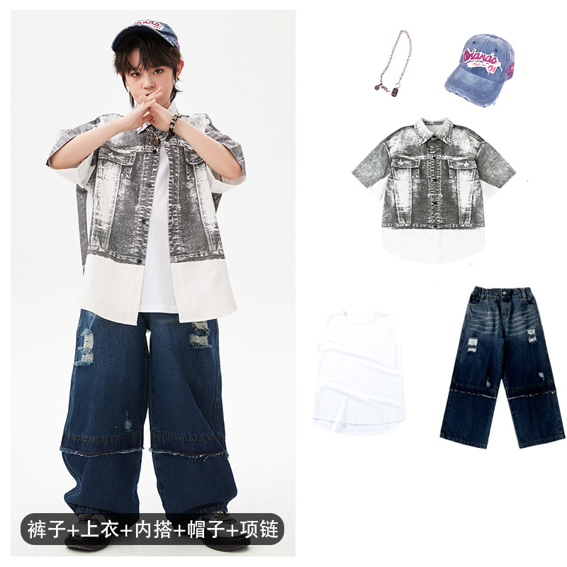 힙합 어린이 패션 의류 쿨 어린이 의류 Hiphop 드럼 공연 의류 소년 힙합 느슨한 소년 여름