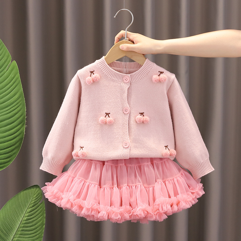 여자 세트 2024 가을 겨울 새 핑크 체리 스웨터 카디건 터그 스커트 아기 니트 탑 2 피스 세트