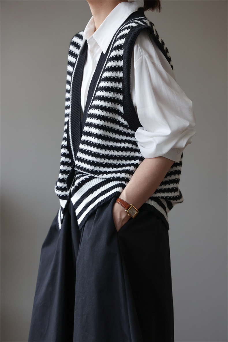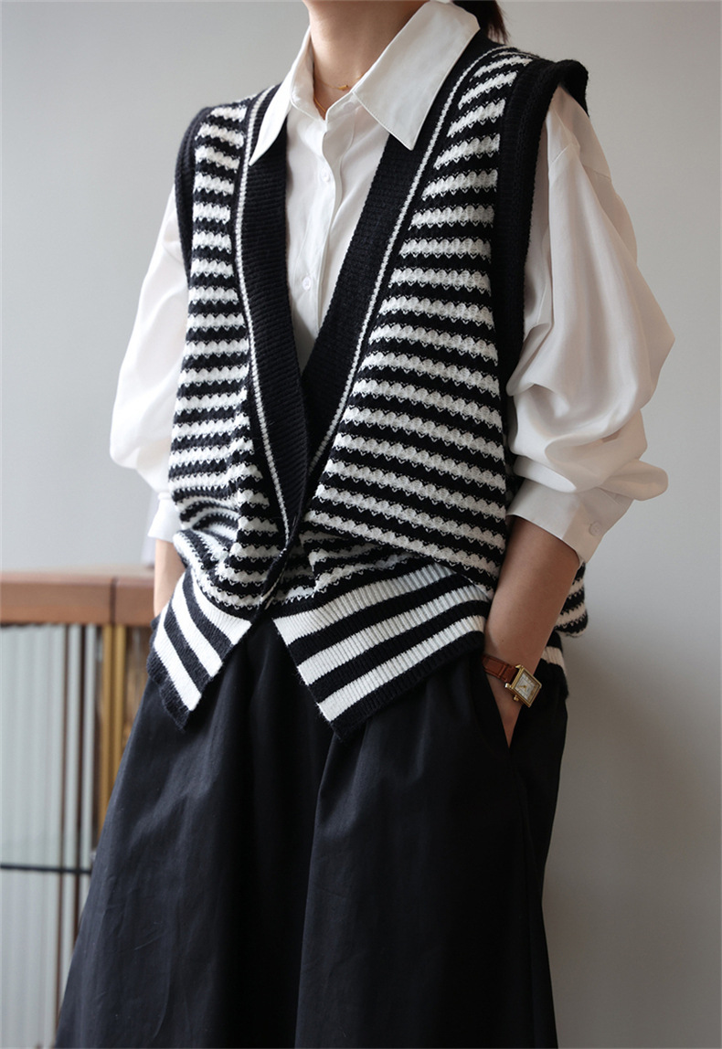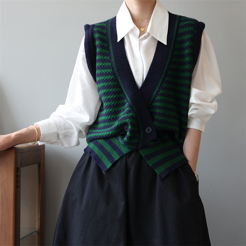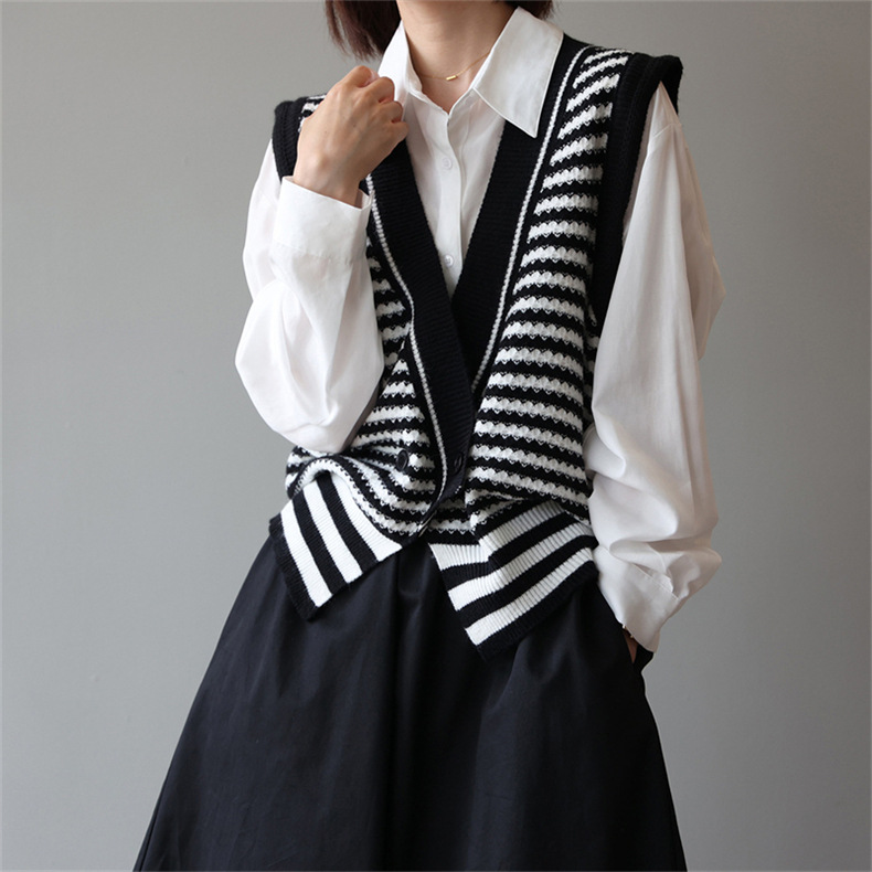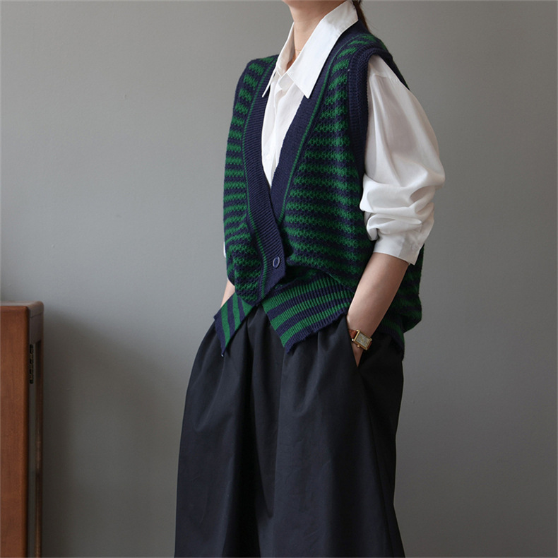 빈티지 게으른 줄무늬 니트 조끼 최고 여성 루즈 아우터 가을 패션 새로운 웨이스트 코트 스웨터 조끼