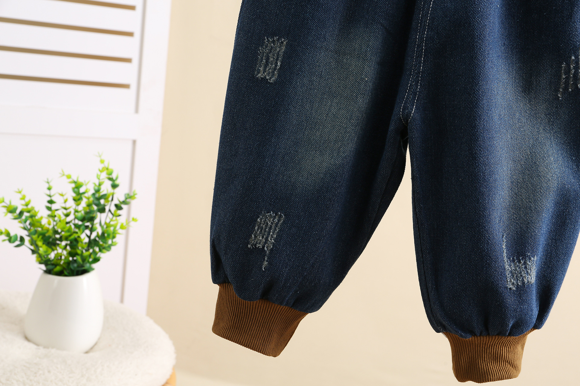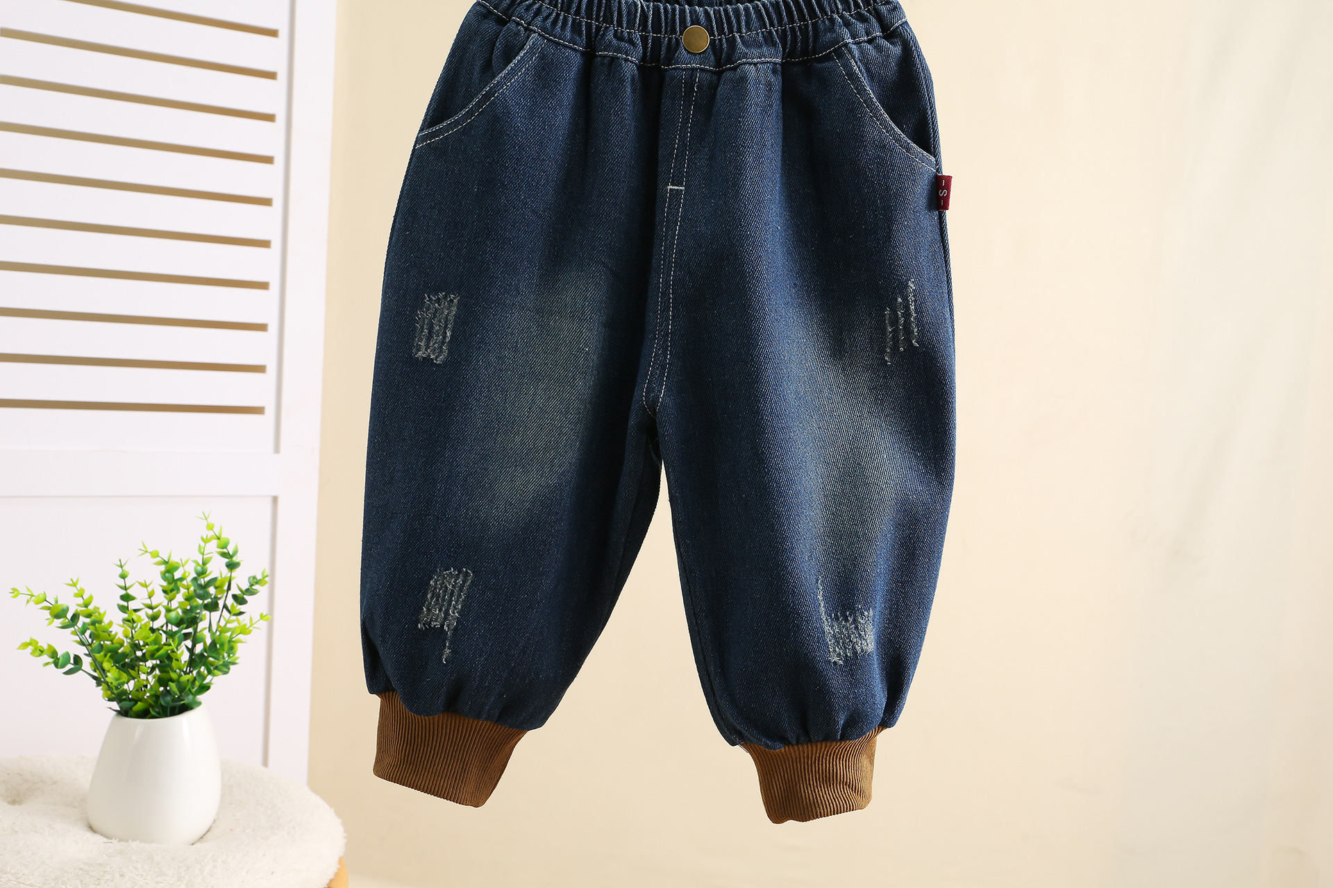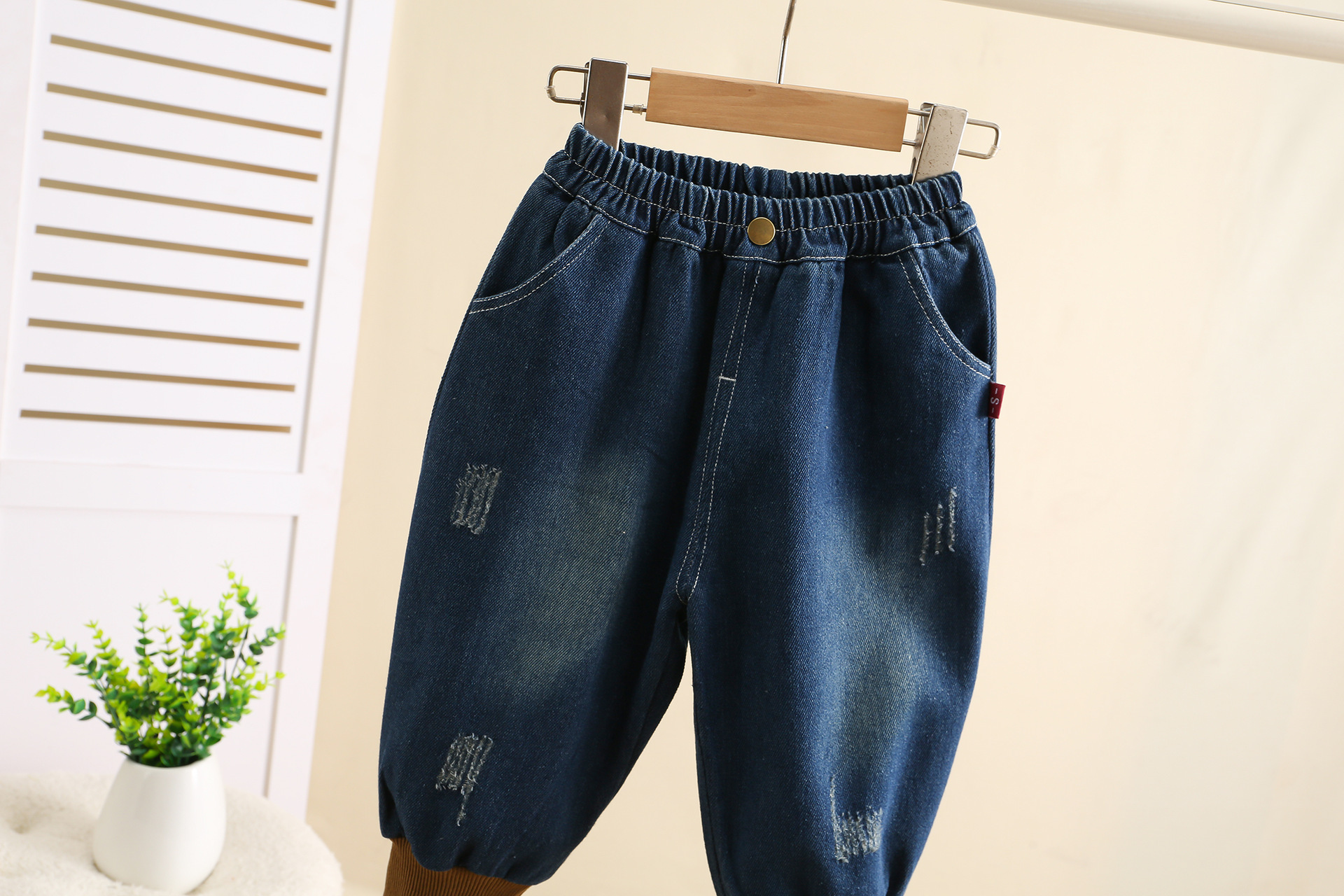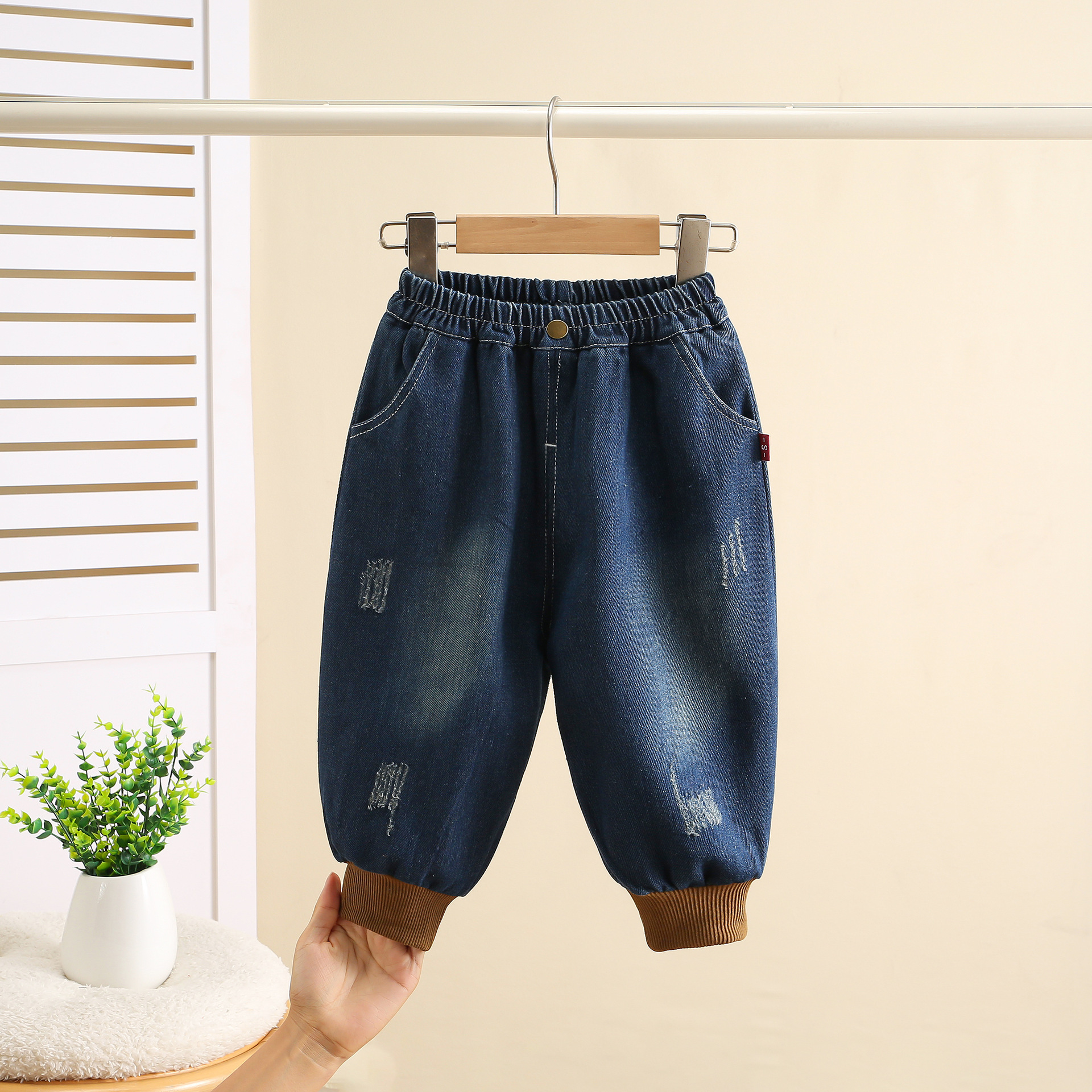 잘 생긴 작은 소년의 찢어진 청바지 2024 봄과 가을 새로운 어린이 캐주얼 바지 1-3 세 아기 가을 어린이 바지스토어 가기