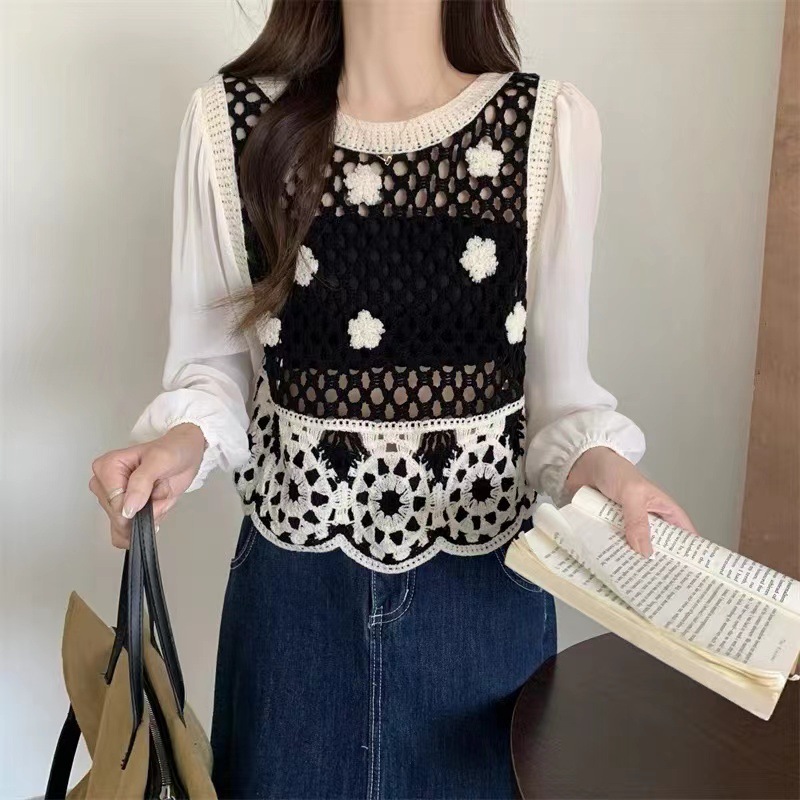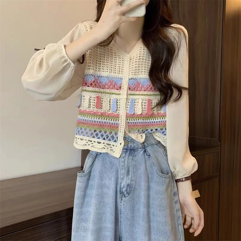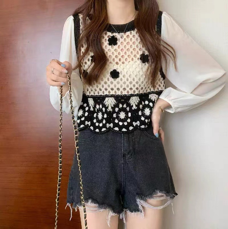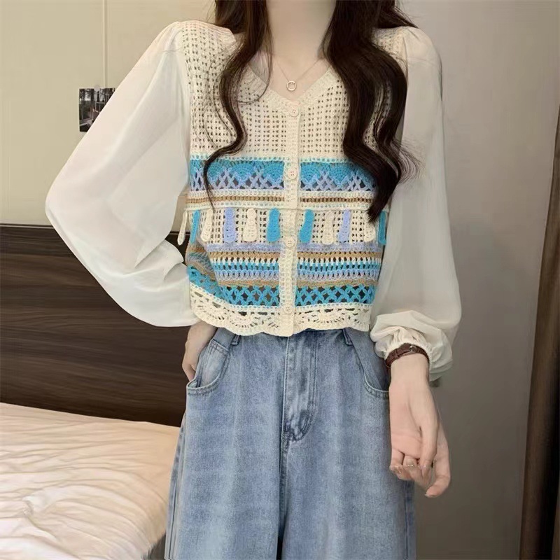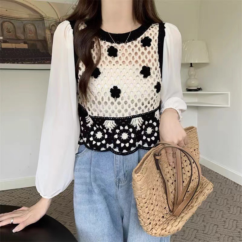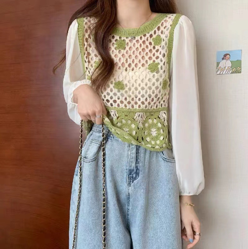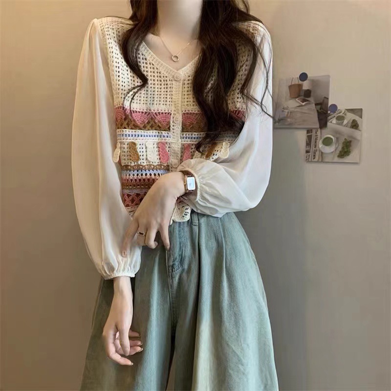 작은 신선한 가짜 투피스 할로우 아웃 니트웨어 여성용 긴팔 쉬폰 셔츠 디자인 틈새 레트로 라운드 넥 쇼트 탑