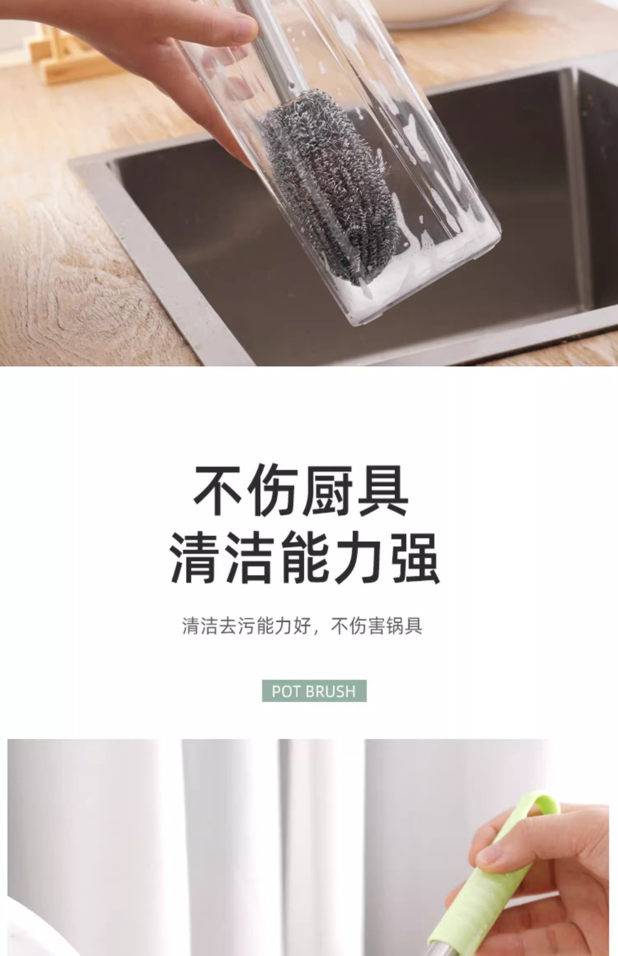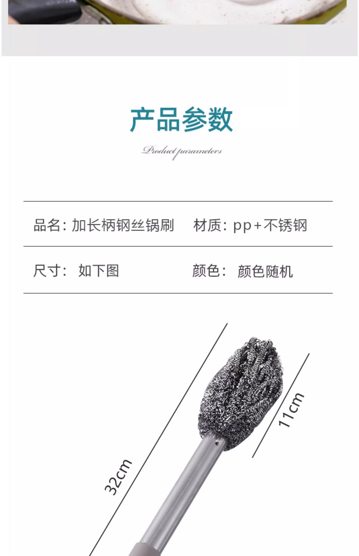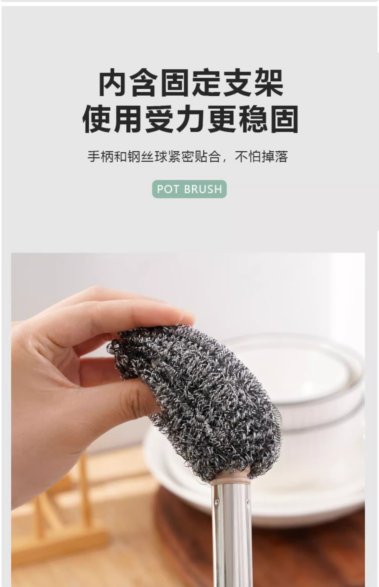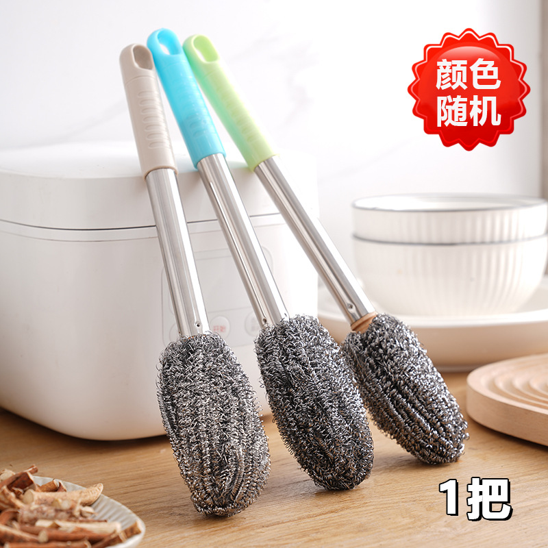 긴 손잡이 스틸 와이어 볼 브러시 긴 막대 세척 냄비 브러시 청소 브러시 주방은 손을 손상시키지 않습니다 설거지 접시가 스토브 청소에서 떨어지지 않습니다.