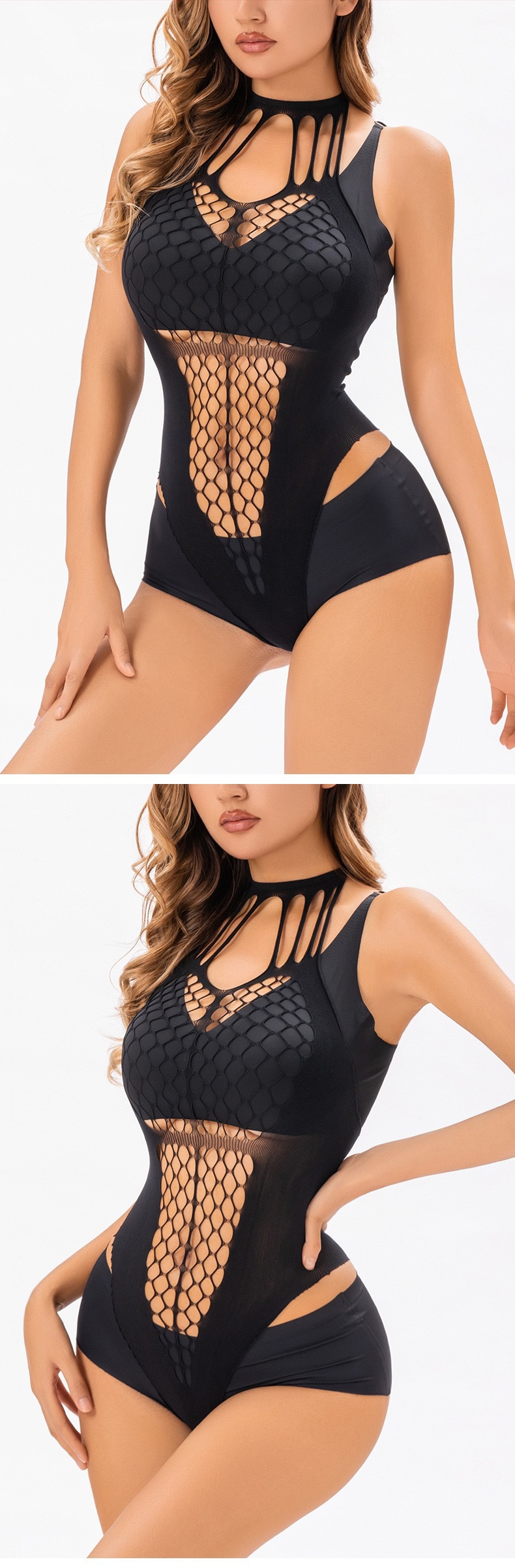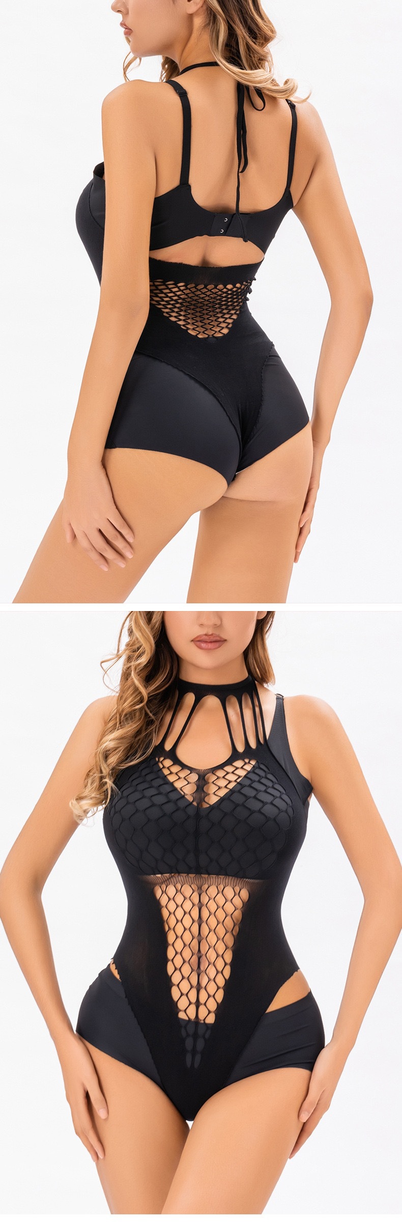 유럽과 미국의 섹시한 목 교수형 스트랩 섹시 속옷 Fishnet 백리스 핫 힙 스커트 하이 스플릿 비키니 점프 수트스토어 가기
