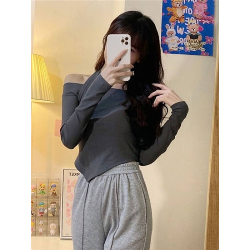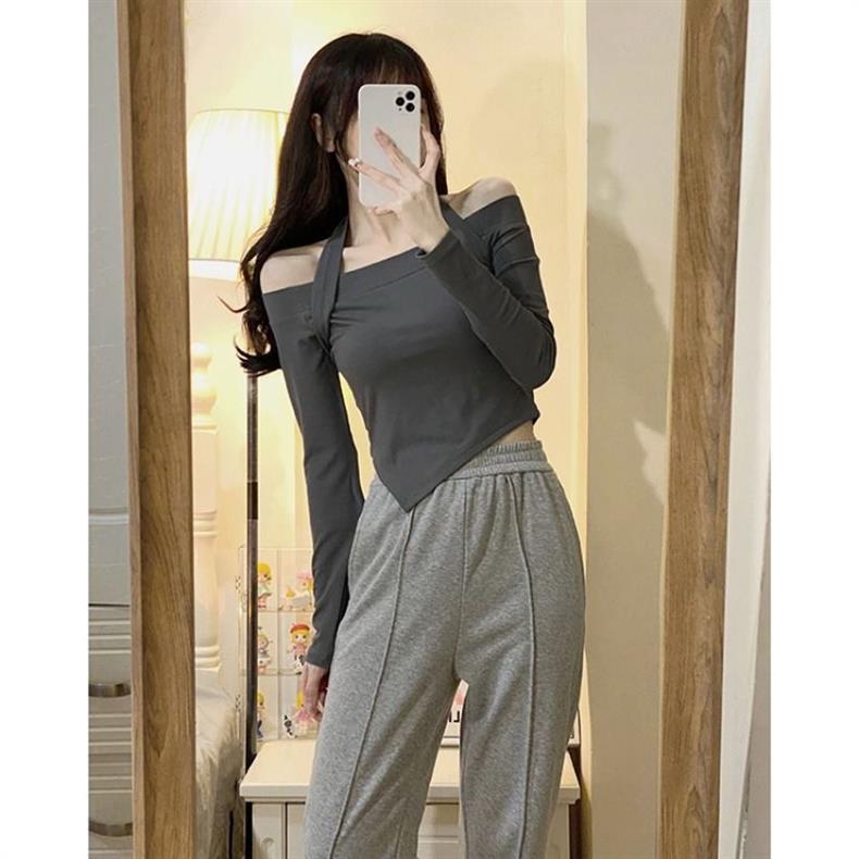 초기 YT21352 가을 세트 여신 팬 빛 성숙한 홍콩 스타일 디자인 센스 작은 한 어깨 짧은 탑 롱