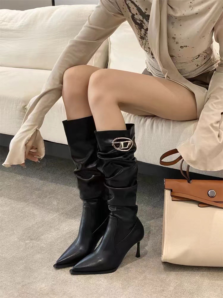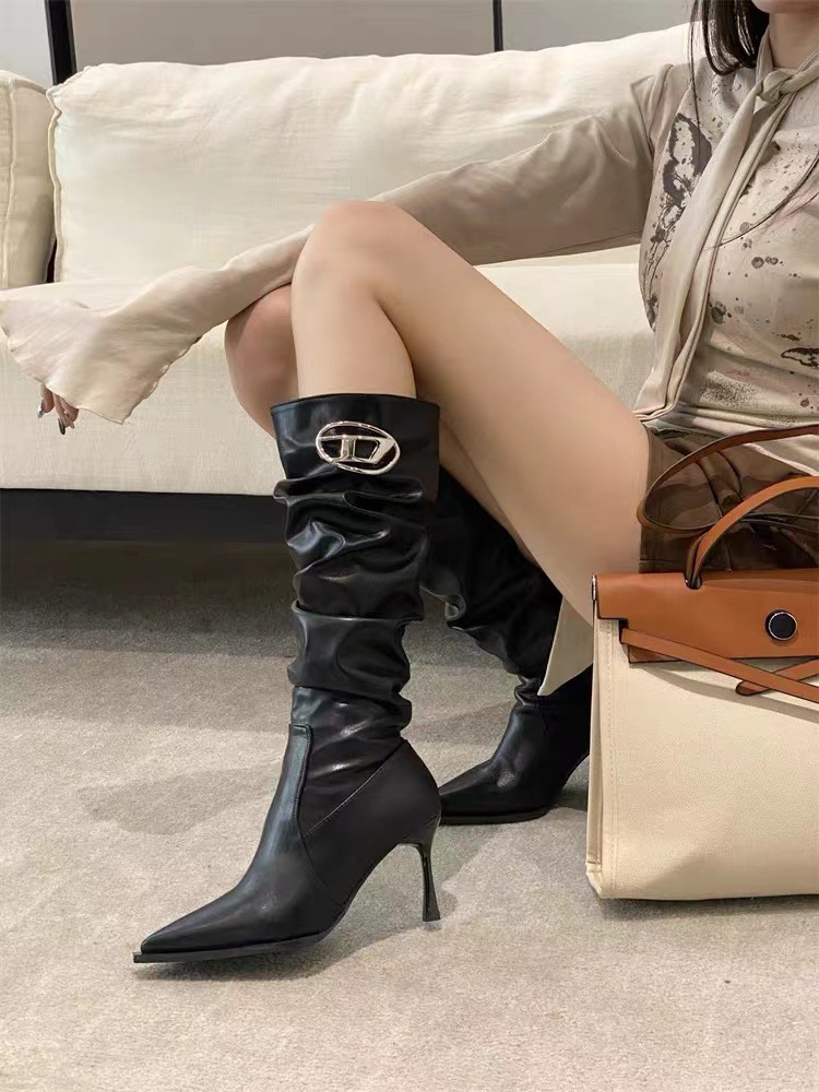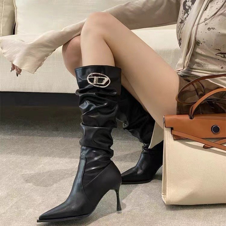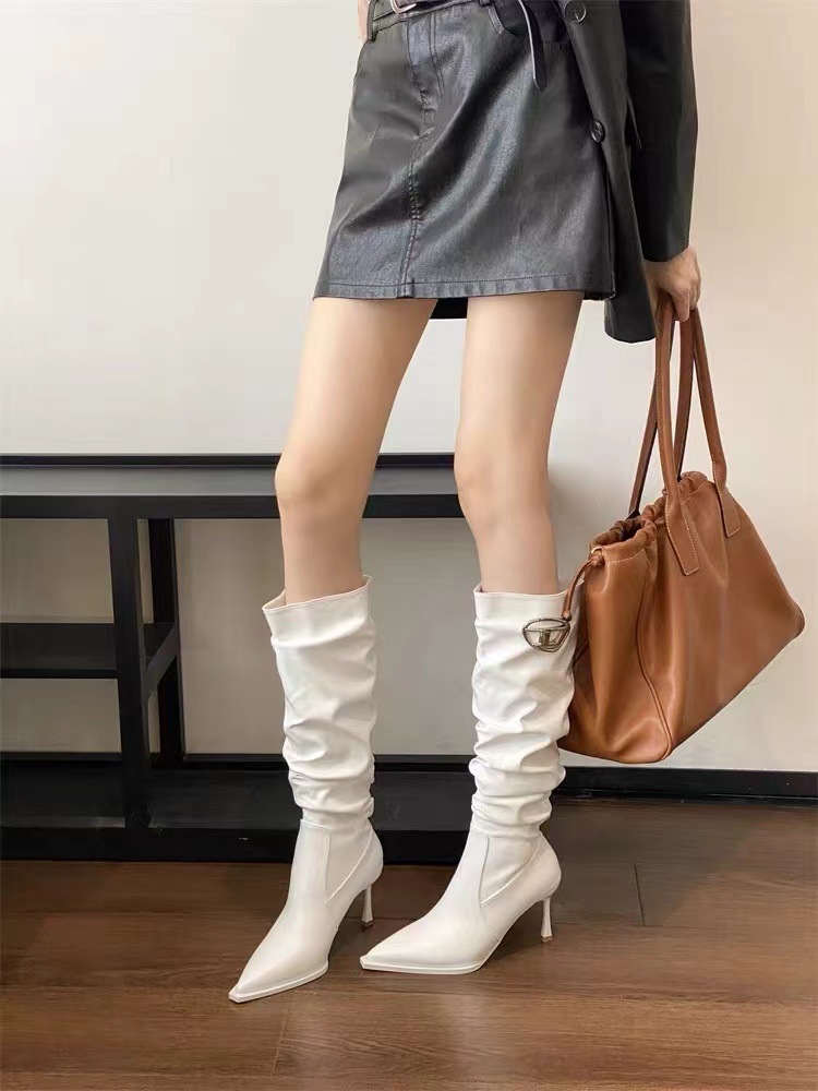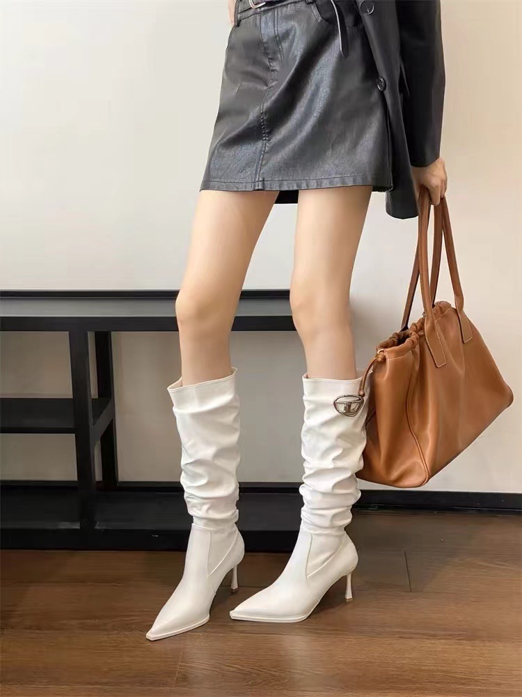 뾰족한 플리츠 하이 부츠 여자 2024 가을 얇은 힐 스택 부츠 하이힐이지만 무릎 롱 부츠 올 매치 세트스토어 가기
