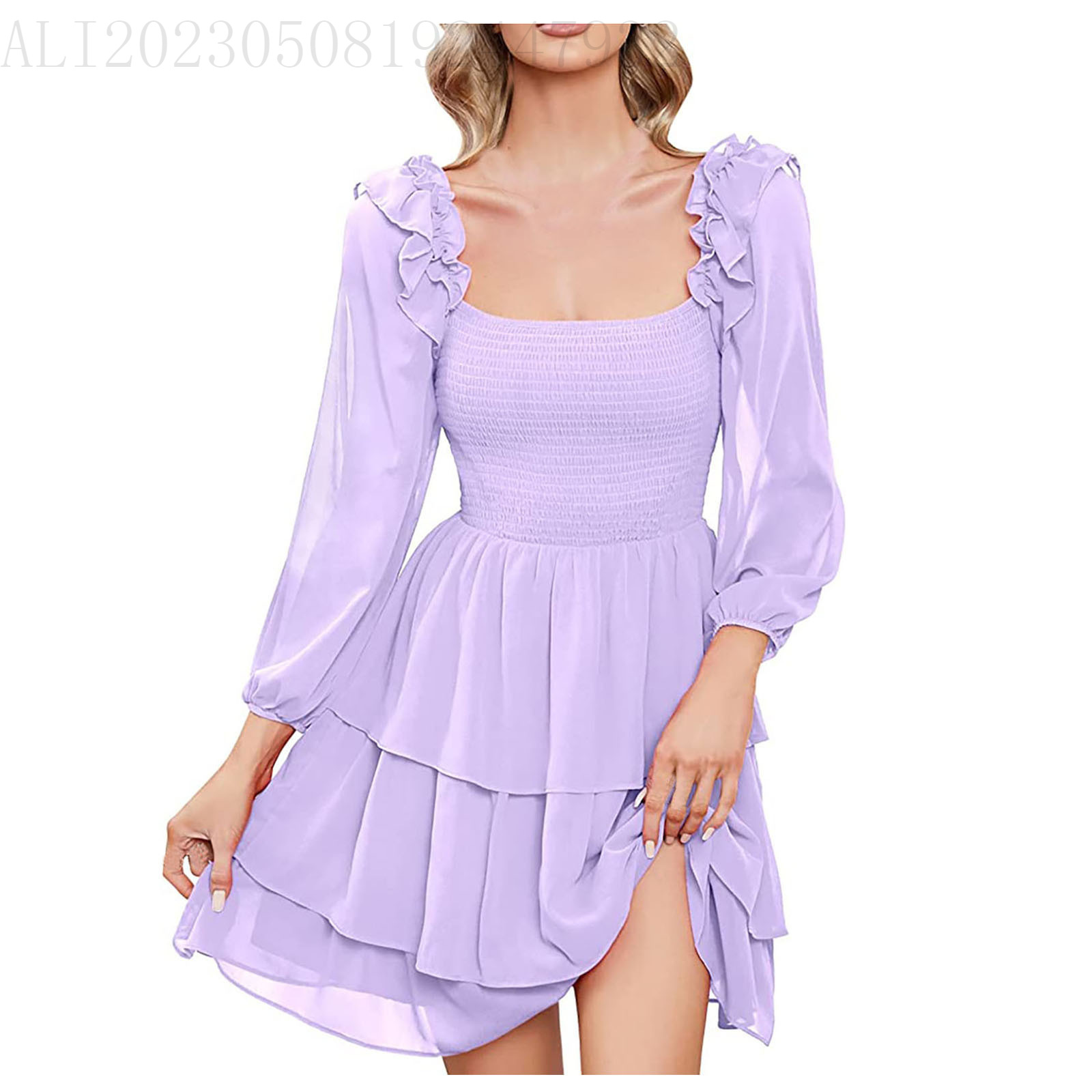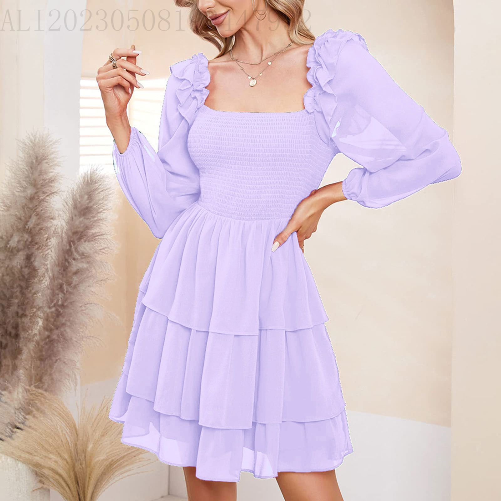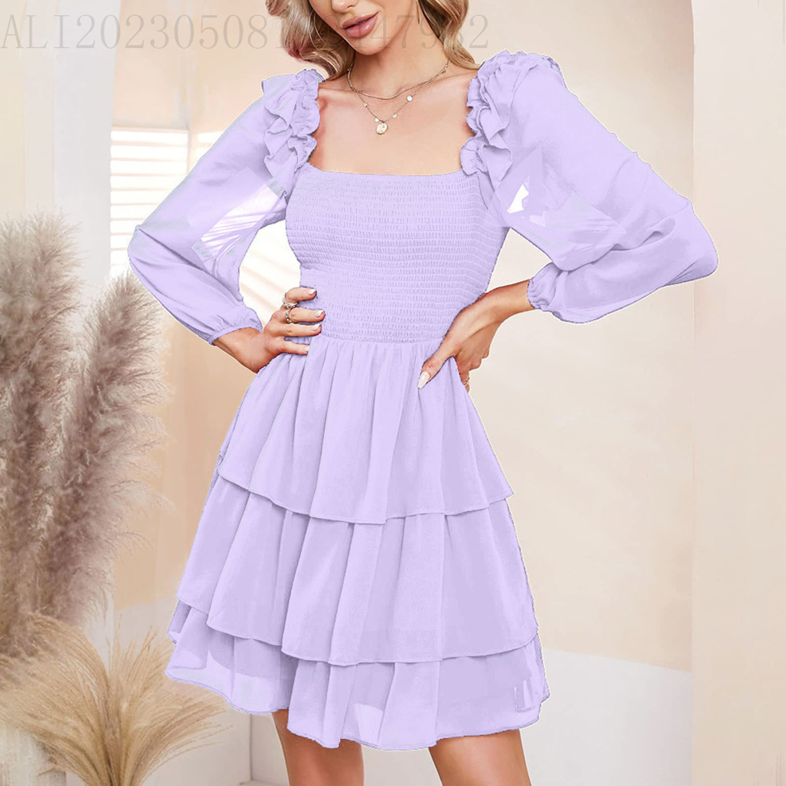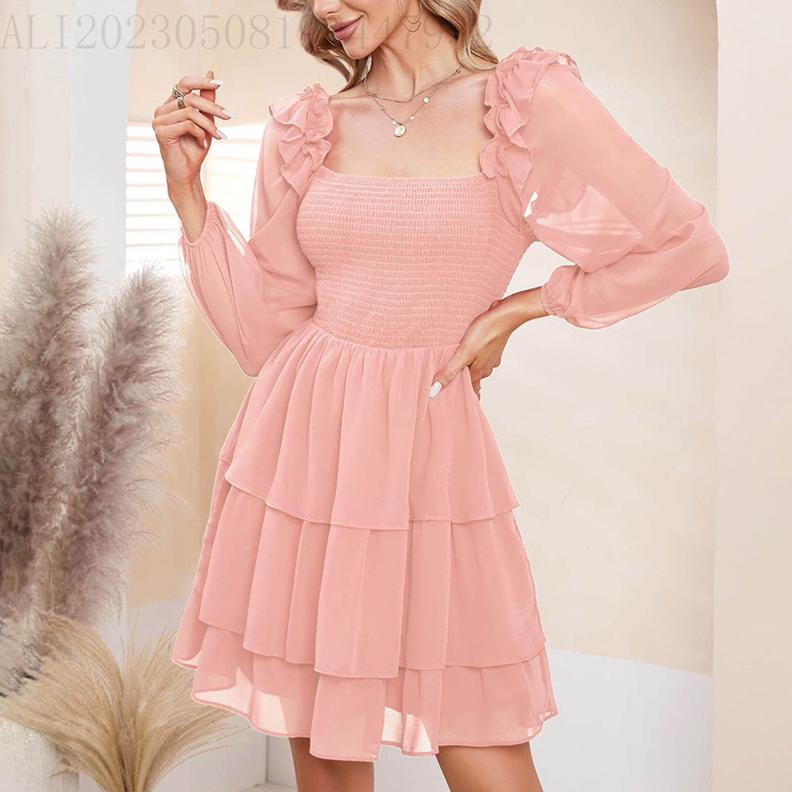 2025 아마존 알리익스프레스 독립 사이트 해외 여성복 주름 장식 러플 스퀘어넥 퍼프 소매 원피스