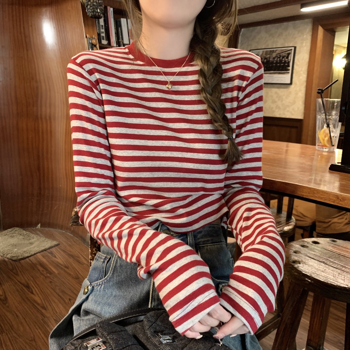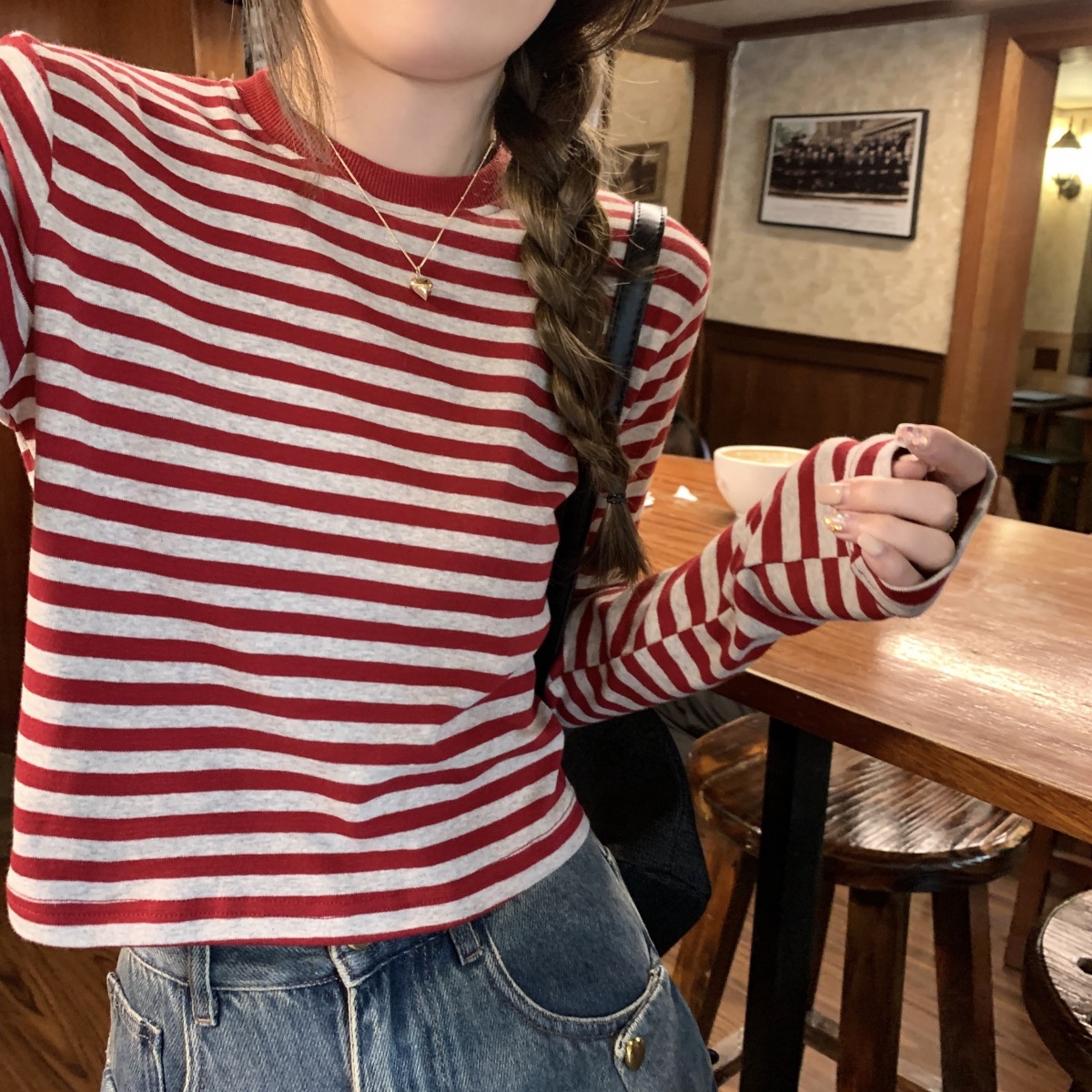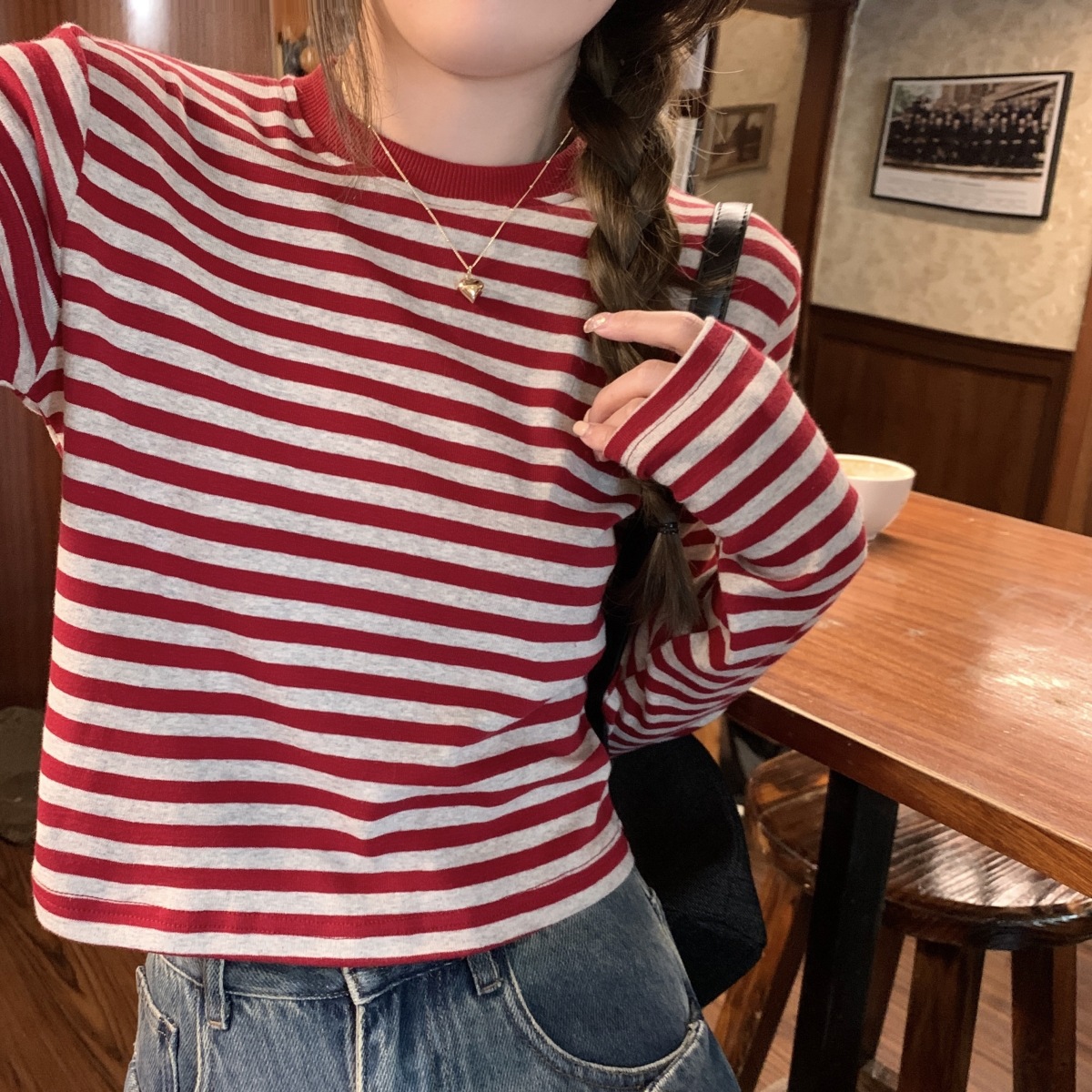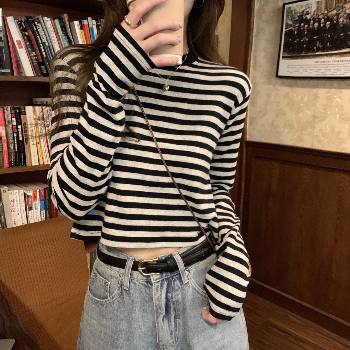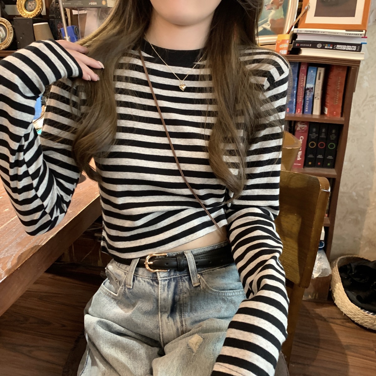 리얼 샷 이른 가을 새로운 한국 스타일 대비 스트라이프 짧은 디자인 올 매치 이너 긴 소매 여성용 티셔츠 탑 68493