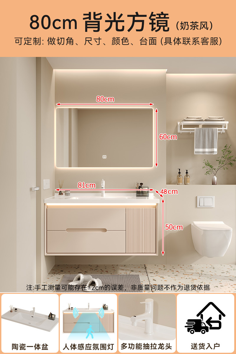 • 80 크림스타일 [백라이트 사각거울] + 인체감지 캐비닛, 집까지 포장
