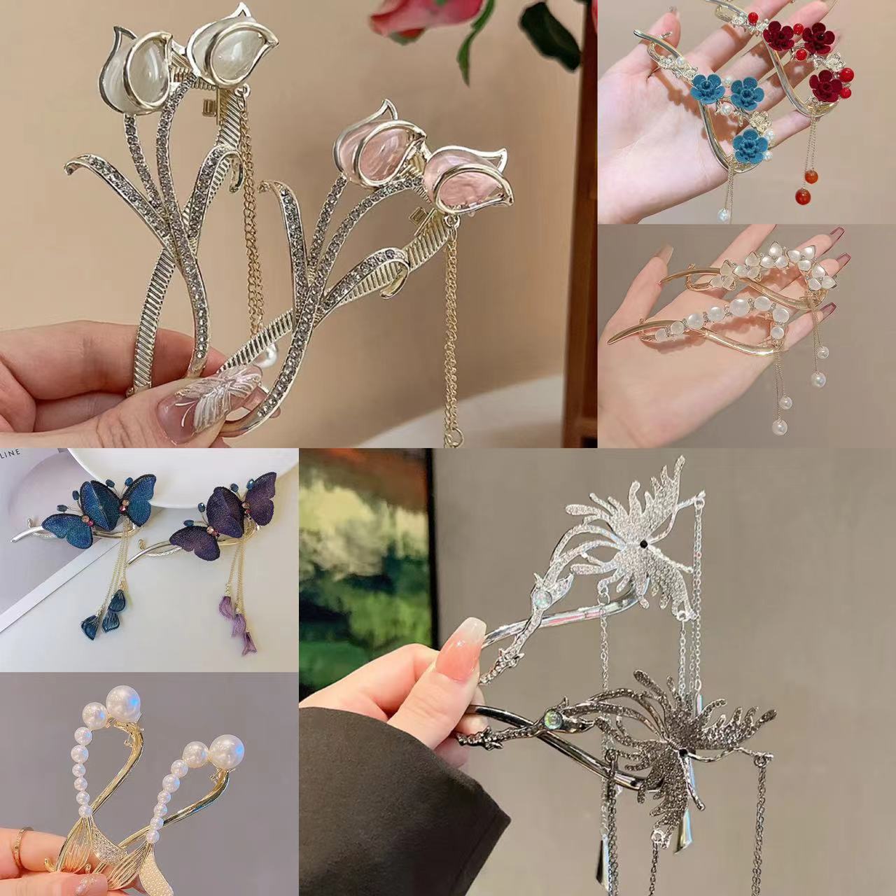 • 나비 6 붉은 꽃 트위스트 클립-골드
