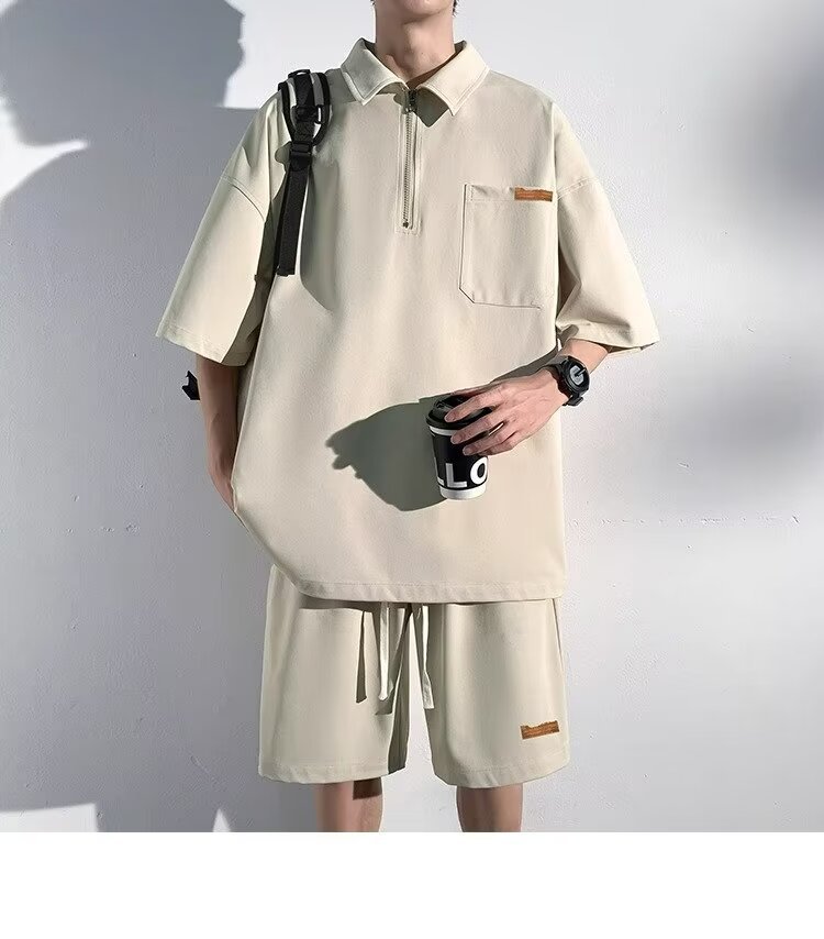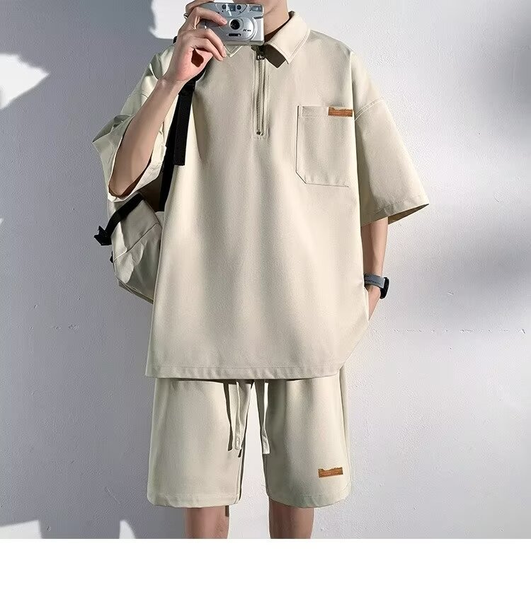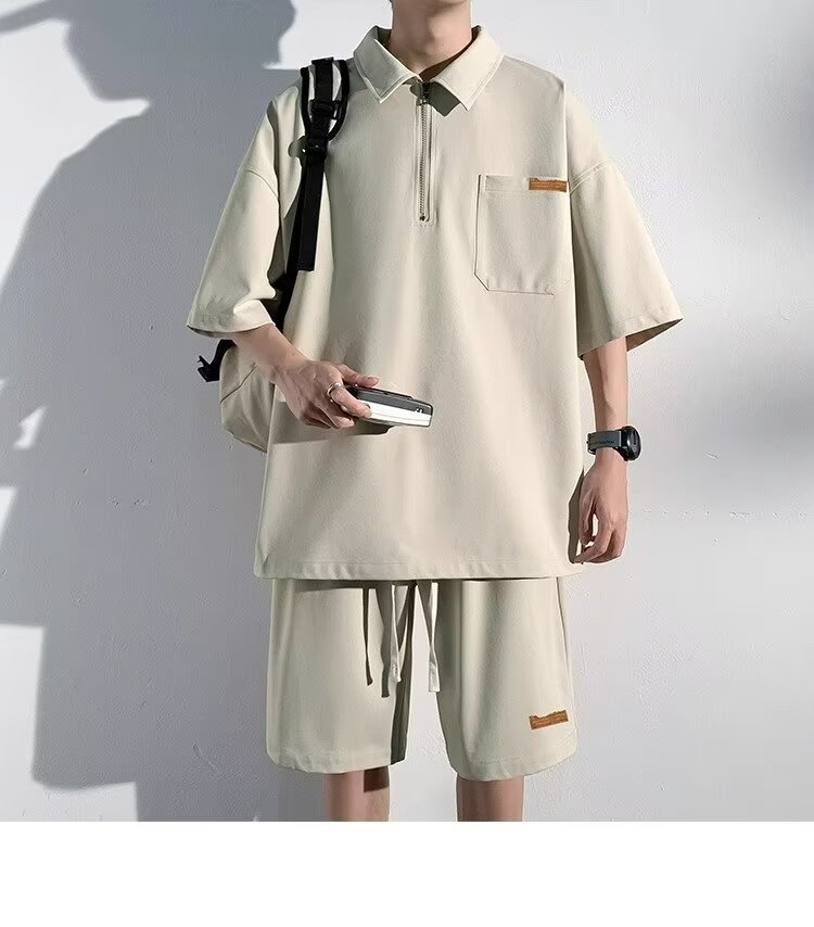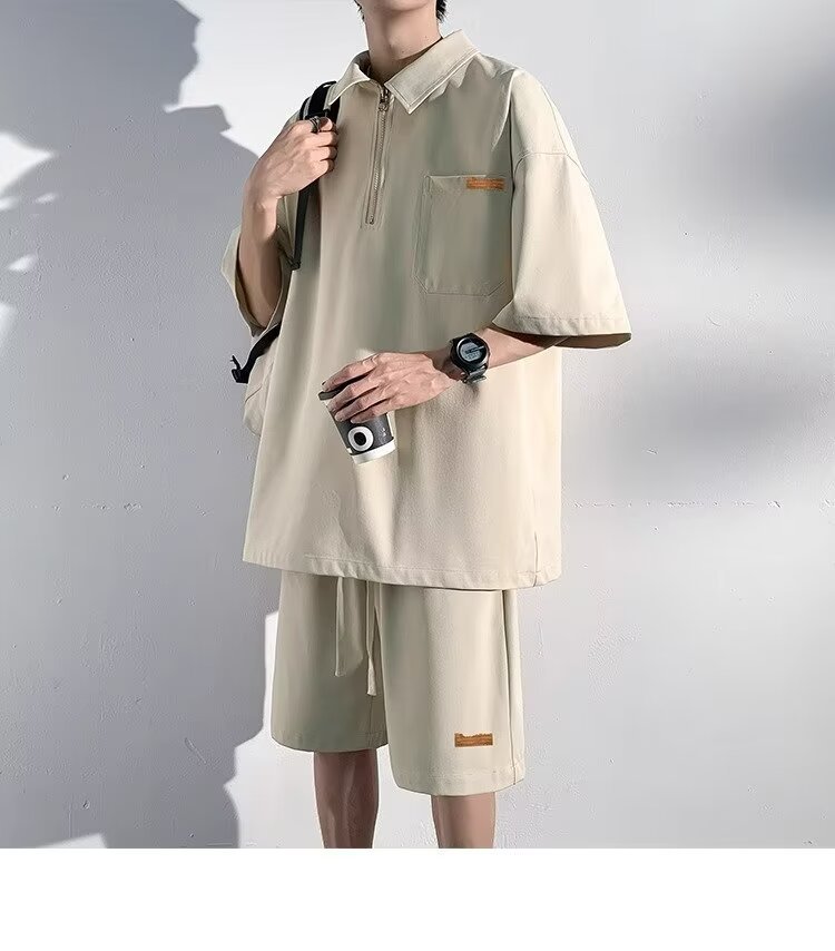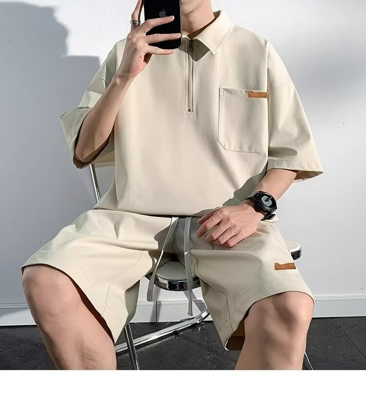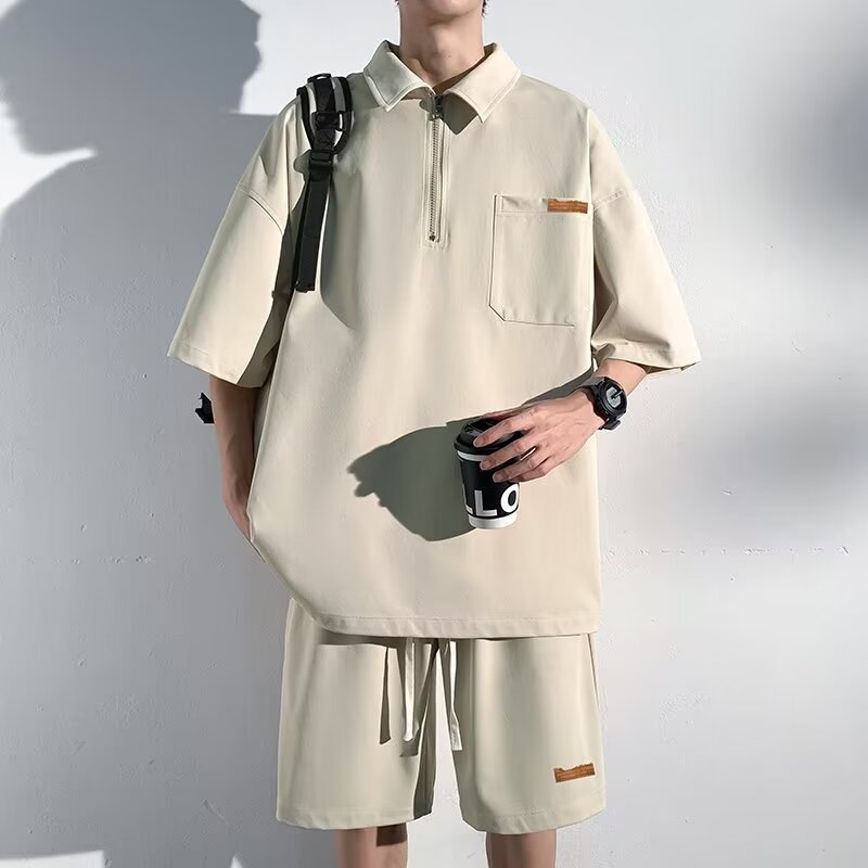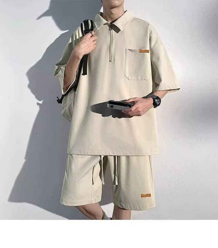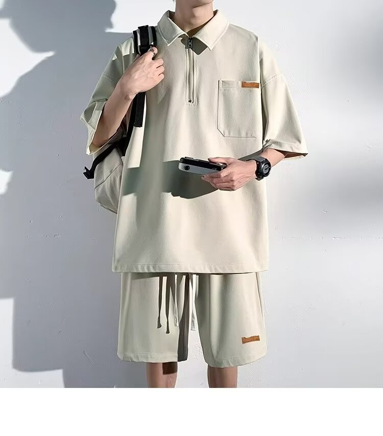 아이스 실크 세트 남성 일본식 패션 브랜드 청소년 느슨한 반쪽 바지 얇은 반 지퍼 폴로 셔츠 반바지 투피스 세트