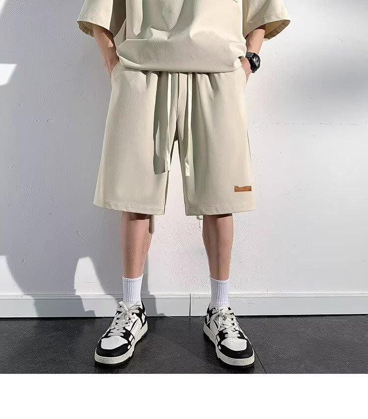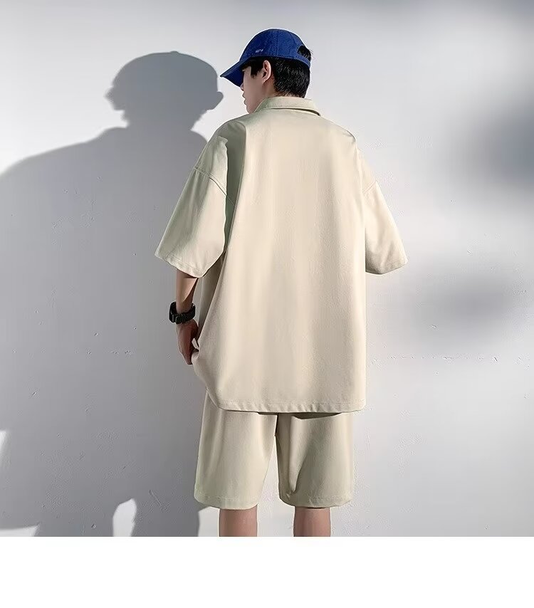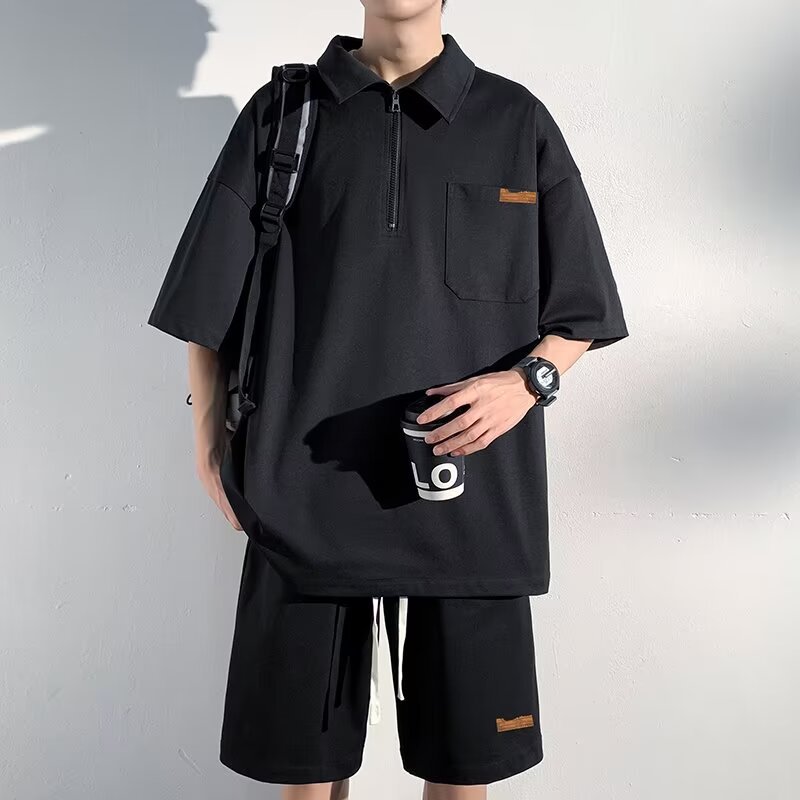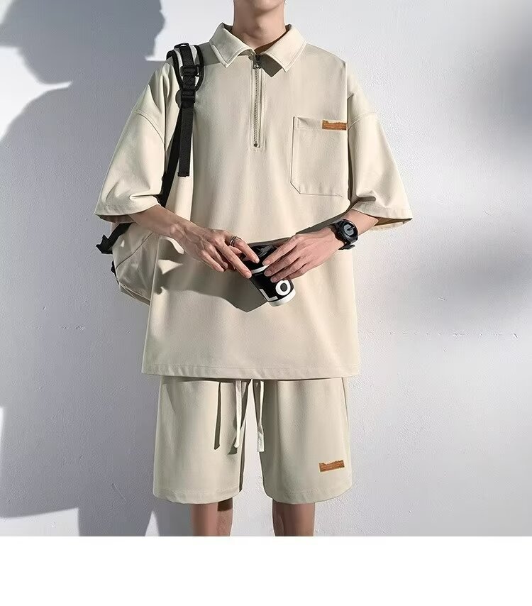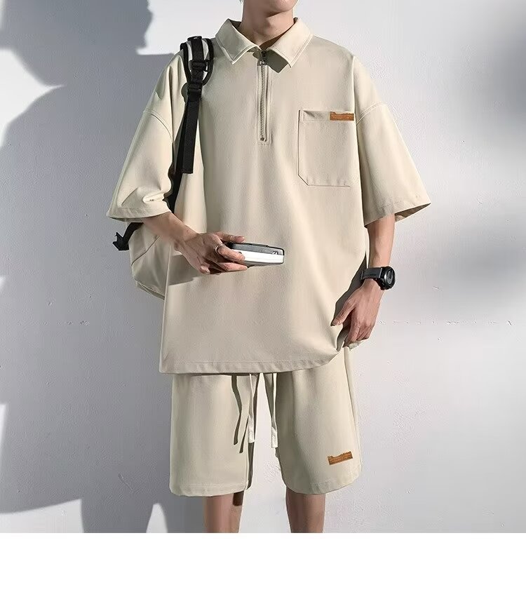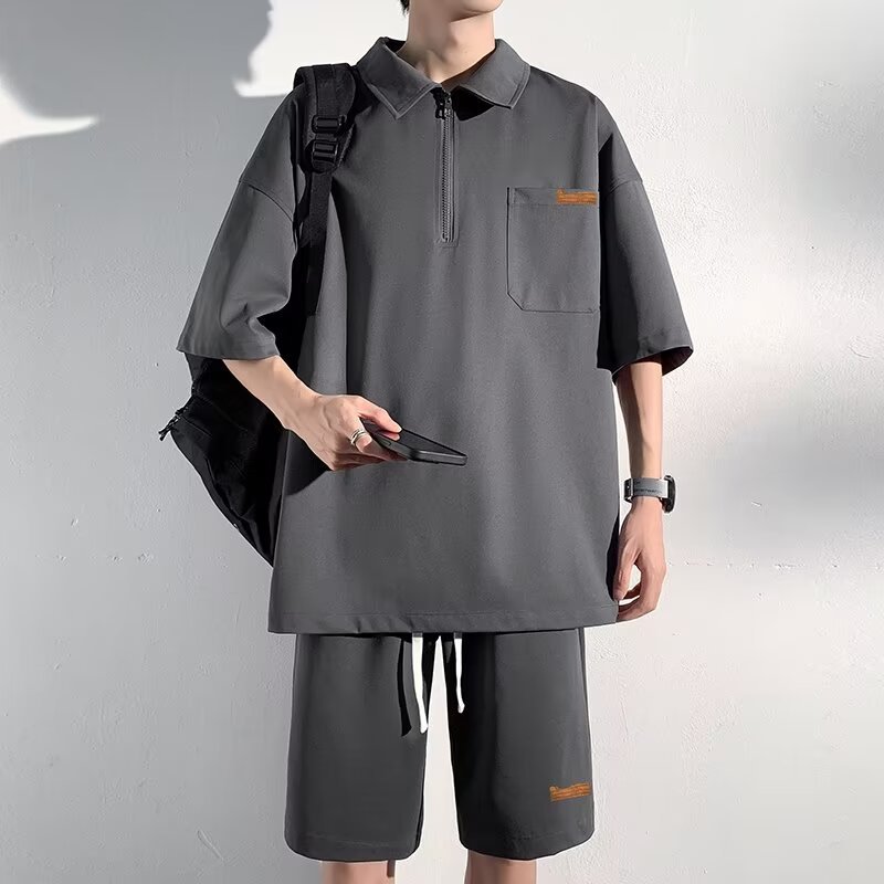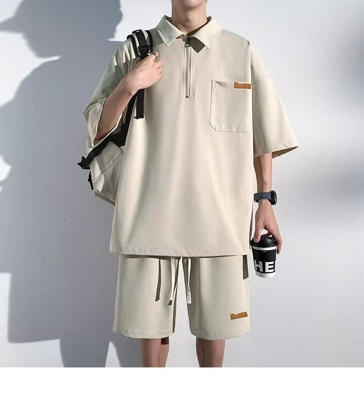 아이스 실크 세트 남성 일본식 패션 브랜드 청소년 느슨한 반쪽 바지 얇은 반 지퍼 폴로 셔츠 반바지 투피스 세트