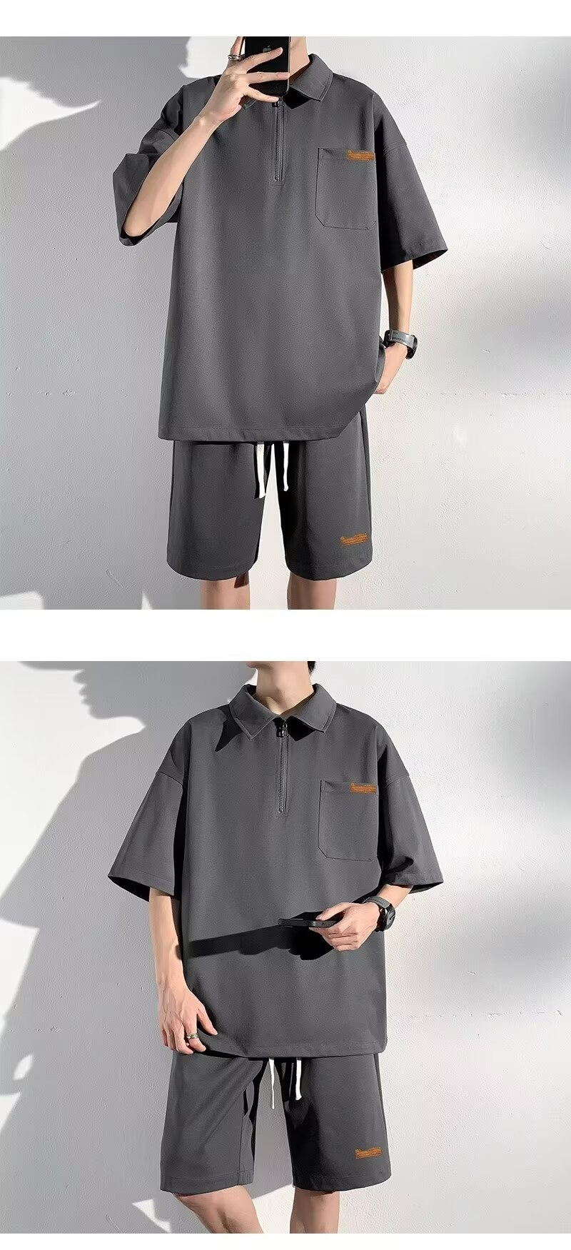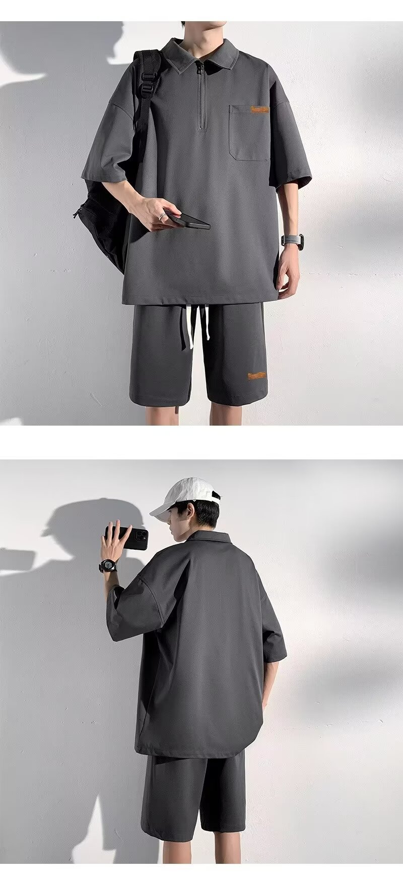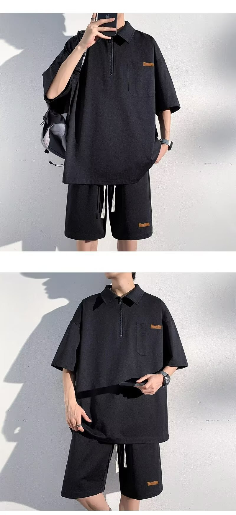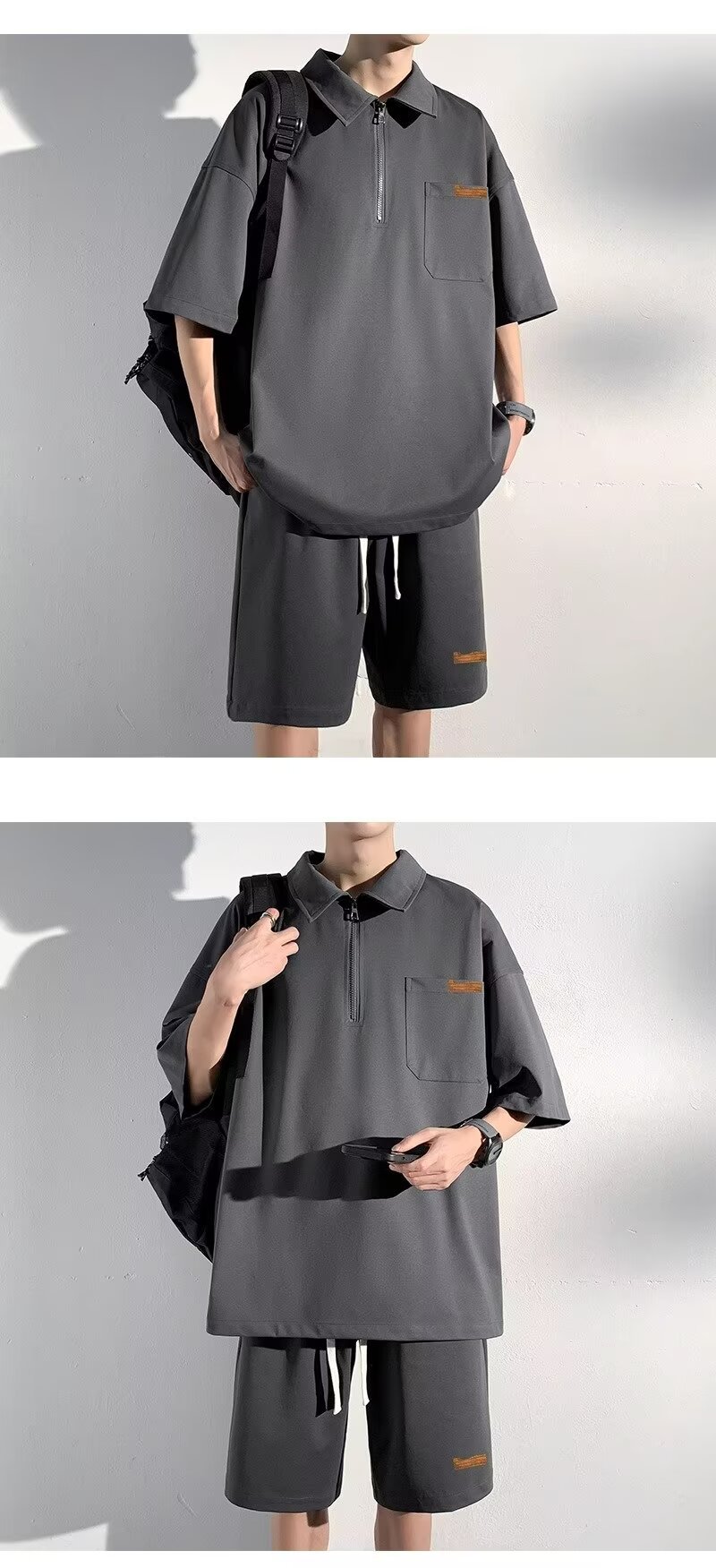 아이스 실크 세트 남성 일본식 패션 브랜드 청소년 느슨한 반쪽 바지 얇은 반 지퍼 폴로 셔츠 반바지 투피스 세트스토어 가기