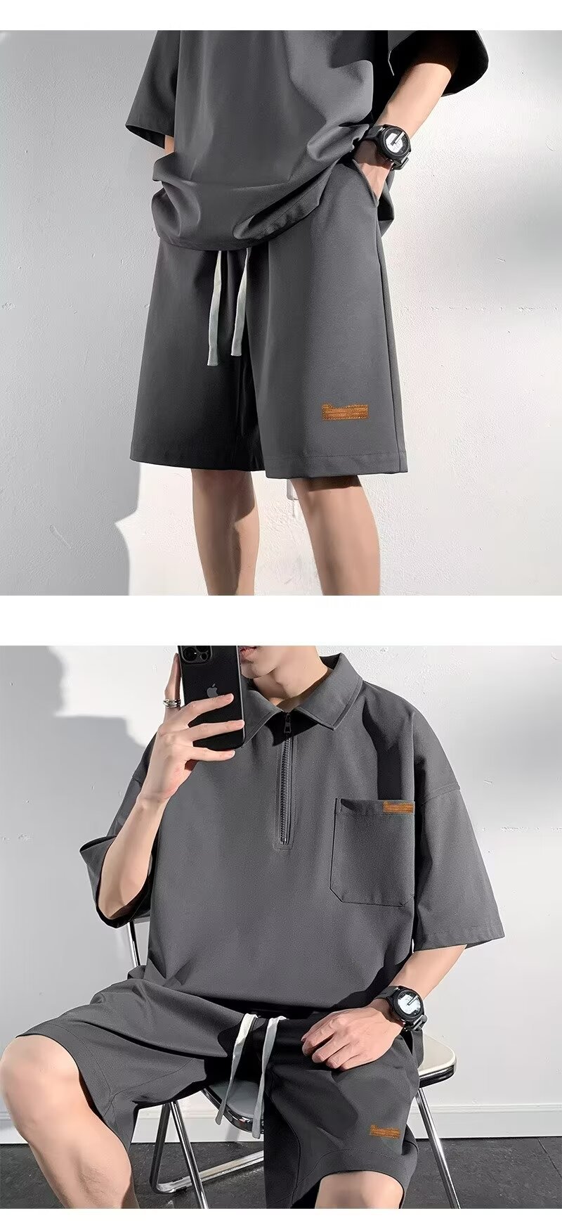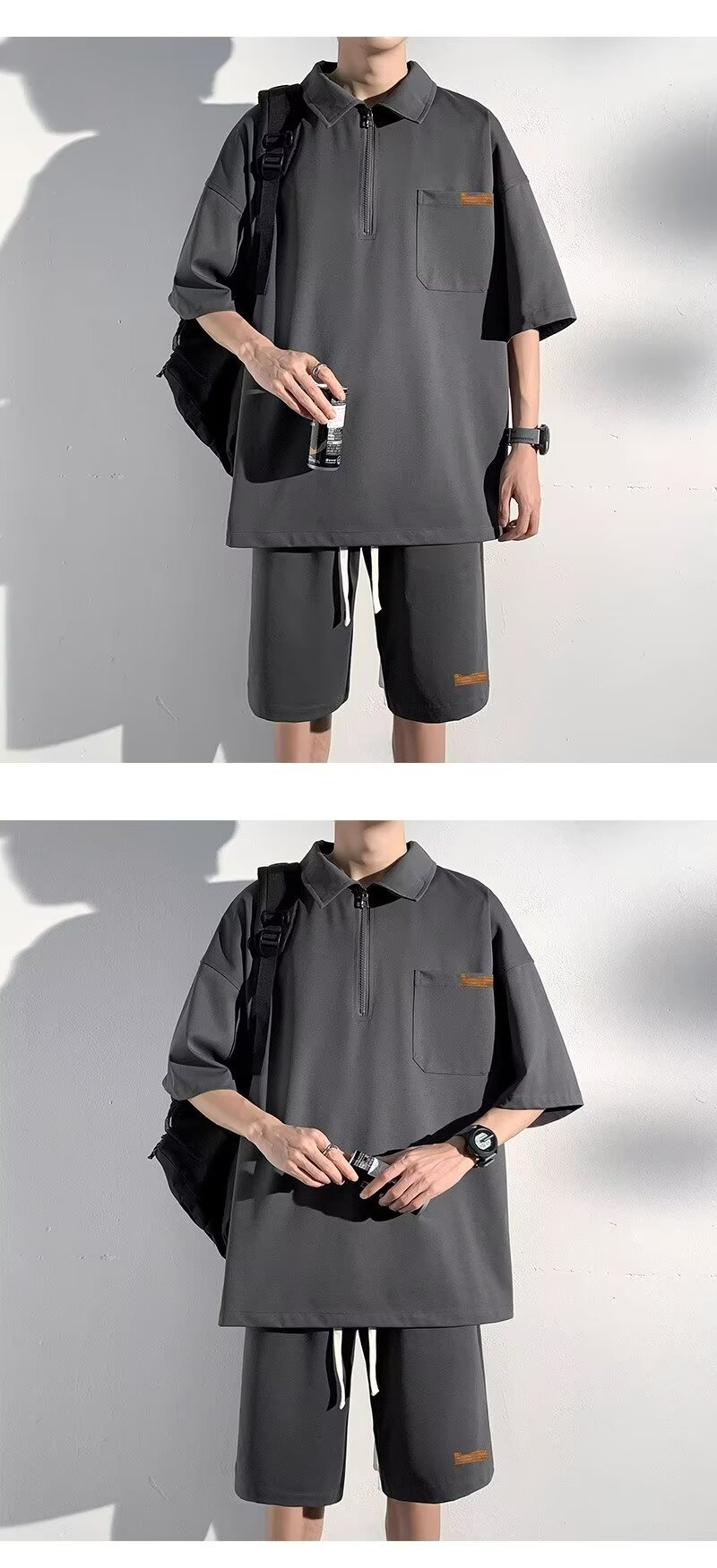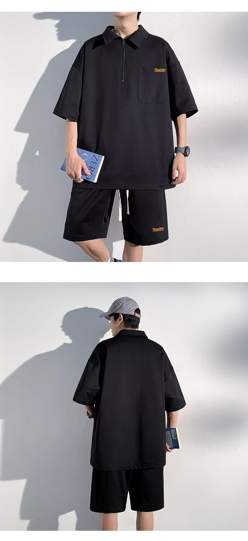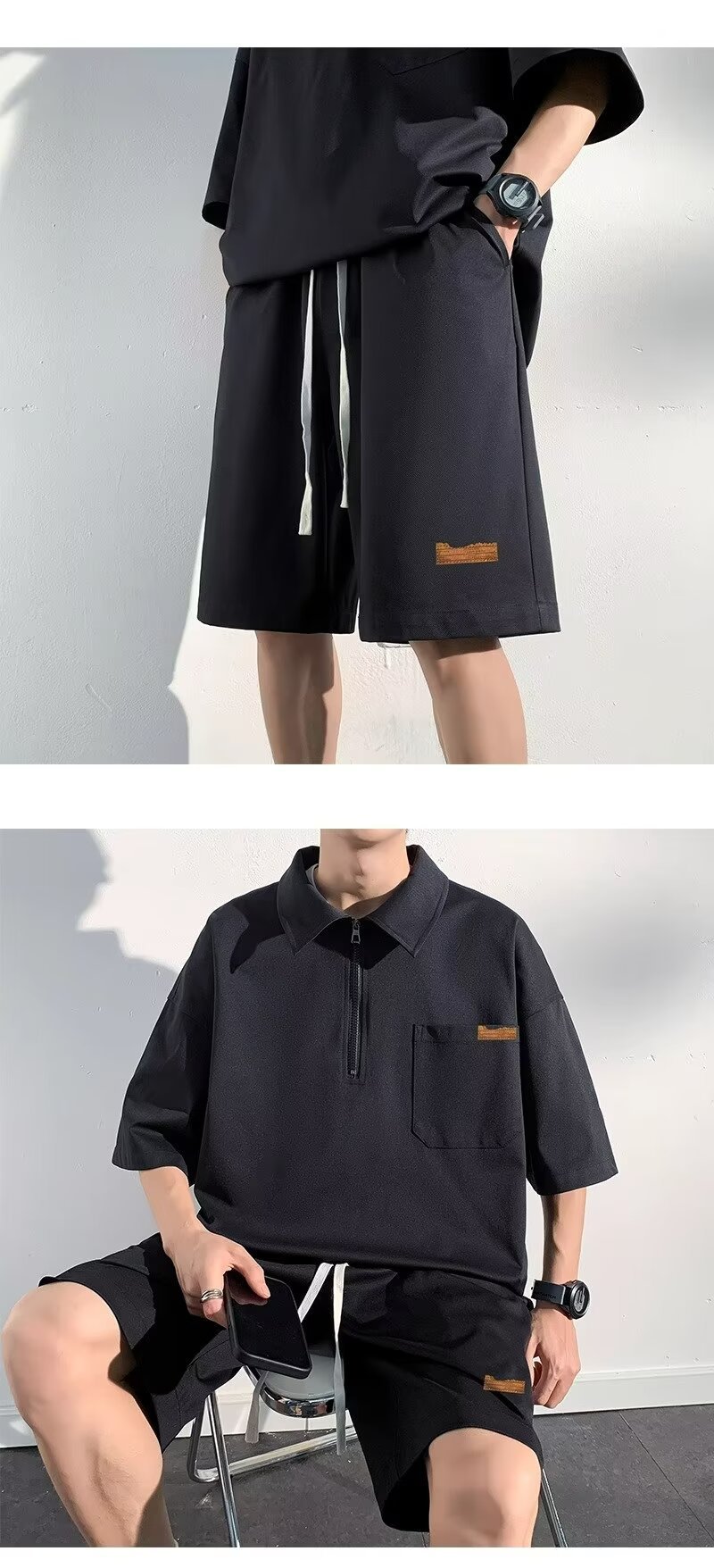 아이스 실크 세트 남성 일본식 패션 브랜드 청소년 느슨한 반쪽 바지 얇은 반 지퍼 폴로 셔츠 반바지 투피스 세트스토어 가기