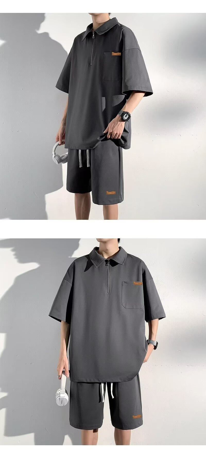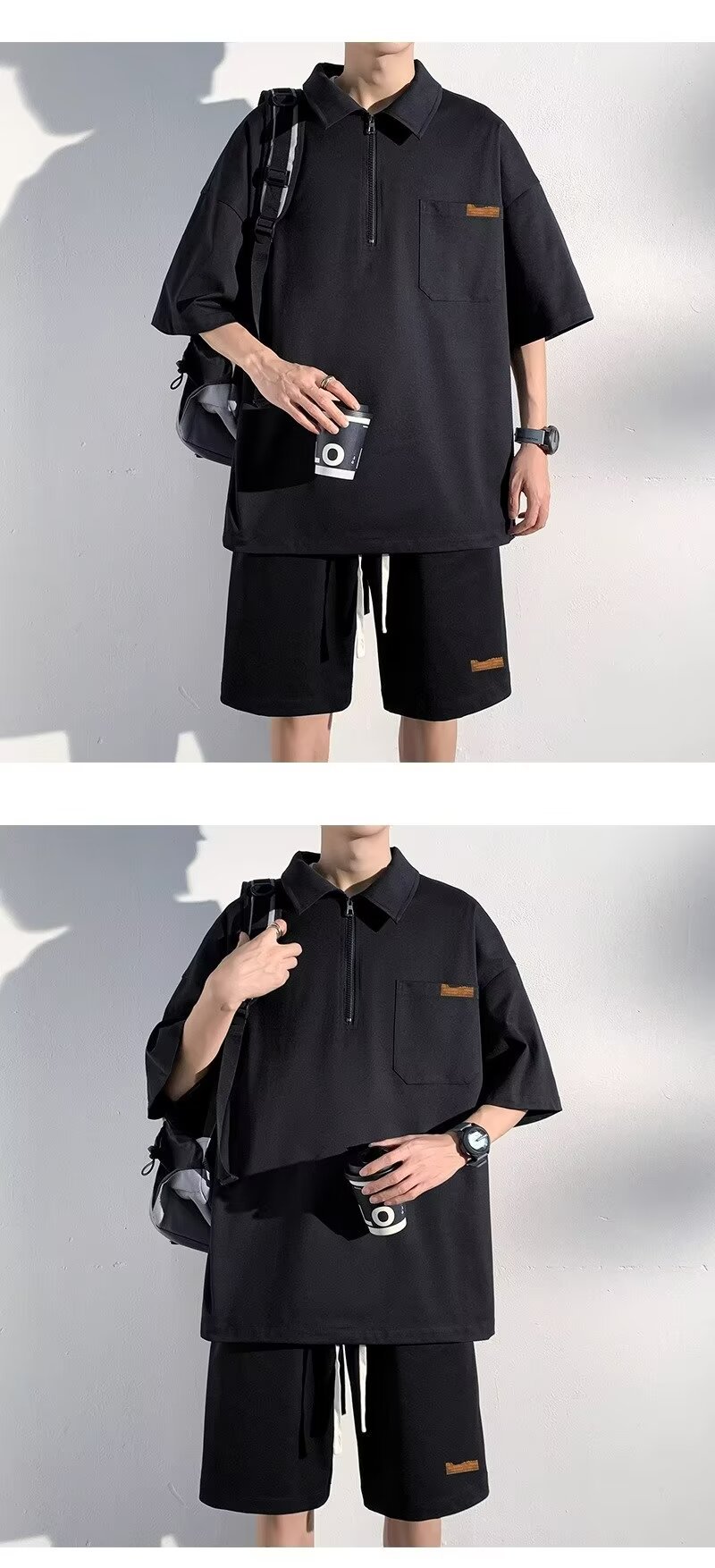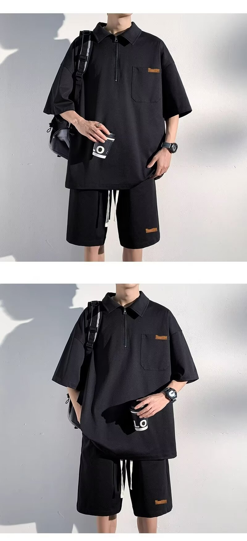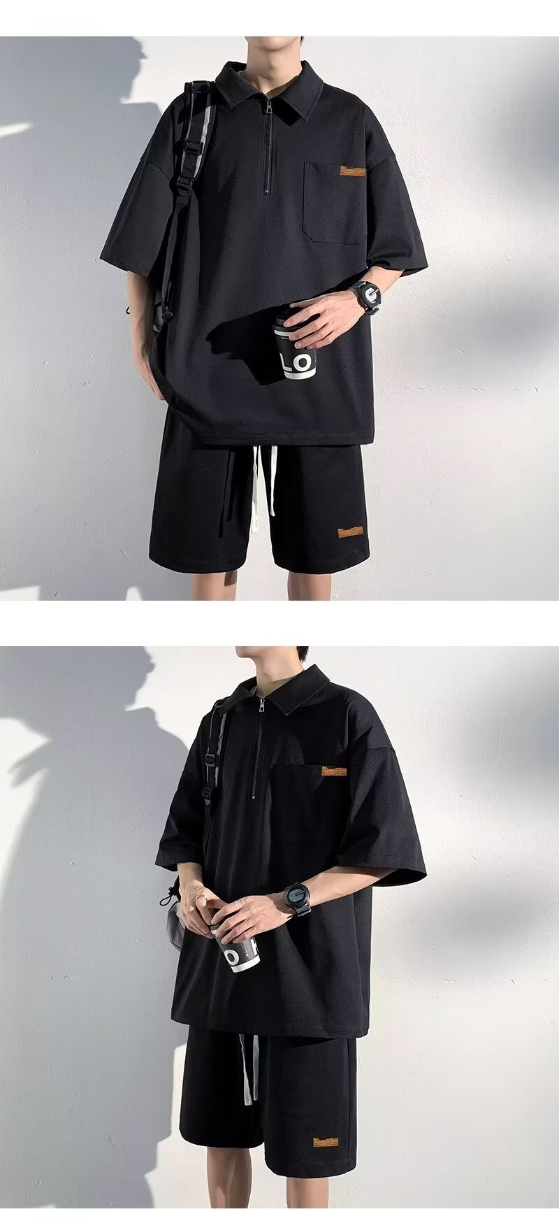 아이스 실크 세트 남성 일본식 패션 브랜드 청소년 느슨한 반쪽 바지 얇은 반 지퍼 폴로 셔츠 반바지 투피스 세트스토어 가기