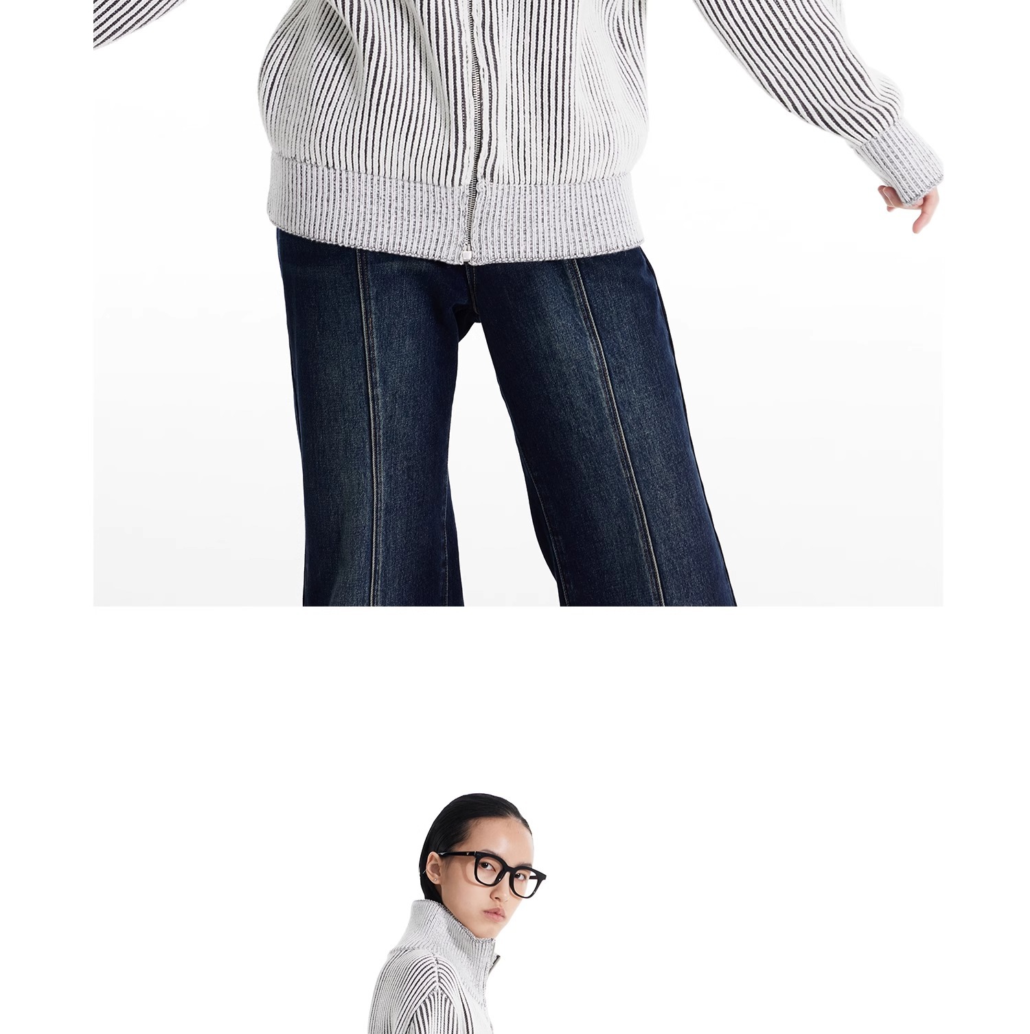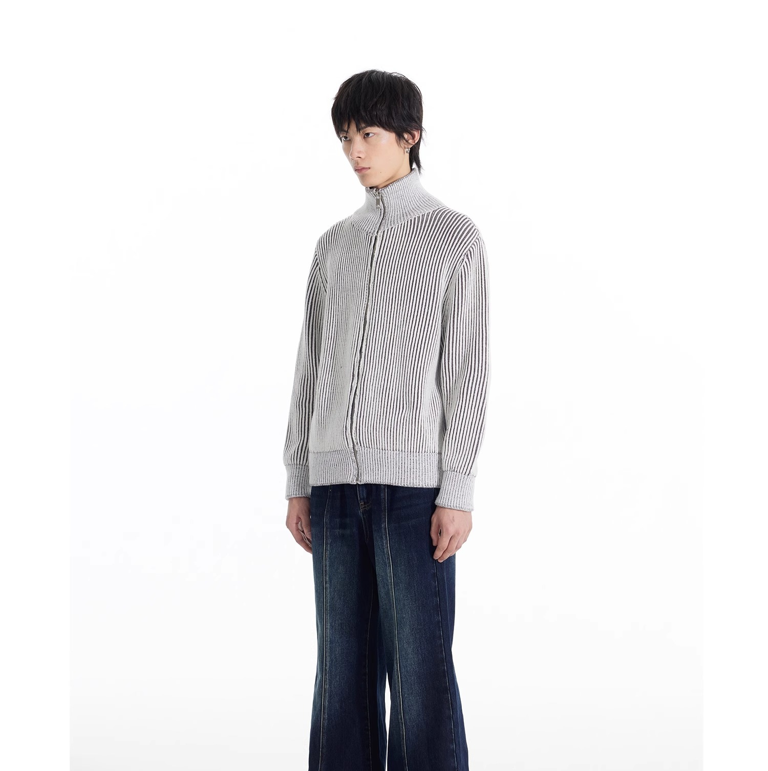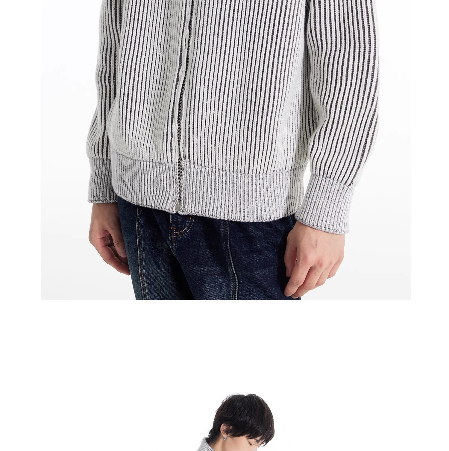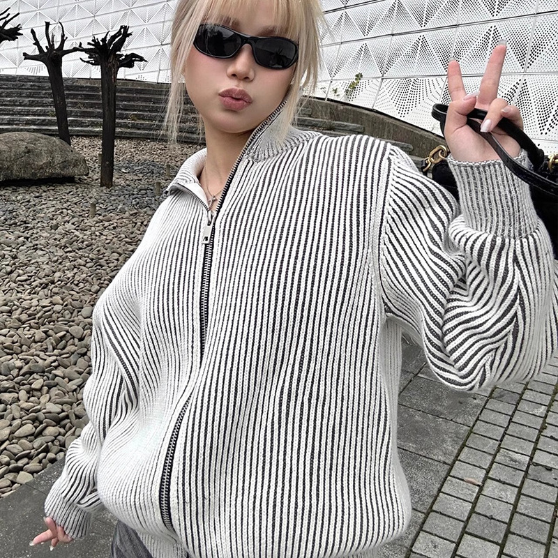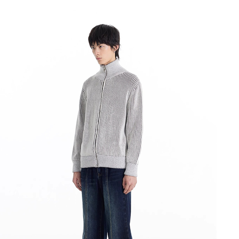 화이트 그레이 지퍼 수직 칼라 무거운 스웨터 두꺼운 줄무늬 니트 카디건 느슨한 재킷 남성과 여성의 느슨한 탑 트렌디스토어 가기