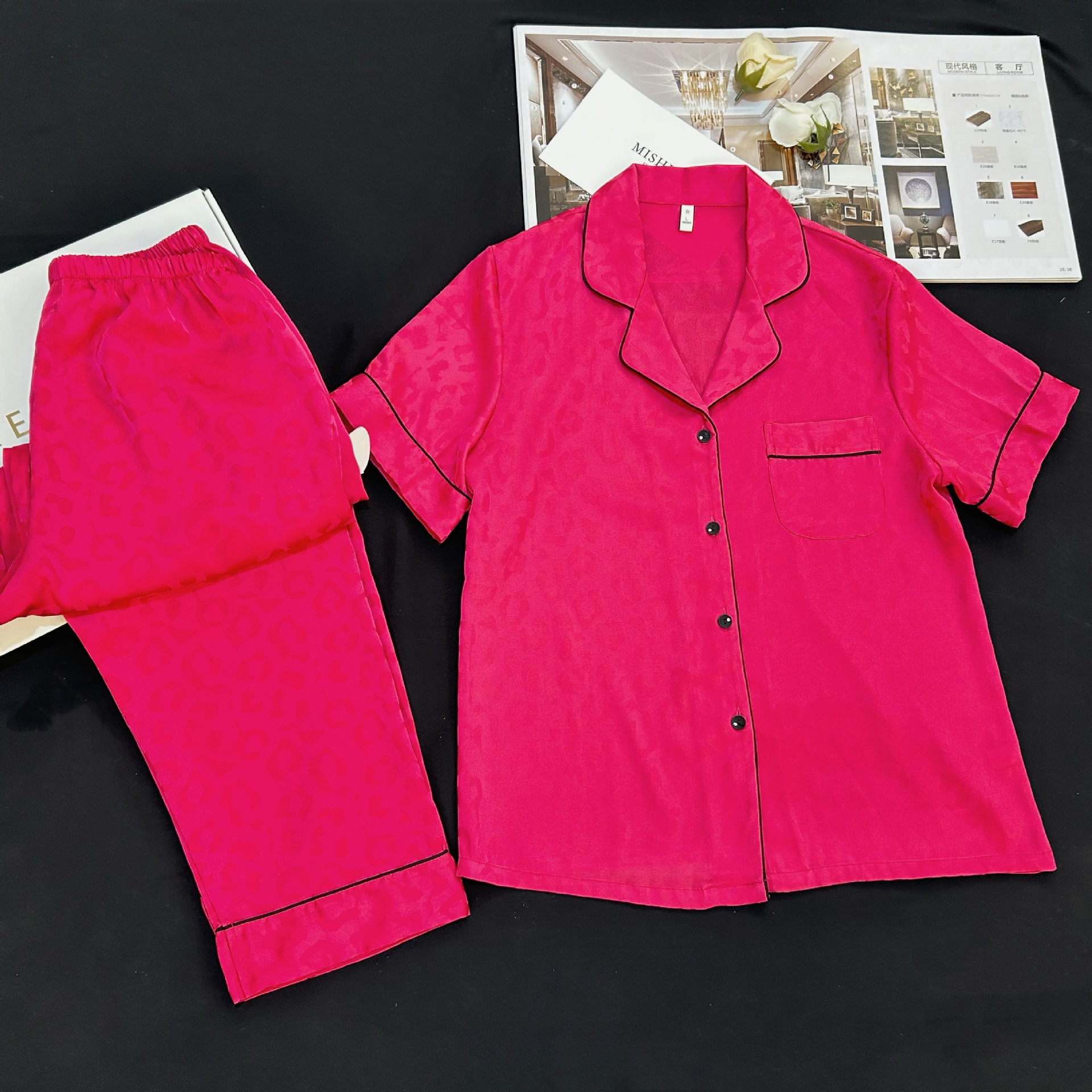 대외 무역 도매 레오파드 무늬 자카드 남성과 여성의 얼음과 눈 실크 파자마 짧은 소매 바지가 작은 빨간 책 국경 간 집 옷을 떨립니다.