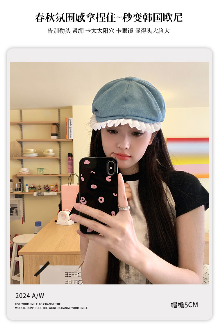 레이스 데님 포워드 모자 여자 빈티지 빅 헤드, 일본 스타일 얇은 올 매치 얼굴 작은 뉴스 보이 모자스토어 가기