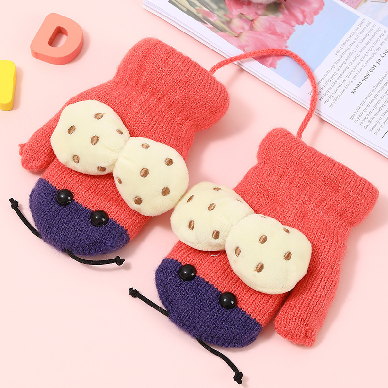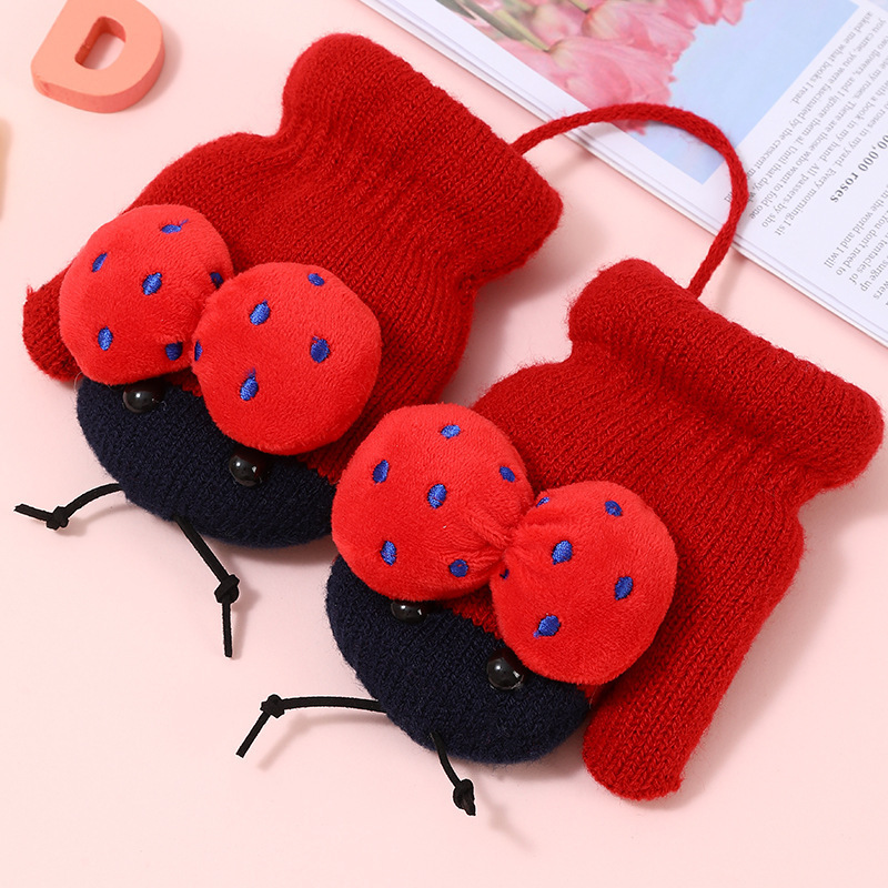 어린이용 겨울 장갑, 새로운 스타일의 벨벳 안감, 귀여운 만화 무당벌레 디자인, 니트 소재, 손가락 덮개, 성인용, 끈으로 묶는, 따뜻한 5손가락 장갑