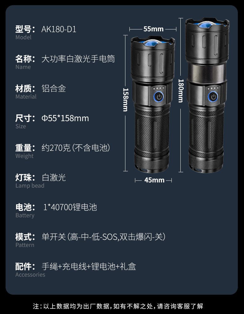 • AK180-D1 단일 손전등(배터리는 포함되어 있지 않음)