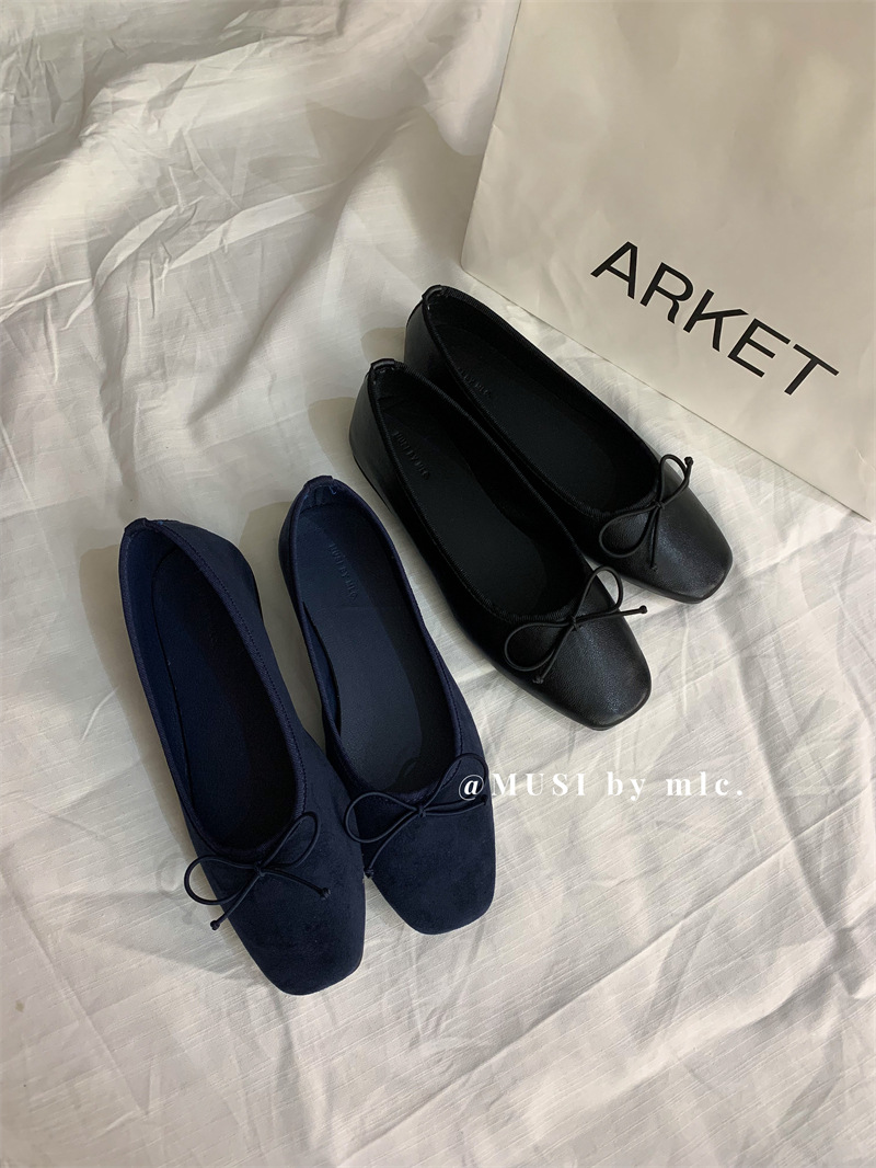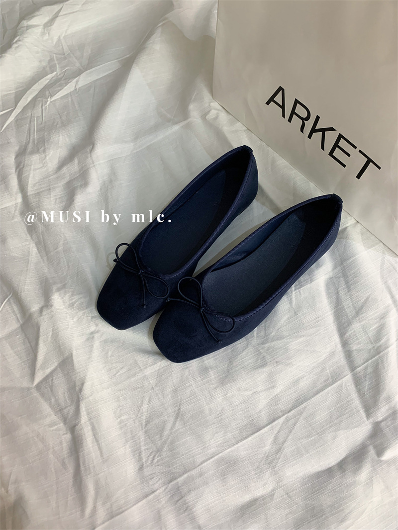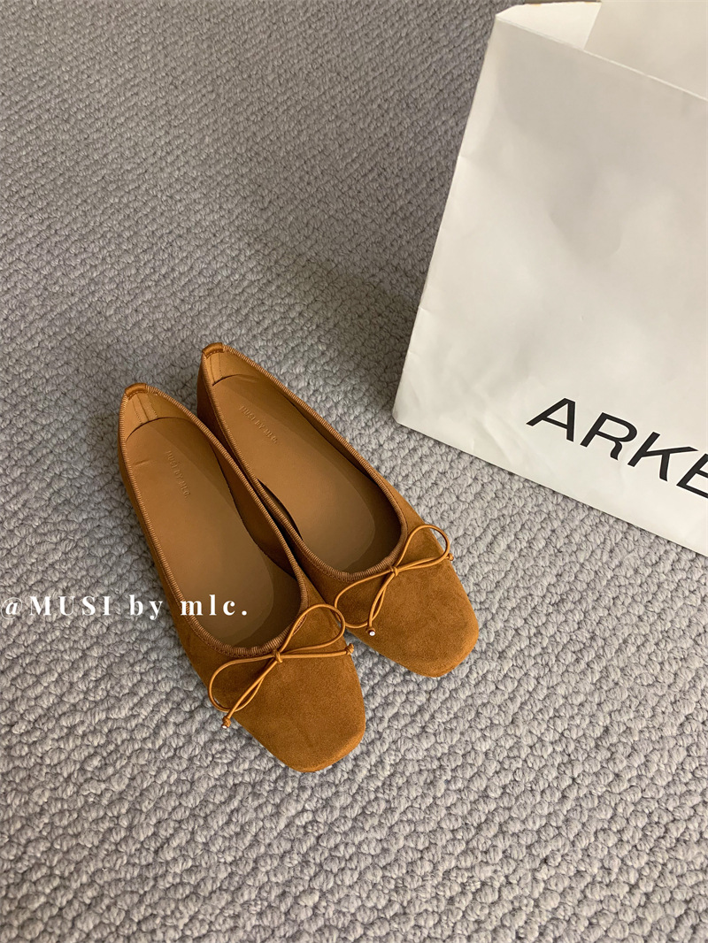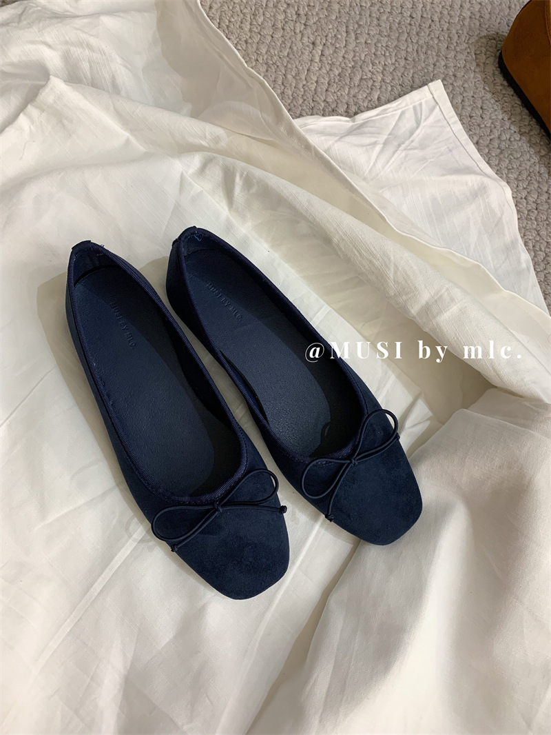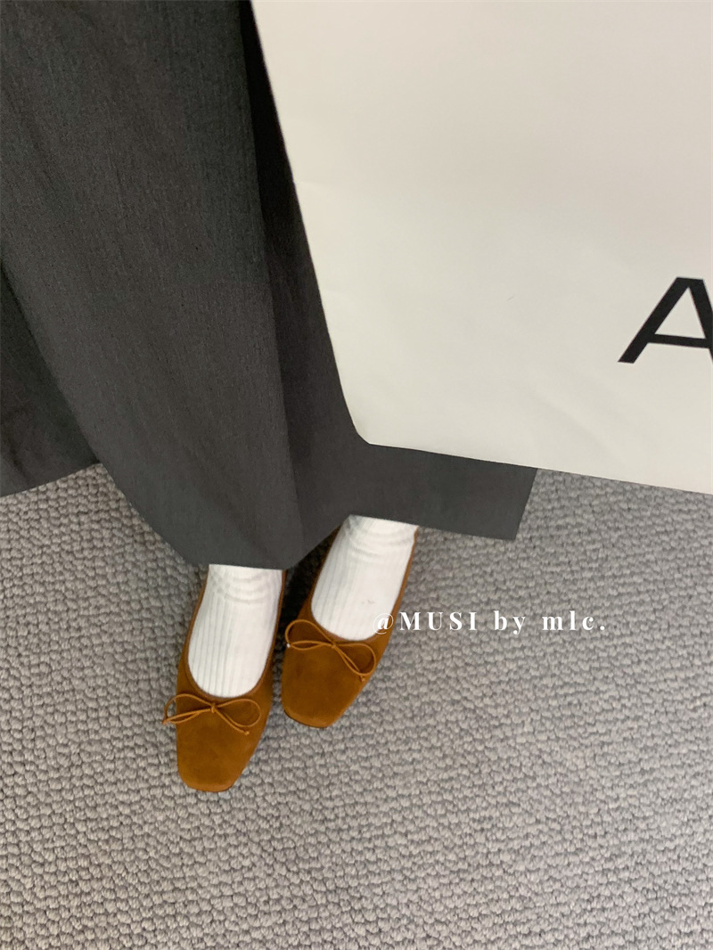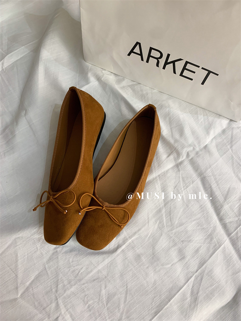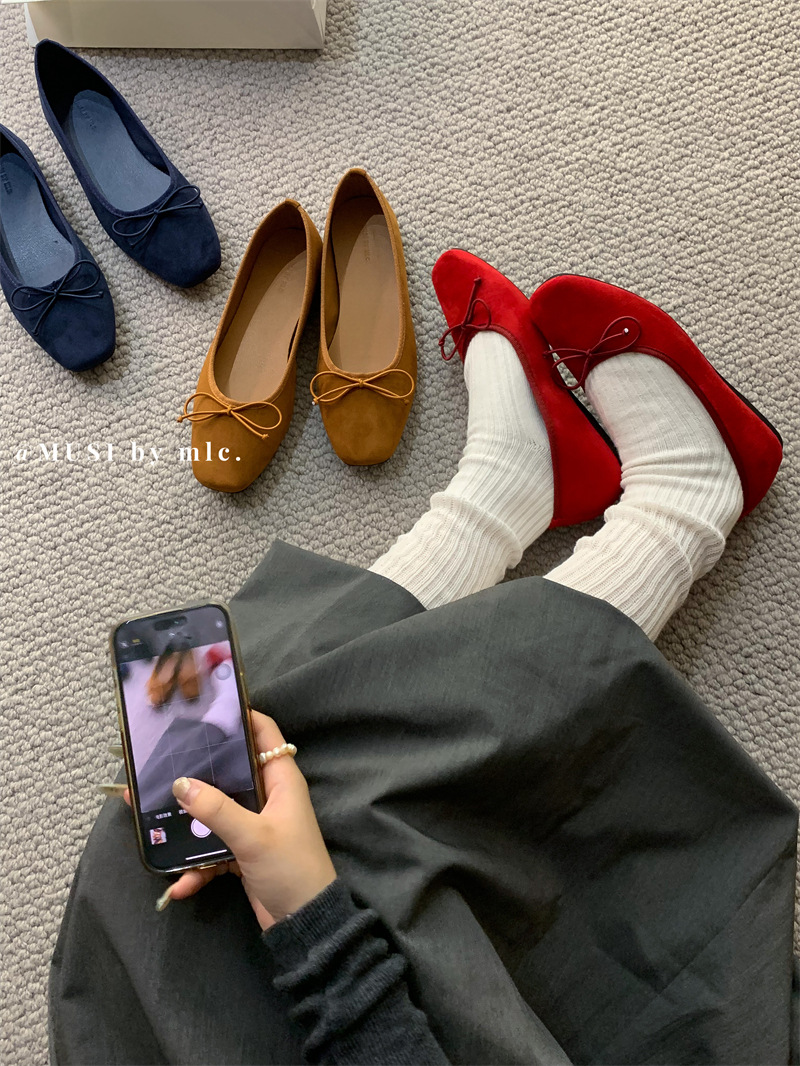 스웨이드 소재의 작은 사각 앞코 얕은 구두, 2025 가을 신상 리본 장식의 우아한 플랫 가죽 신발, 패셔너블한 스쿠프 슈즈, 부드러운 가죽스토어 가기