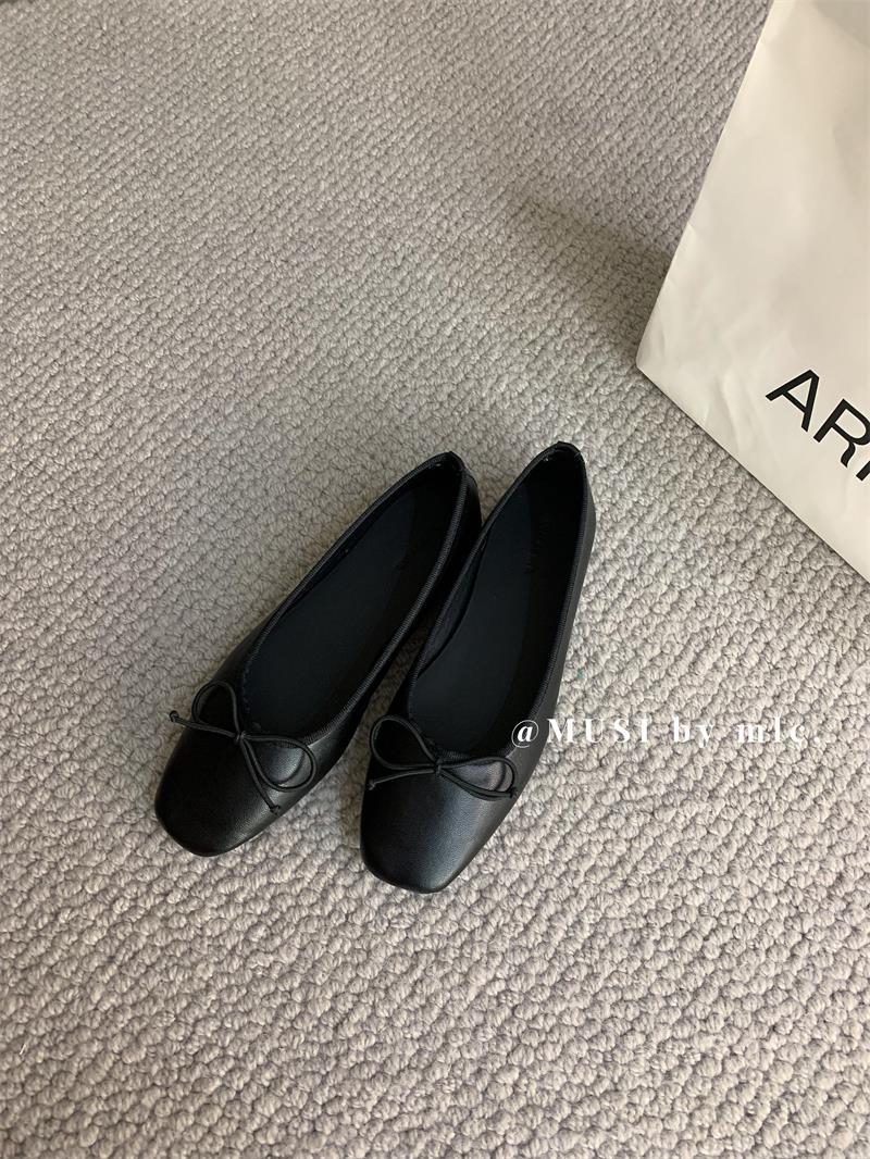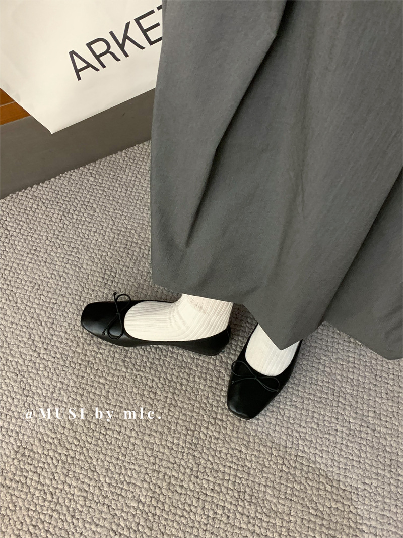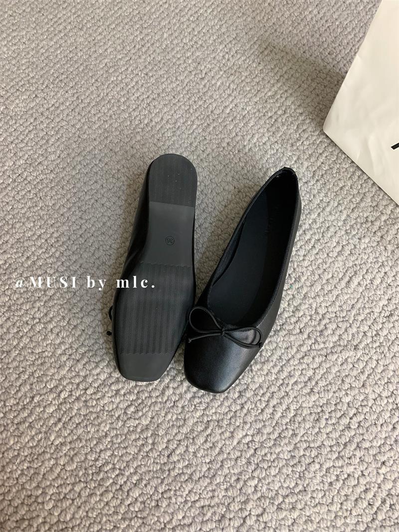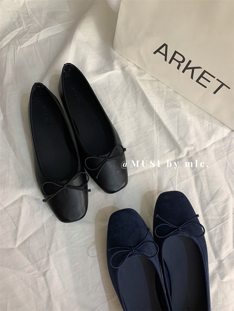 스웨이드 소재의 작은 사각 앞코 얕은 구두, 2025 가을 신상 리본 장식의 우아한 플랫 가죽 신발, 패셔너블한 스쿠프 슈즈, 부드러운 가죽