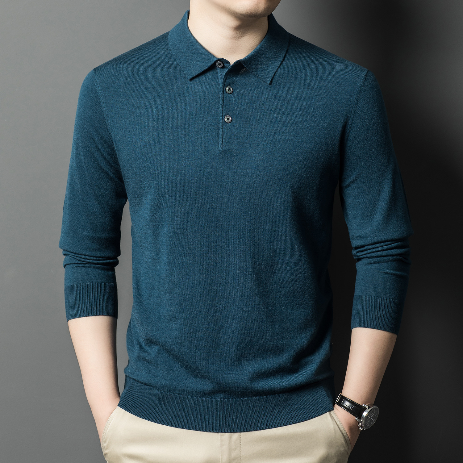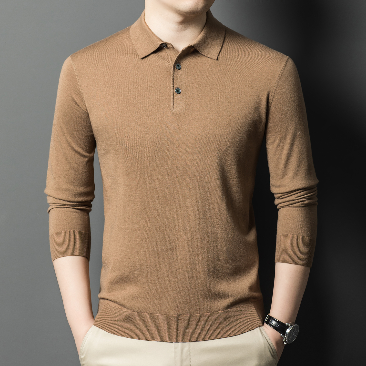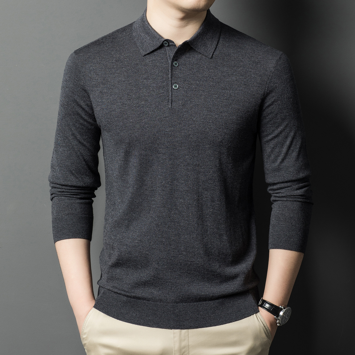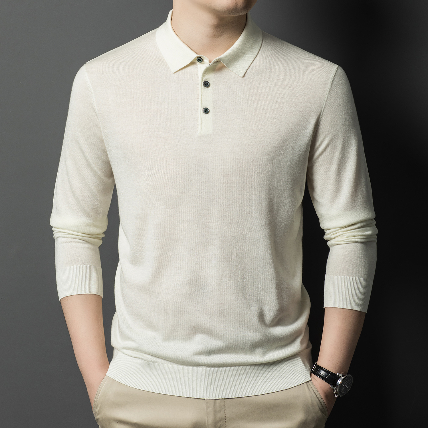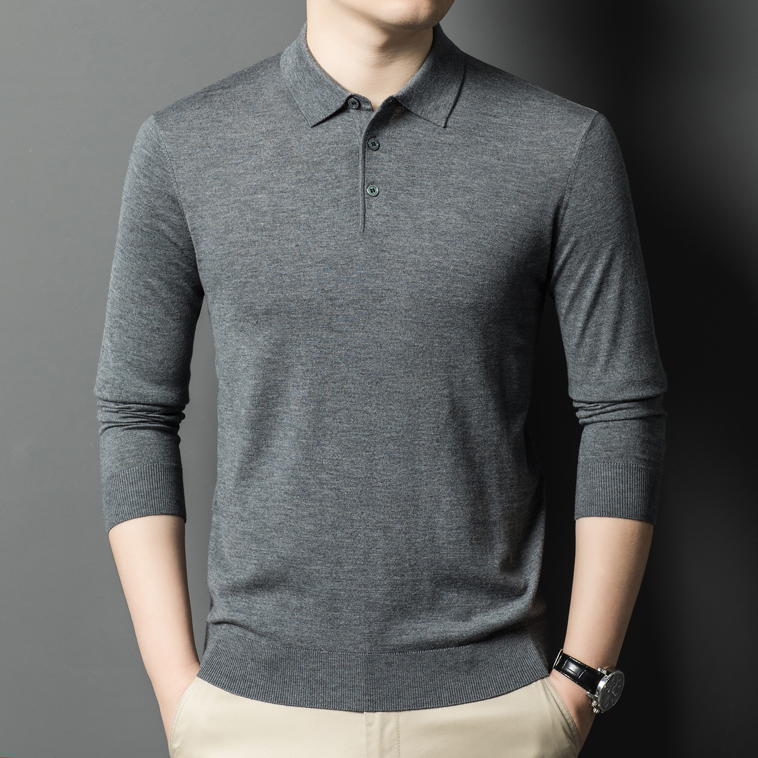 새로운 고급 단색 뽕나무 실크 울 스웨터 남성 중년 가을과 겨울 옷깃 조커 남성 폴로 셔츠 도매스토어 가기