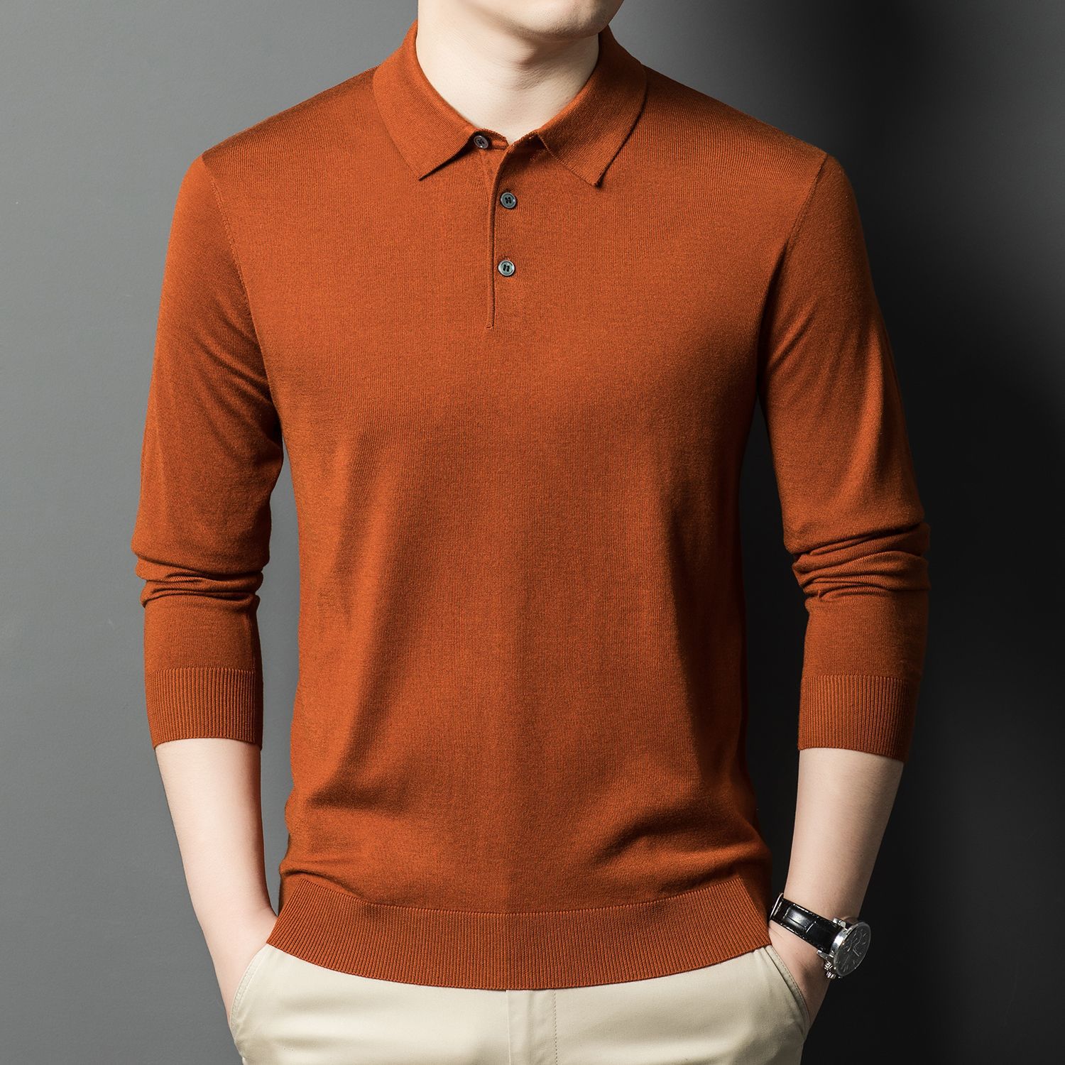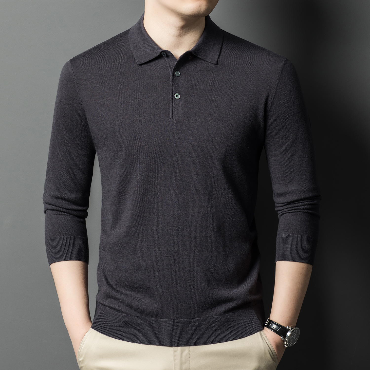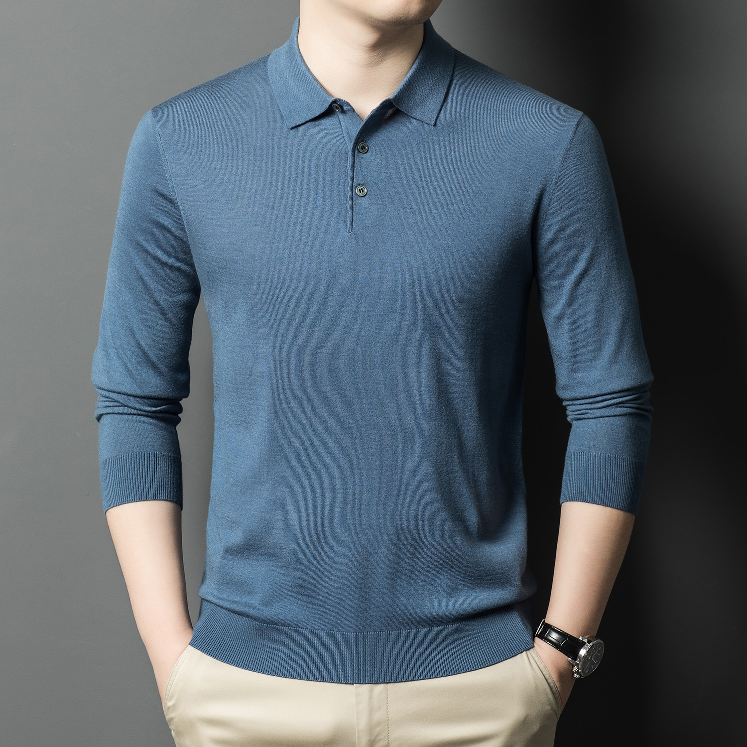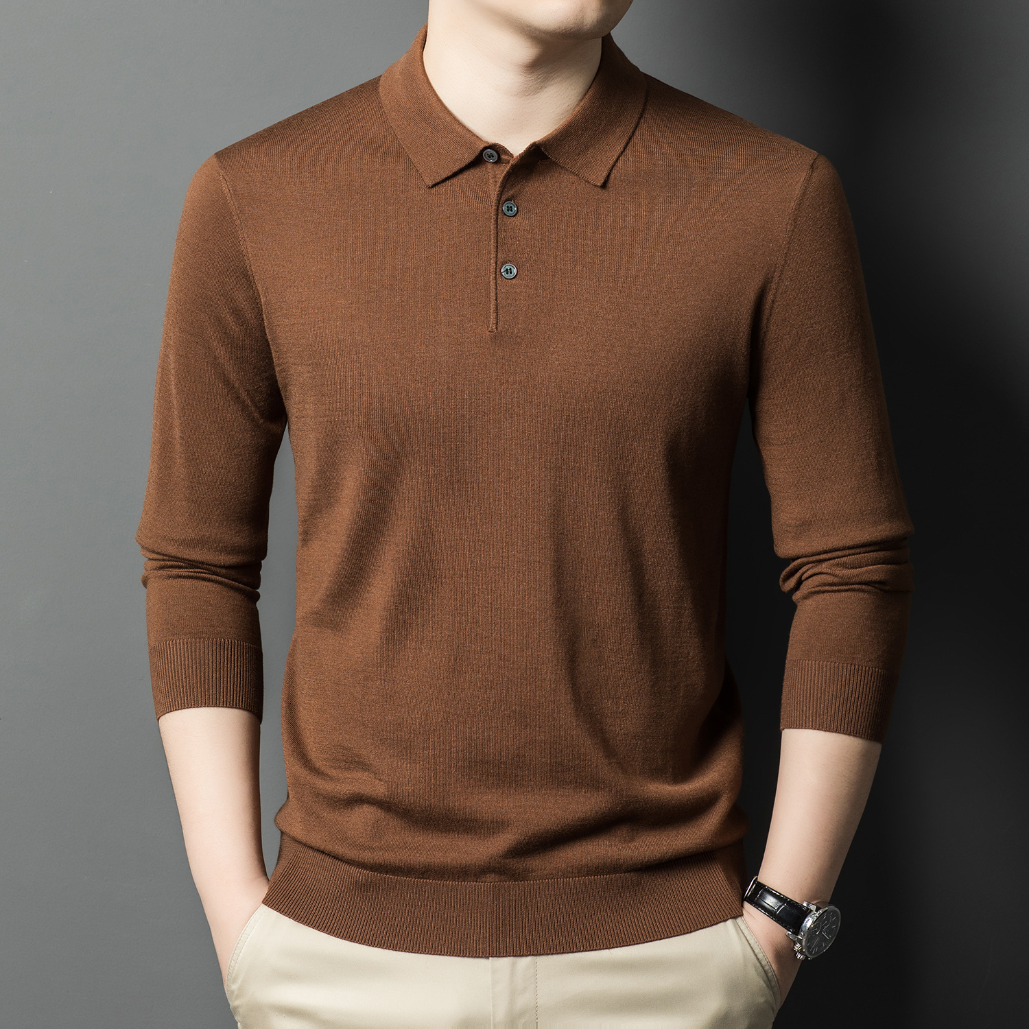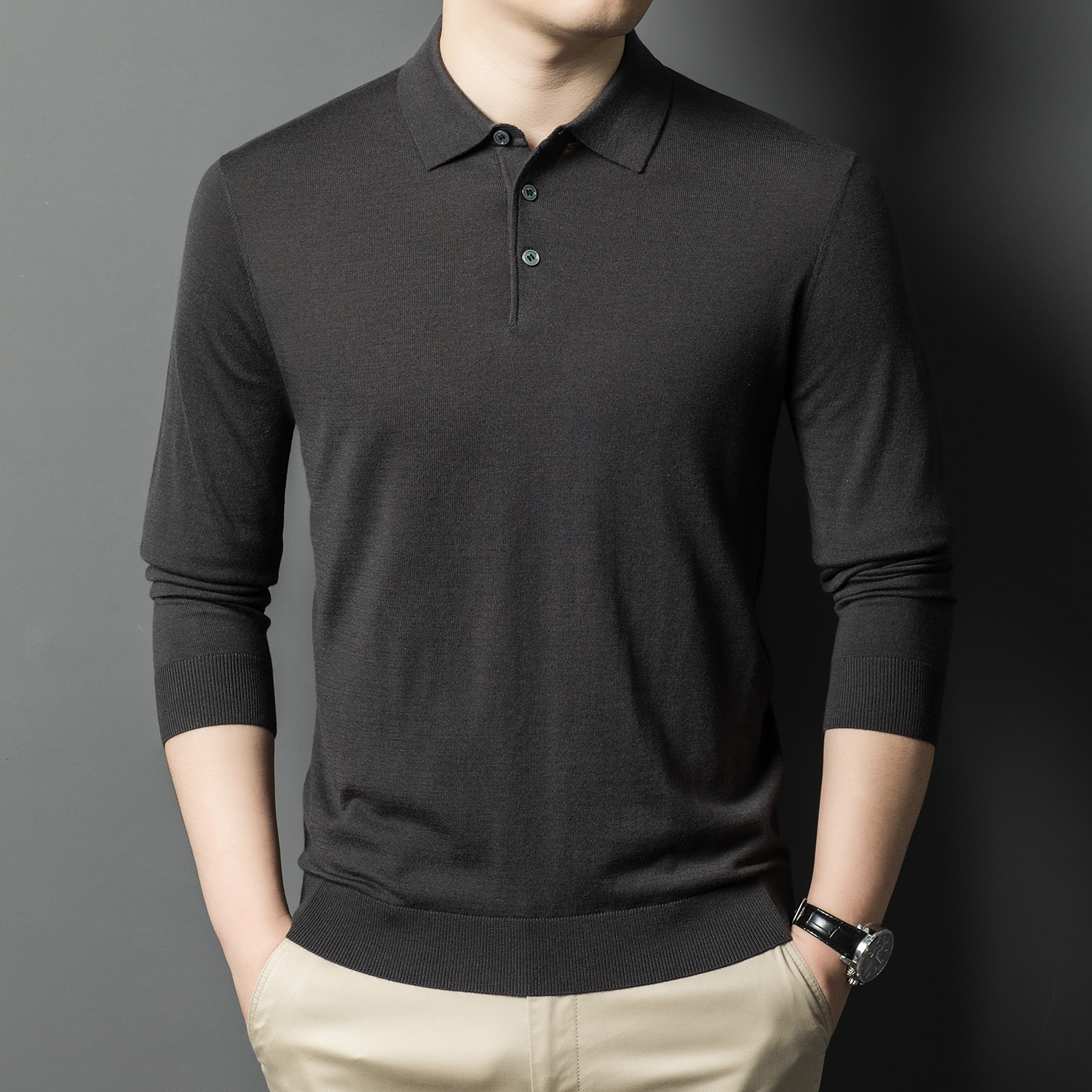 새로운 고급 단색 뽕나무 실크 울 스웨터 남성 중년 가을과 겨울 옷깃 조커 남성 폴로 셔츠 도매스토어 가기
