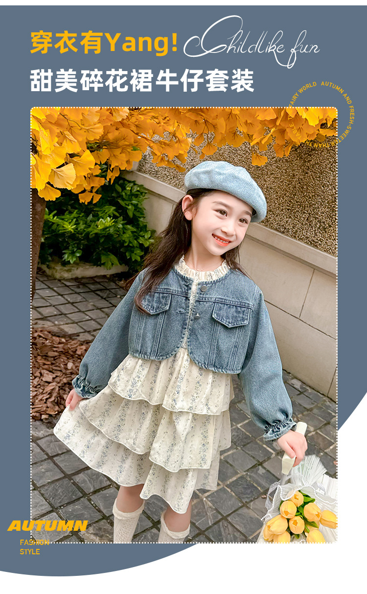소녀 세트 2024 새로운 패션 어린 소녀 꽃 원피스 데님 세트 어린이 투피스 세트스토어 가기